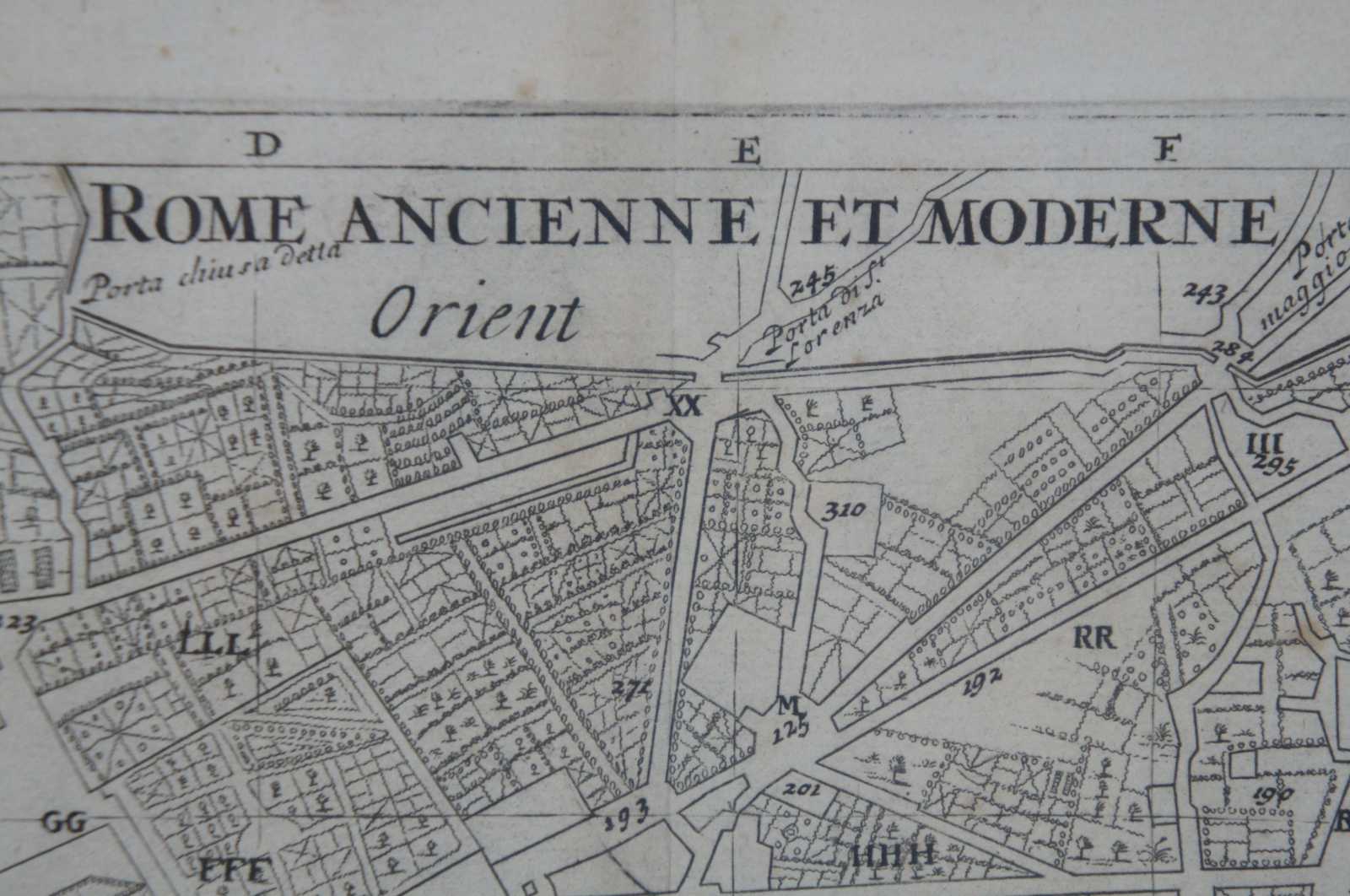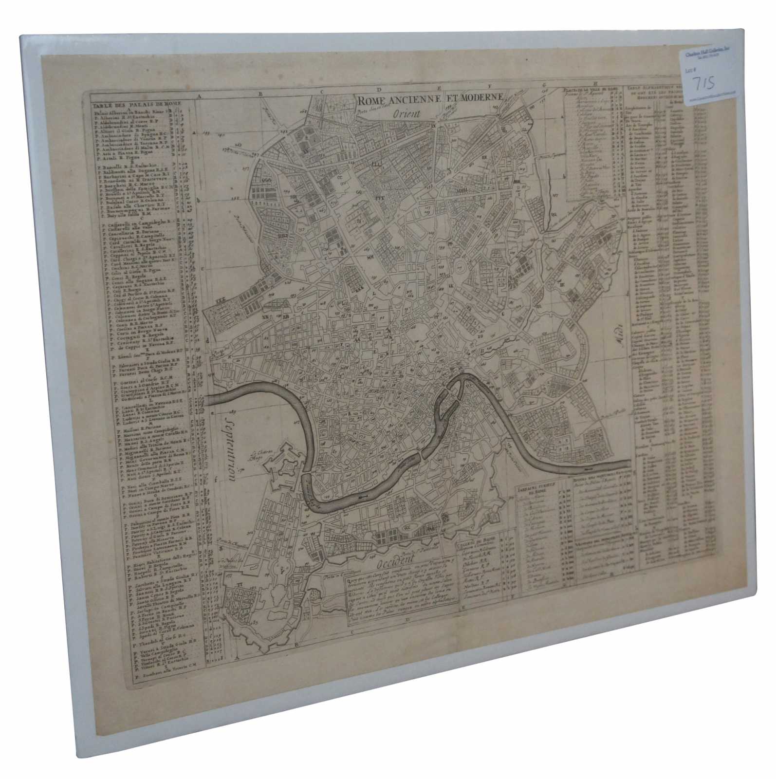 Antique print, titled: 'Rome Ancienne et Moderne.' - This handsome plan of Rome shows the streets, parks, major buildings and the fortifications and ramparts in the southern part of the city below the river. Numerous tables keyed to the map name hundreds of palaces, colleges, gardens, ancient ruins and monuments and other important buildings. Eighteen formal gardens are listed. Engraving on hand laid paper. Description: Atlas Historique.' (Historic Atlas.), Published by Zacharie Chatelain, Amsterdam. The atlas was published in seven volumes between 1705 and 1720, with a second edition appearing in 1732. The maps were accompanied by information pertaining to cosmography, geography, history, chronology, genealogy, topography, heraldry, and costumes of the world. The maps in the Atlas Historique were mainly based on those of the French cartographer, Guillaume De L'Isle, but were presented by the Chatelains in an encyclopaedic form.