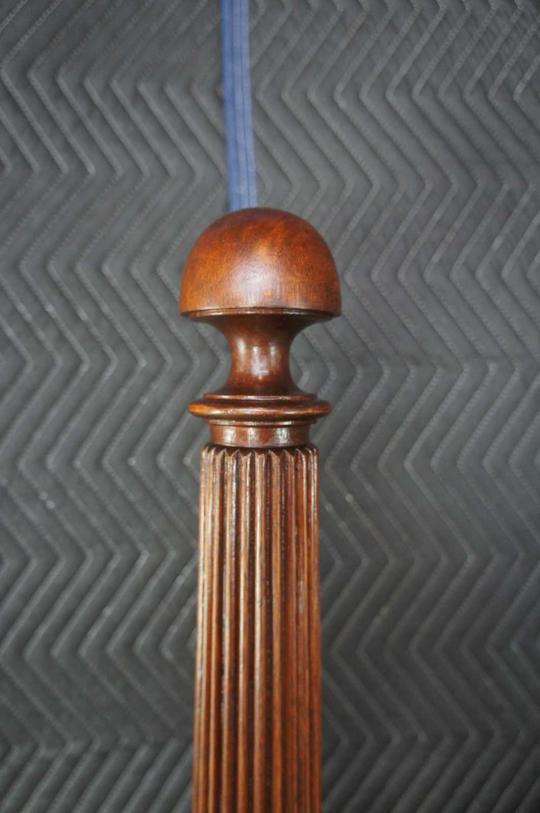 Exceptional Georgian era mahogany poster bed. Features flamed mahogany panels, an open pediment with trophy form, and four tapered and fluted posters. Fits a full size matress.