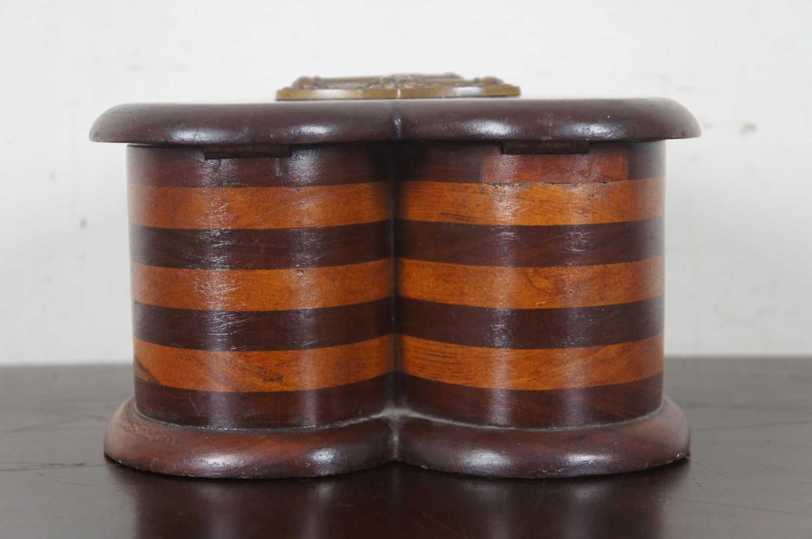 Antique 19th century mahogany heart shaped folk art jewelry or trinket box. Features US artillery field navy crest with two cannons crossing over a shield American flag. Base features alternating tones of wood banding. Plaque is bronze. Valentines Day / lovers.