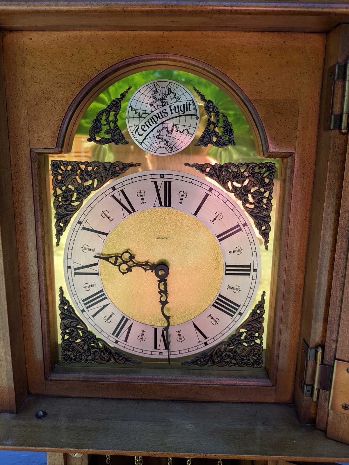 Circa 1980s Grandfather Clock by Emperor Clock Company with JauchGerman Works. Distressed walnut case with open pediment and turned spindle design. Features a gold face framed in figural filigree medallions with Tempus Fugit Globe emblem along the top.