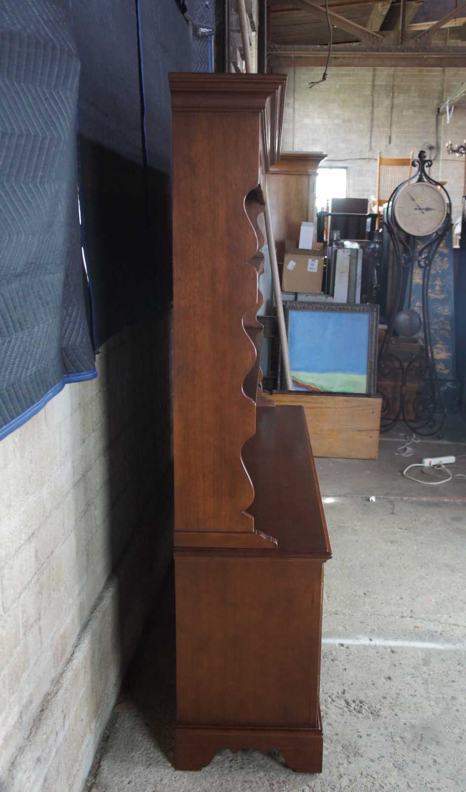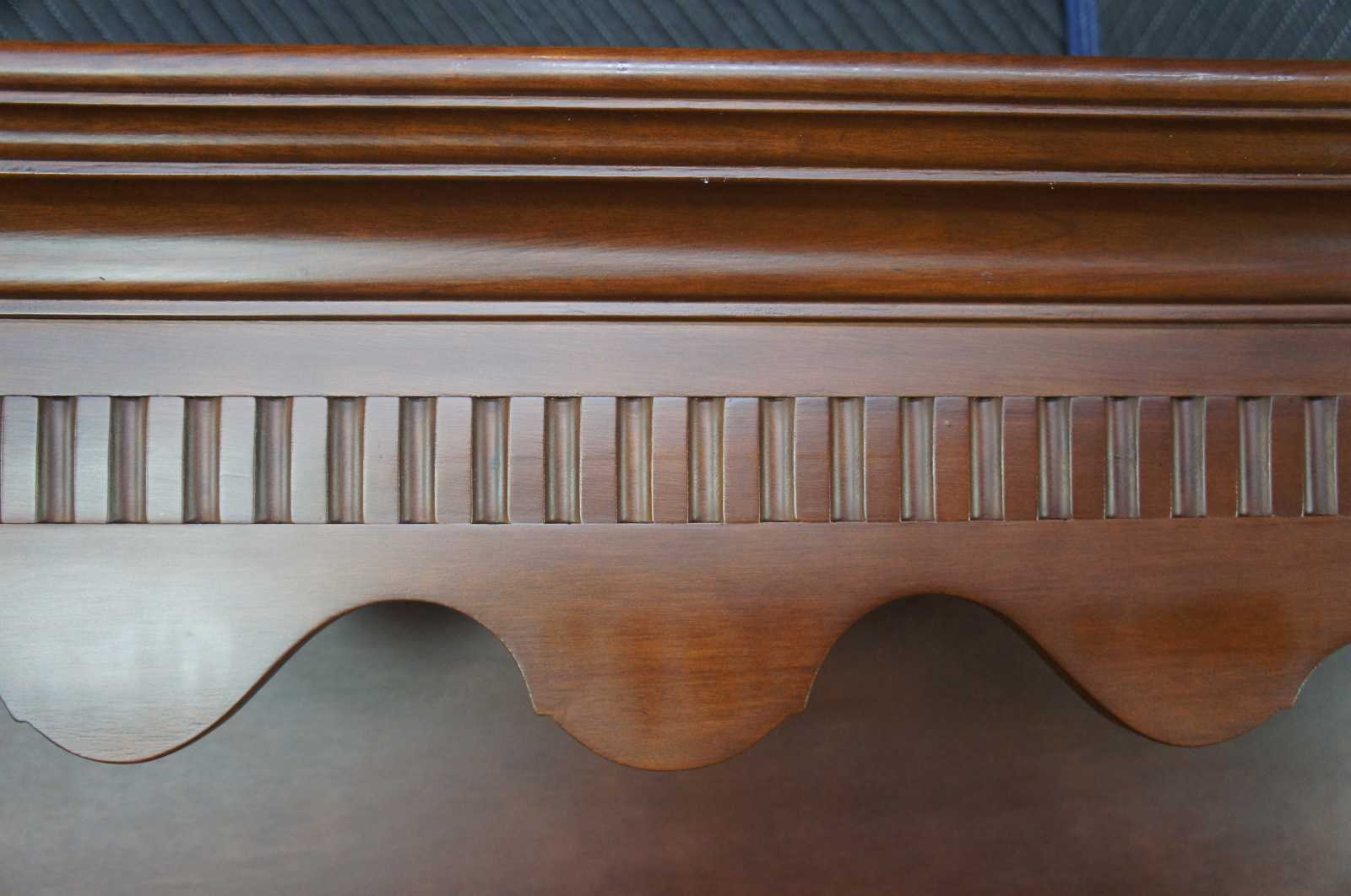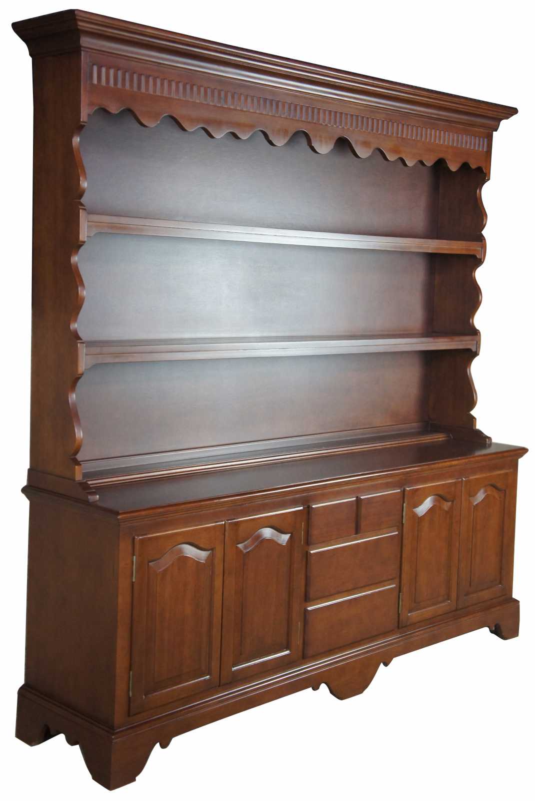 Early American style mahogany sideboard with hutch. Features a serpentine design with three shelves including plate grooves. Opens to three drawers and two outter cabinets for china storage. Hand made circa late 20th century.