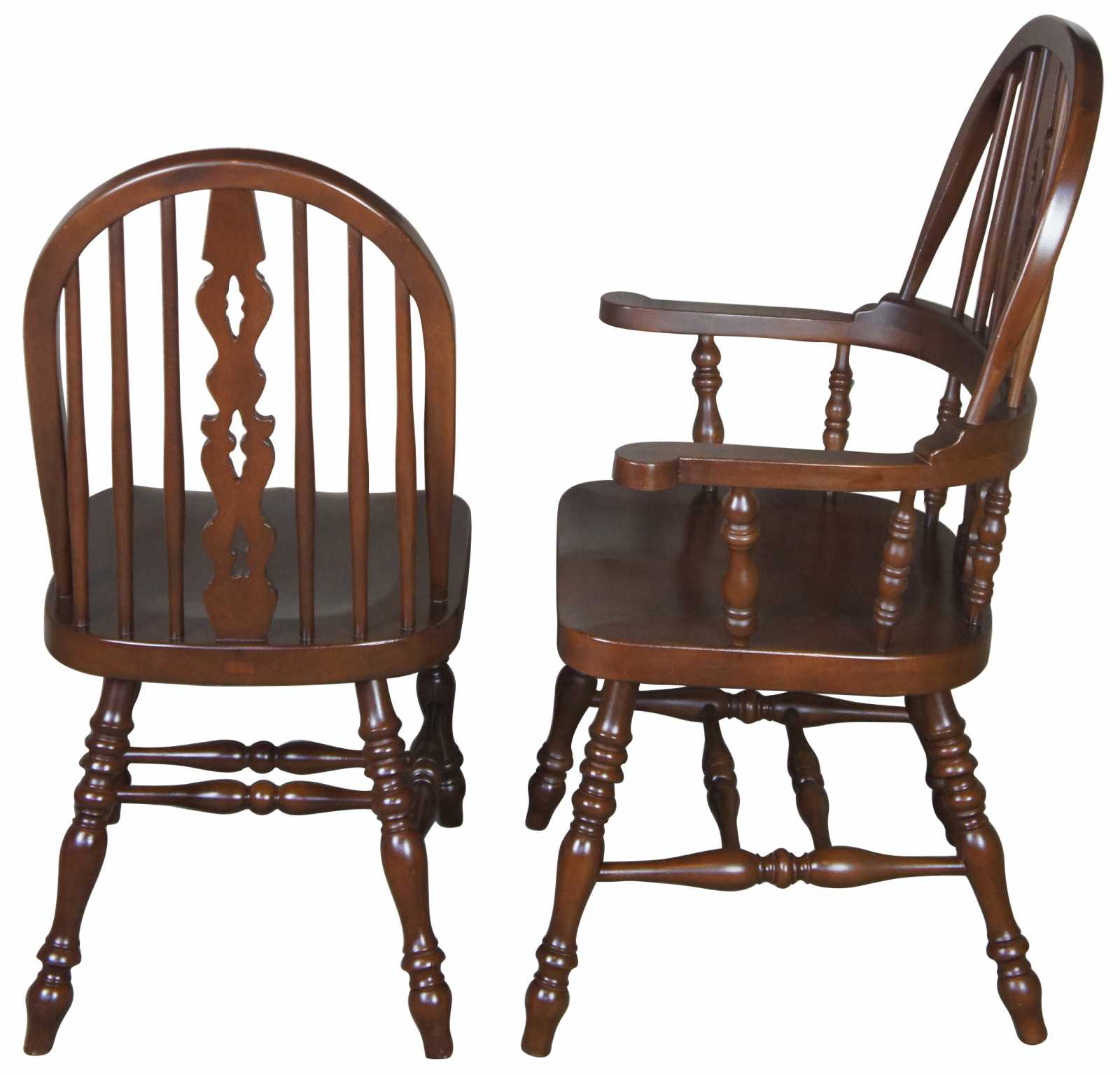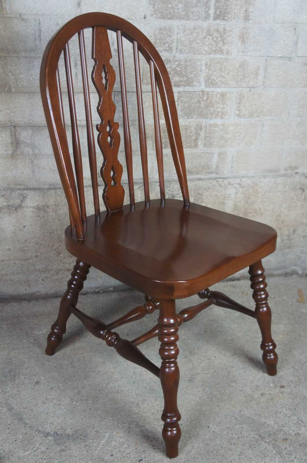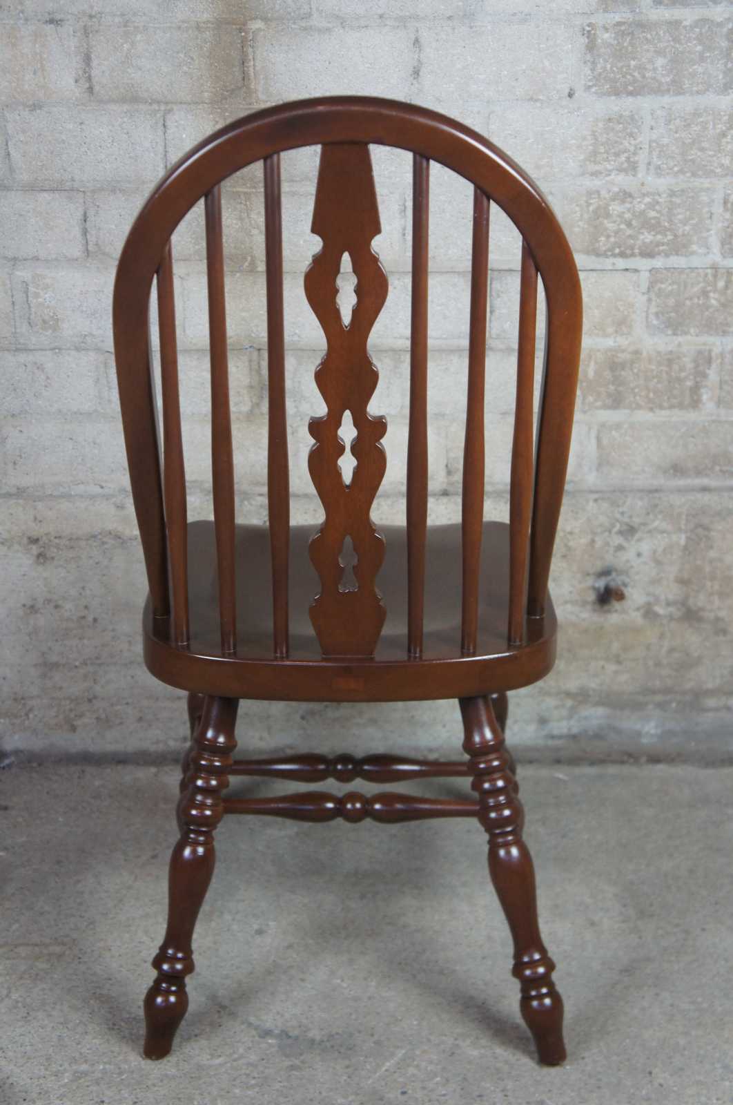 Set of eight solid mahogany English Windsor style spindle back dining chairs. Modeled after Ethan Allen Royal Charter Windsor collection, very heavy.