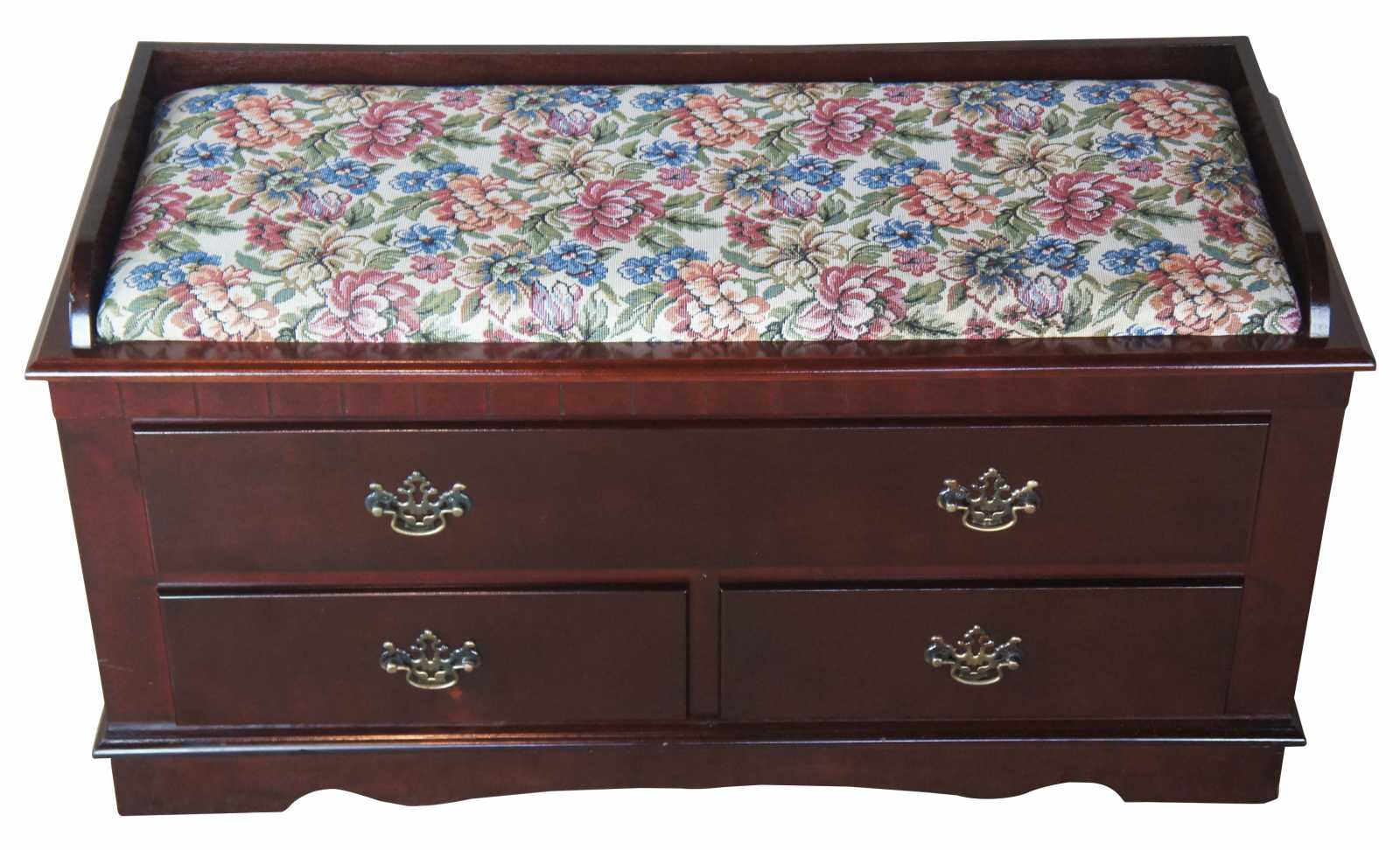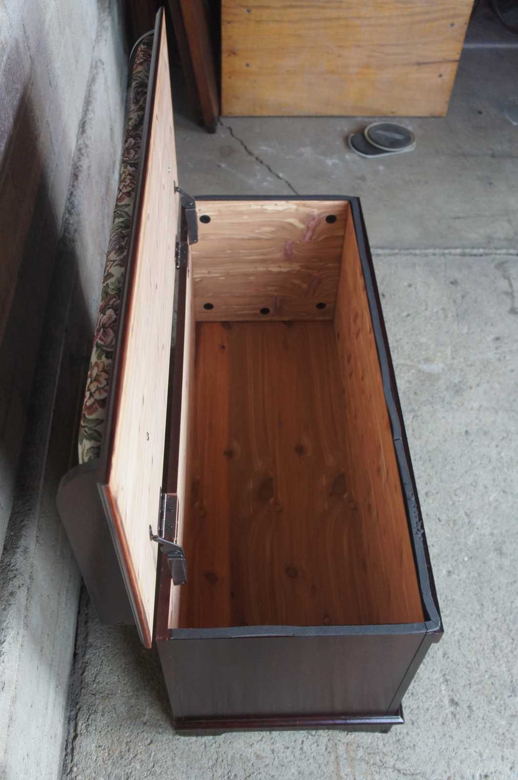 Traditional style blanket chest and bench. Features a floral upholstered seat, opening to cedar lined trunk.