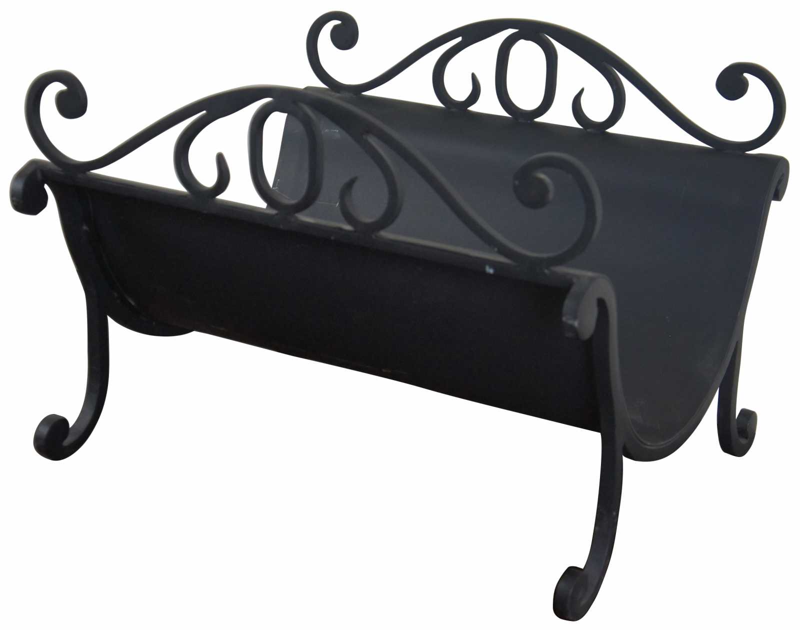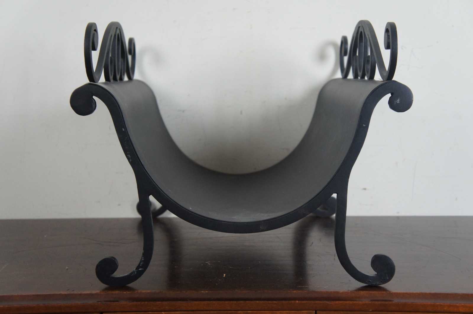 Vintage curved iron log holder. Finished in black with scrolled accents.