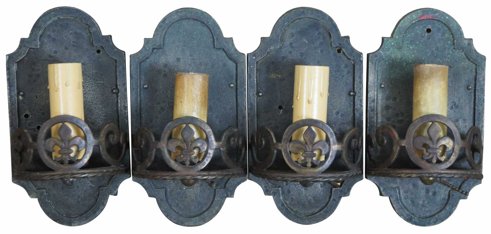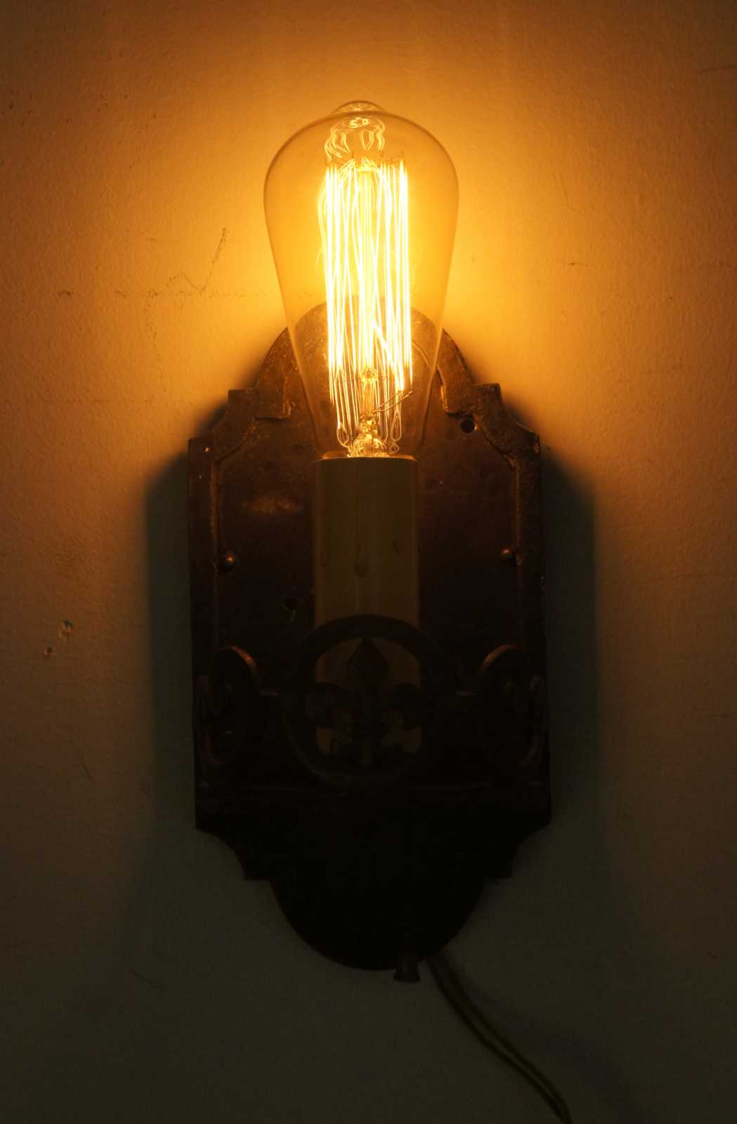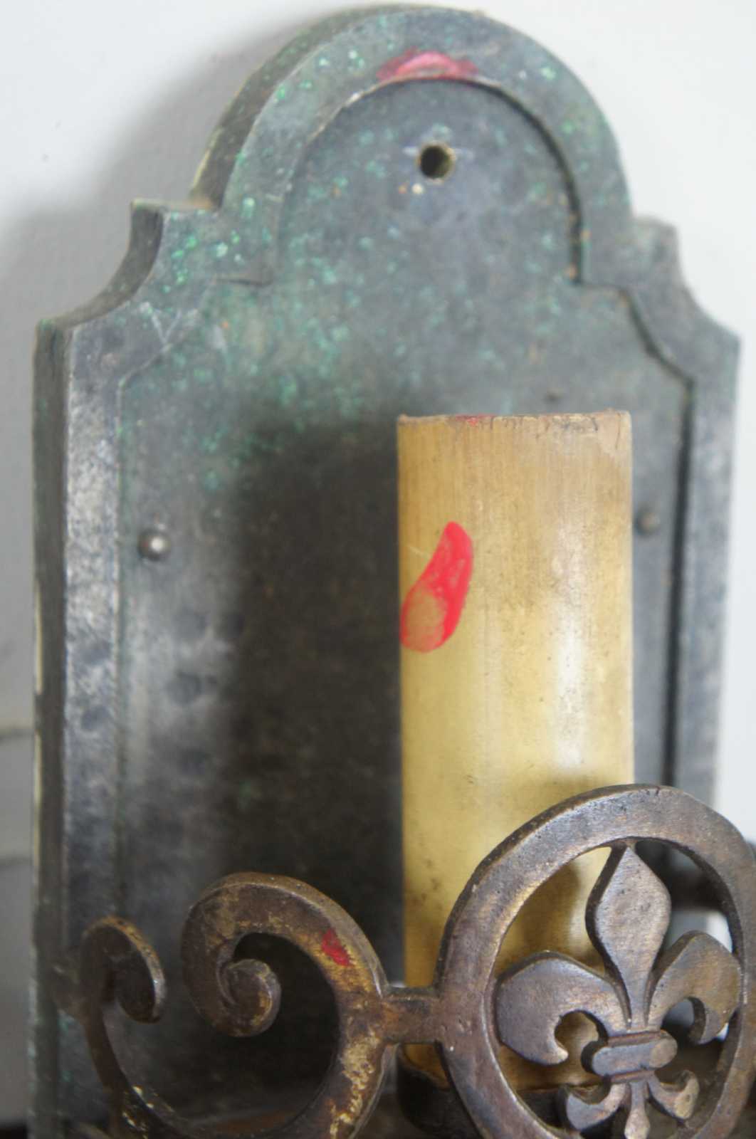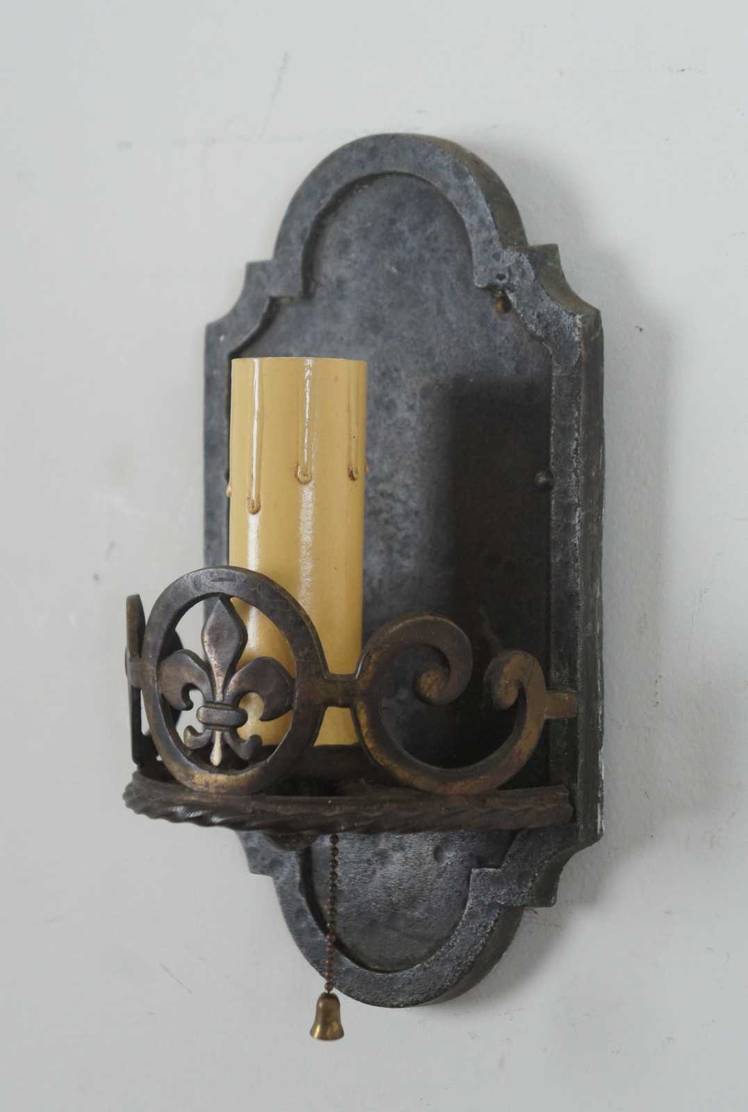 Antique early 20th century hammered iron sconce with fleur de lis scroll work and twisted iron accent. Includes candle cover and pull switch. Comes from one of the first homes built in Oakwood, Ohio by Harry I Schenck.
