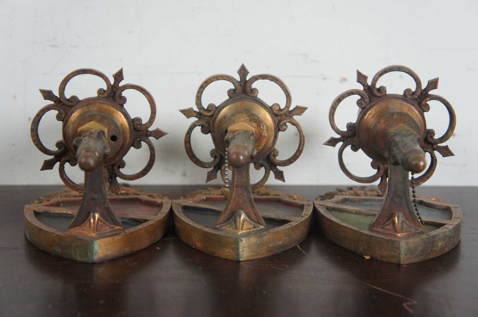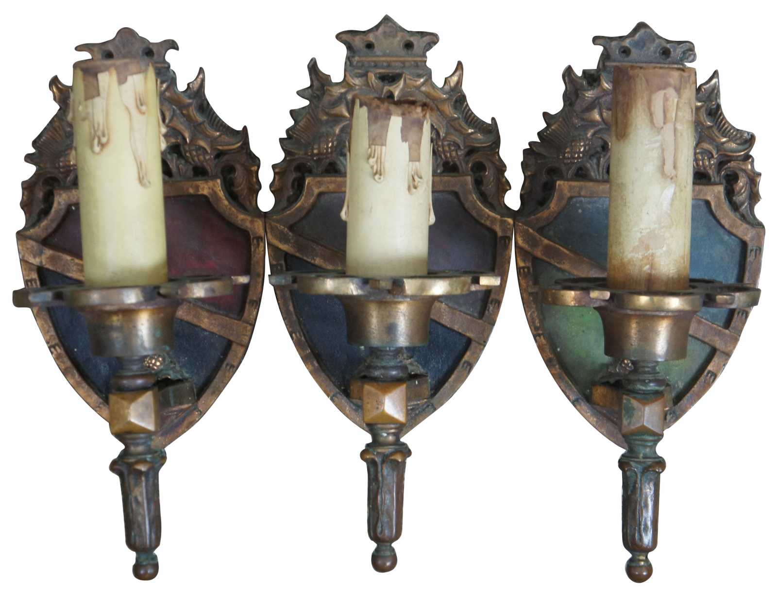 Three early 20th century sheild back sconces. The perfect edition for any early 20th century period home. Features a colorful sheild back with ornate pierced crown, candlestick covers and a thistle accents. Comes from one of the first homes built in Oakwood, Ohio by Harry I Schenck.