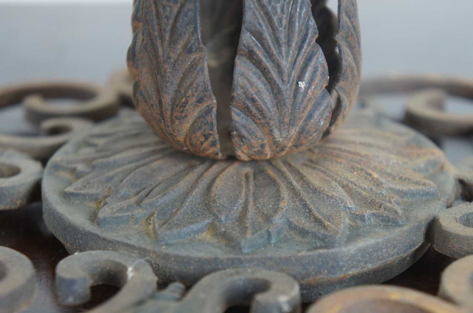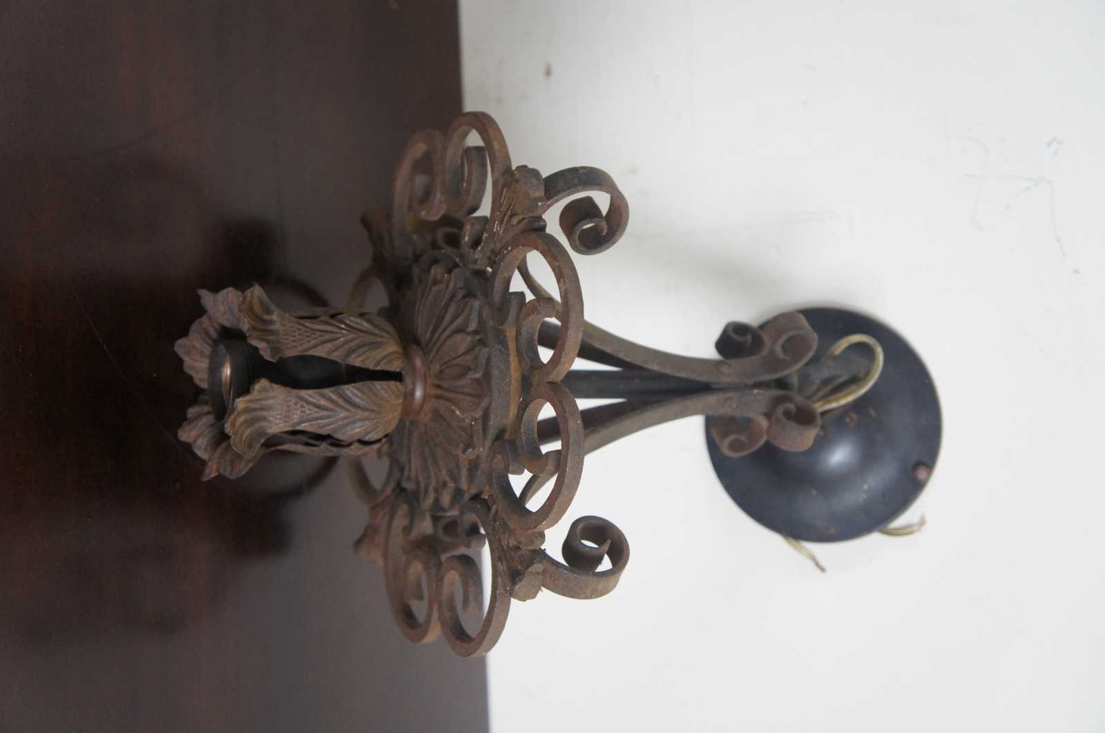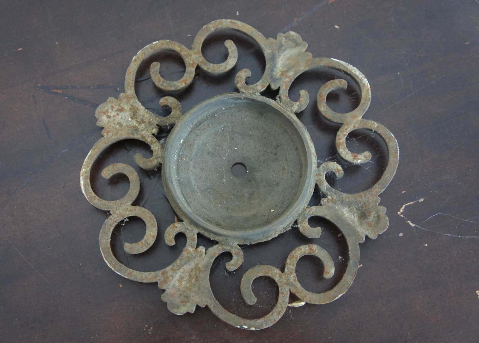 Pair of two cast iron medallion pendant ceiling light mounts or brackets. These are intended to be mounted to a ceiling with fixture installed within. Comes from one of the first homes built in Oakwood, Ohio by Harry I Schenck.