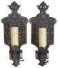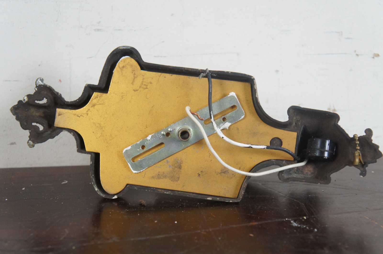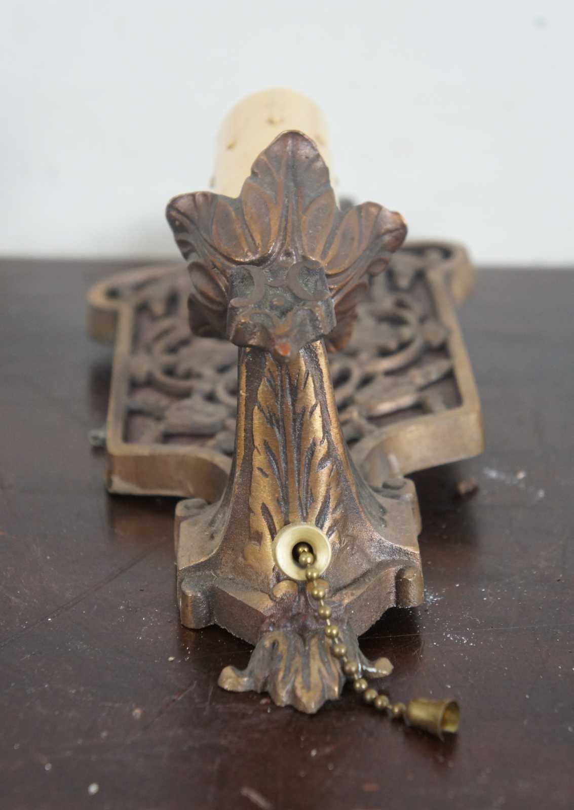 Two antique ornate French bronze candlestick wall sconces. Feature ornate scroll work and design, with pull chain. Comes from one of the first homes built in Oakwood, Ohio by Harry I Schenck.
