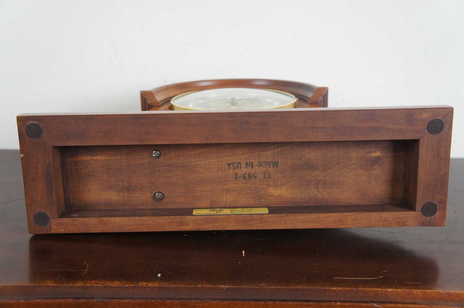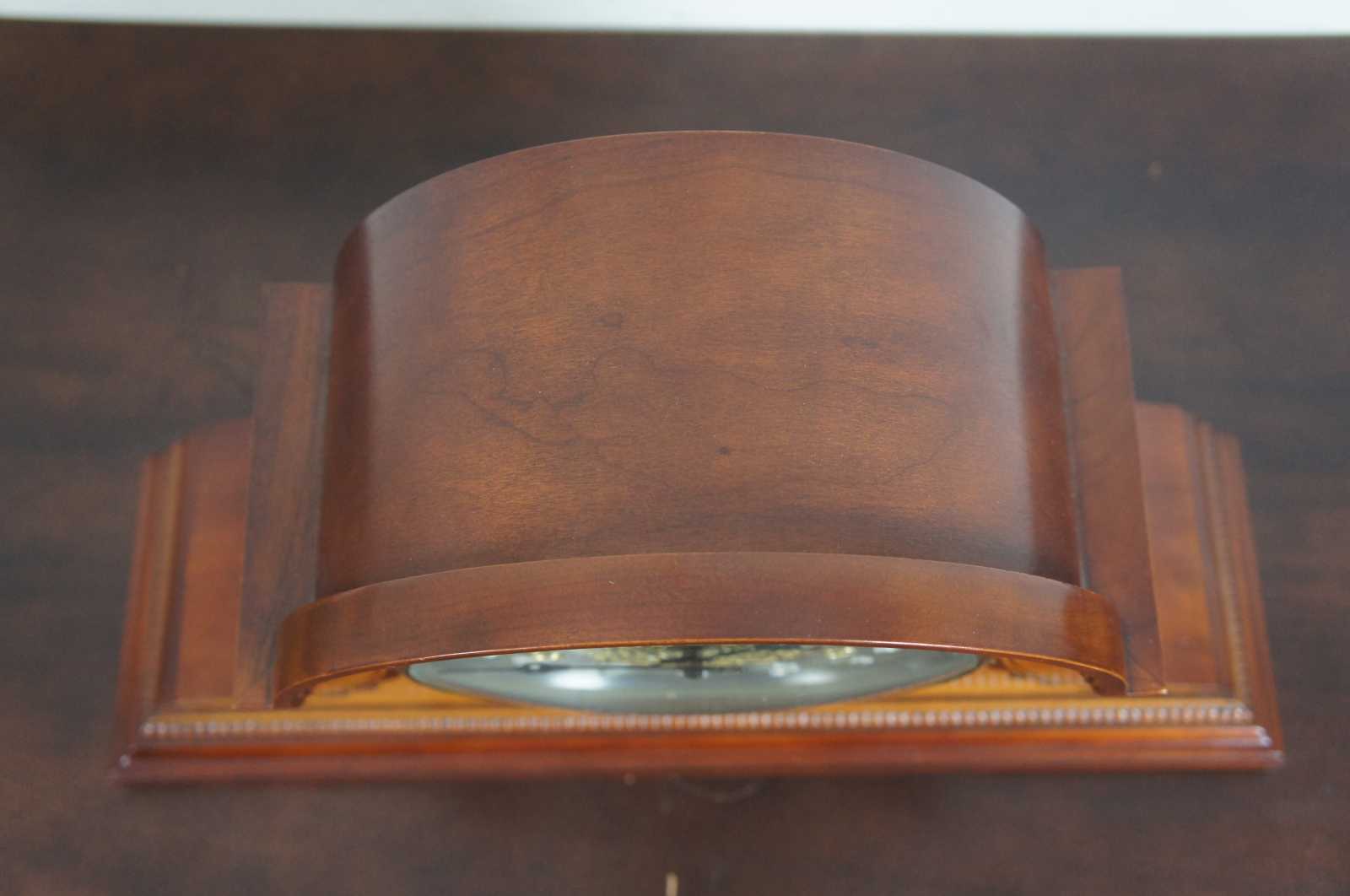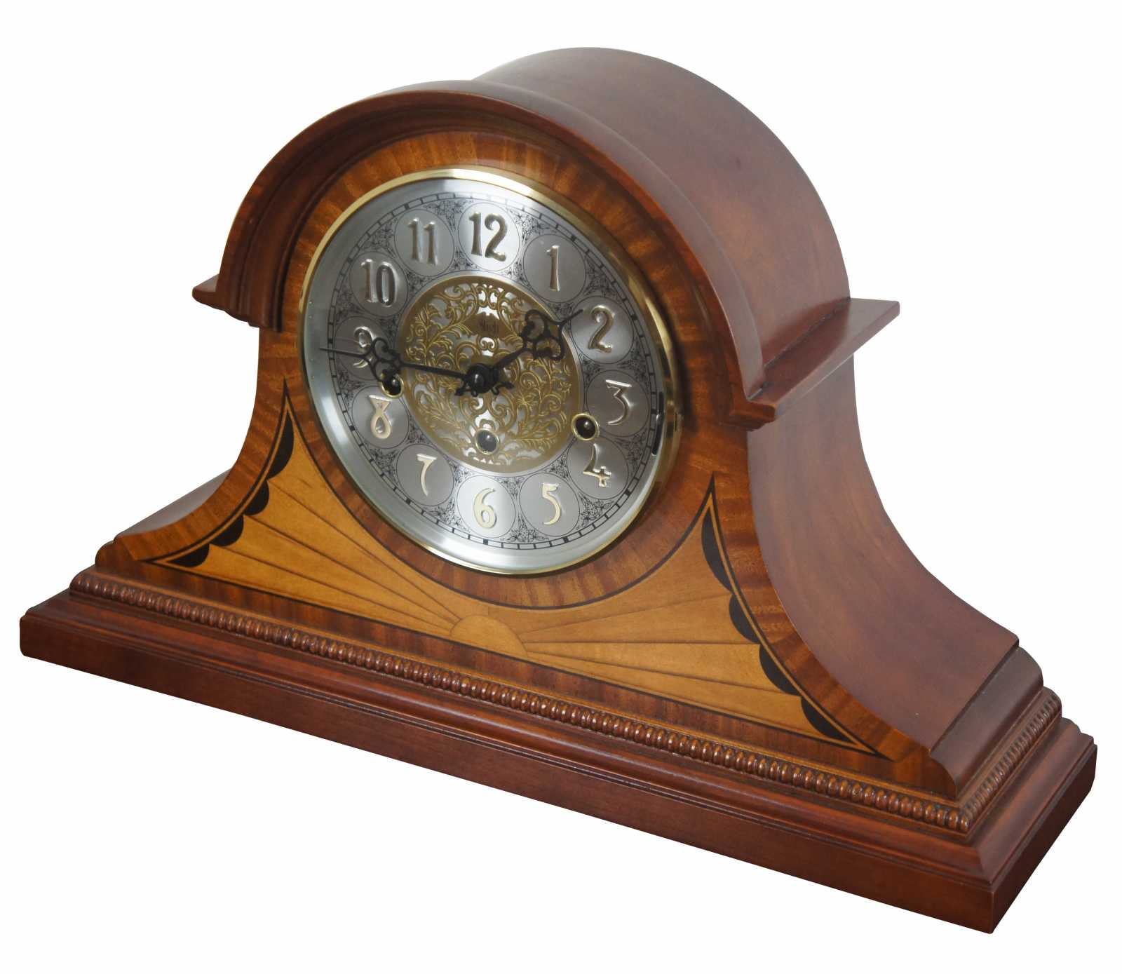 Sligh 'Bergen' 0593-1-CC, Key Wound Triple Chime. Wedges of shaded hard maple inlaid in a fan design create a stunning effect in a richly detailed mantel clock of select solids and cherry veneers. Wraparound beaded molding and an exquisite inlaid border of satinwood play counterpoint to the brass-rimmed hinged dial's lovely etched through brass center ornament and raised numerals. A hinged rear door offers access to the key wound, triple chime Hermle movement with bronzed bushings for durability; selector lever with "silent" option is on face dial." Centurian Cherry finish.