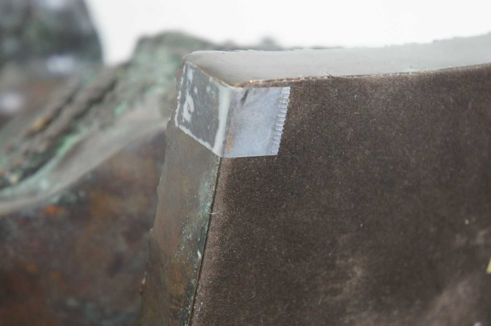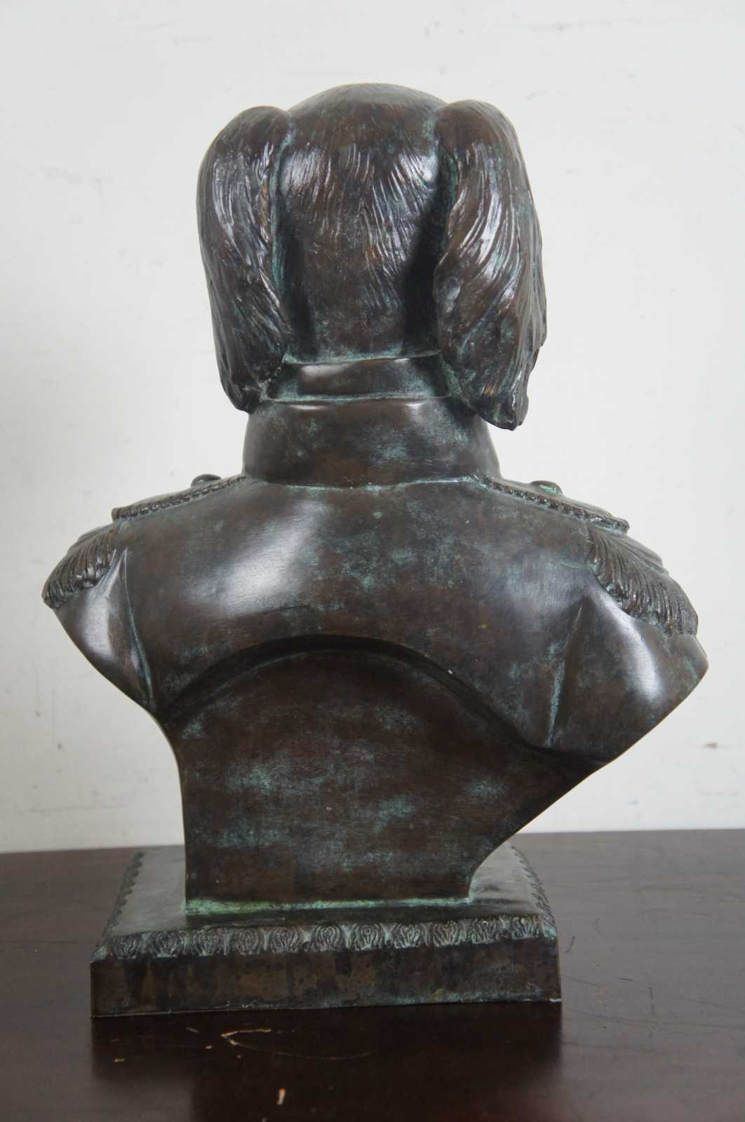 Maitland Smith hollow form bronze dog sculpture dressed like Napoleon. Features the bust of a dog in millitary dress or uniform.