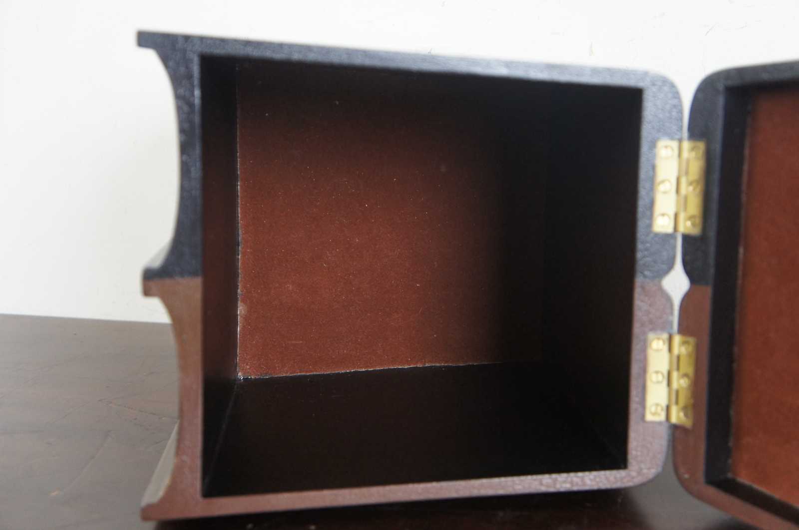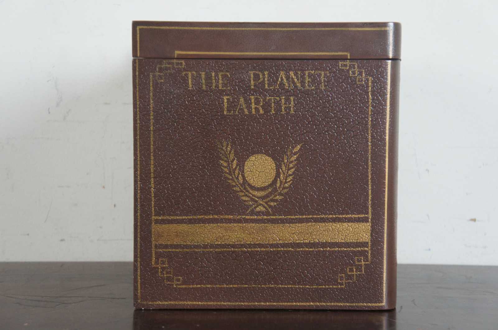 Maitland Smith hand painted leather book box. Features hidden compartment or "false" lid that opens to compartment. Titled: The Planet Earth & The Universe.