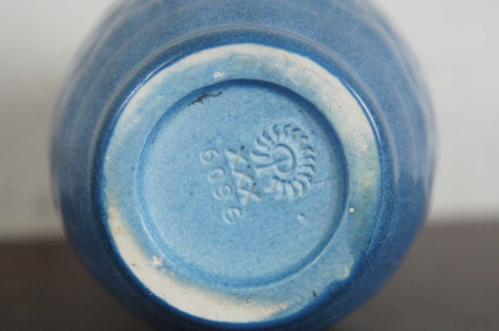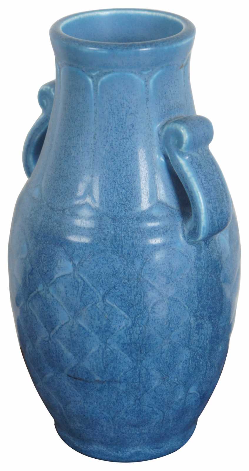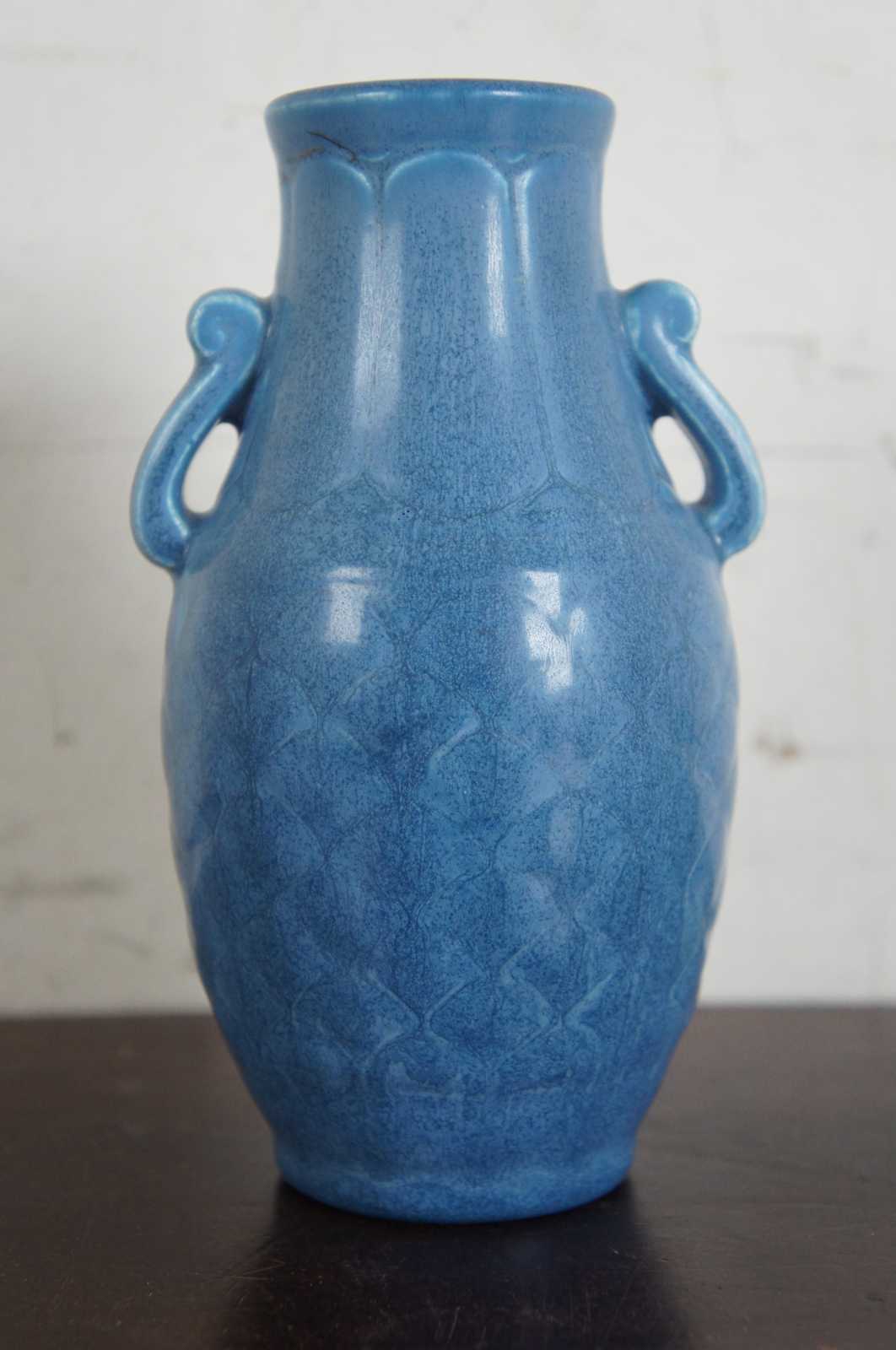 Rookwood Pottery bud vase. Features art deco styling with handles in blue mat. Marked XXX and 6069 on base.