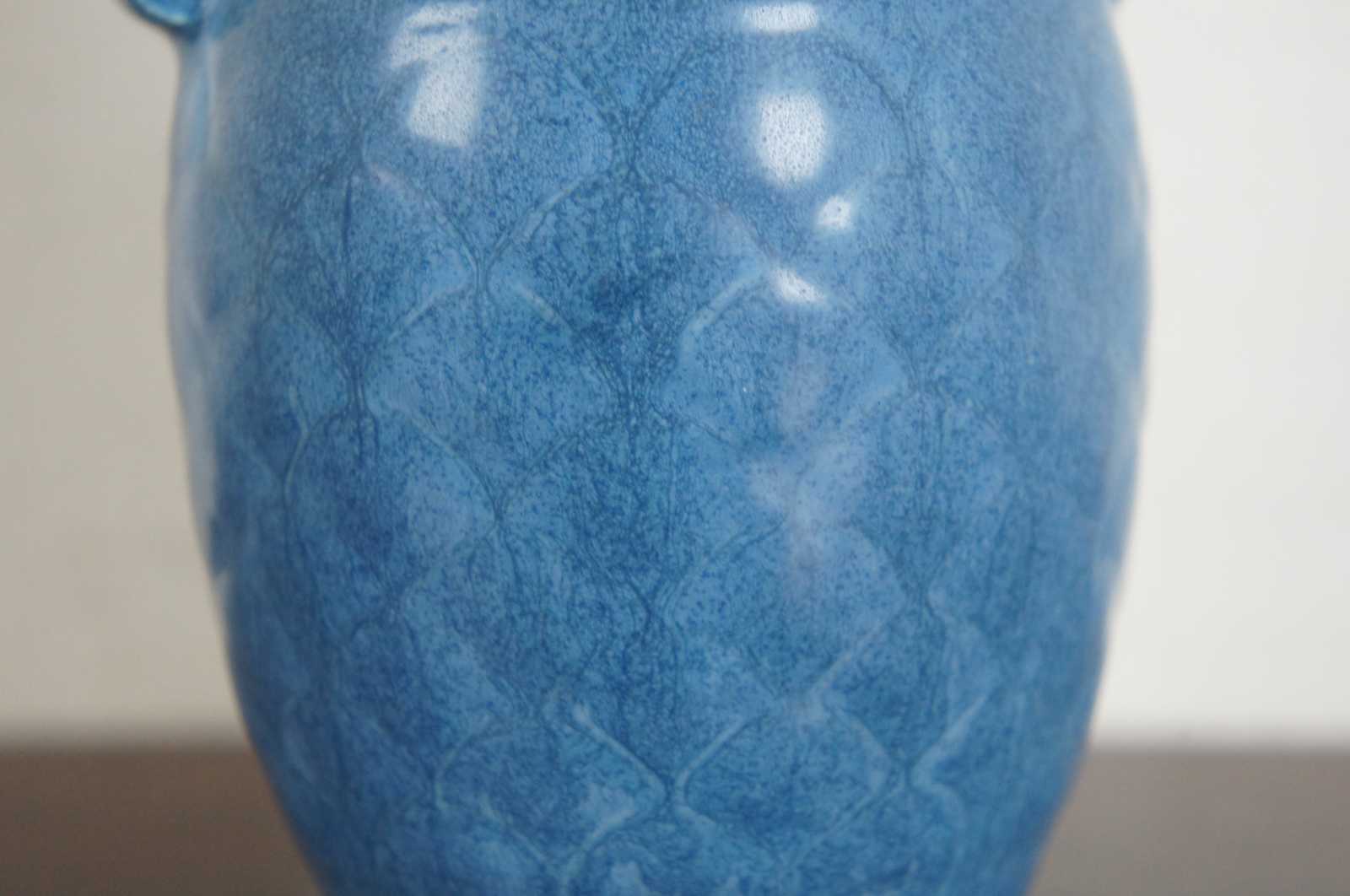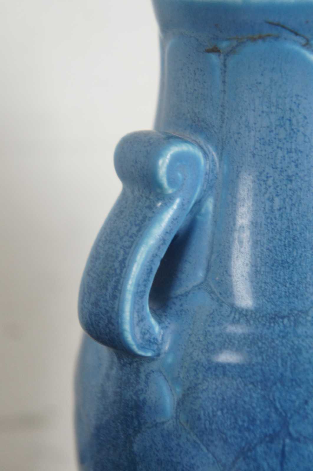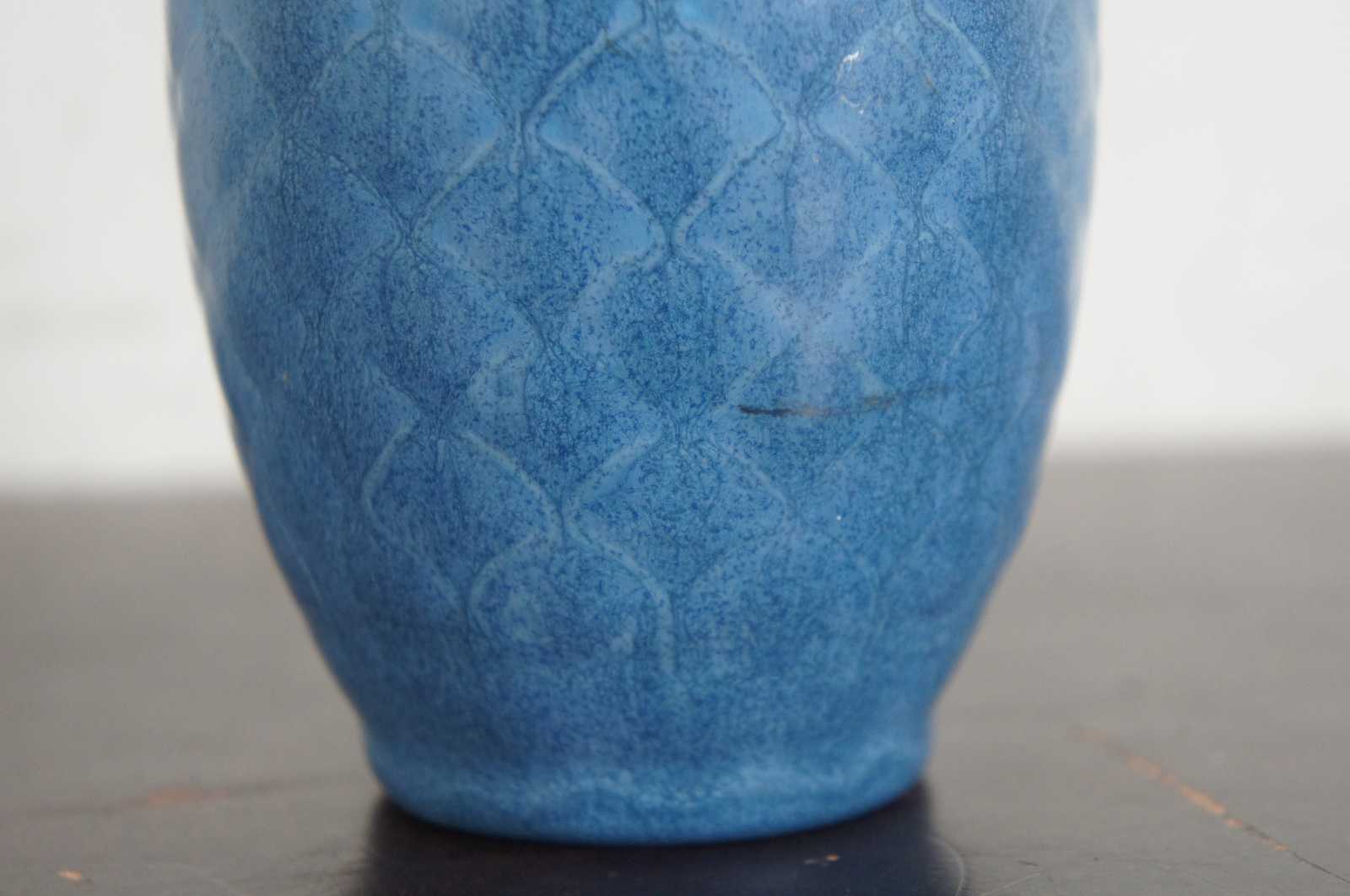 Rookwood Pottery bud vase. Features art deco styling with handles in blue mat. Marked XXX and 6069 on base.