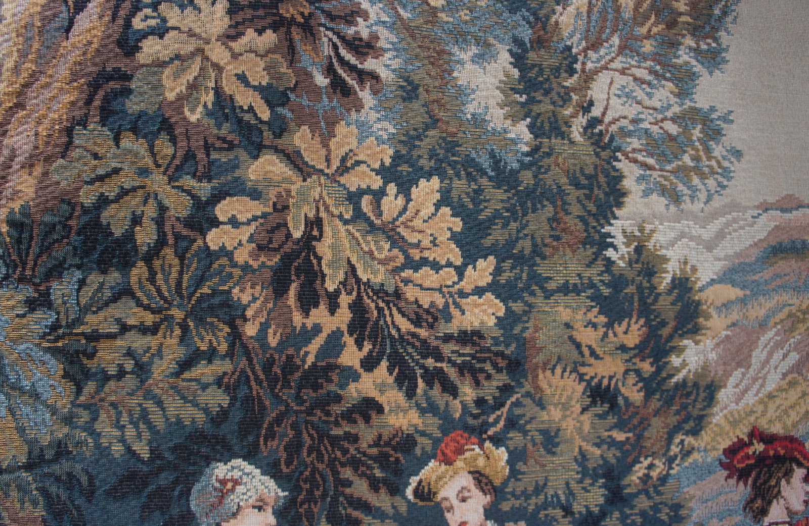 The style of this tapestry reflects the influence of the Renaissance, a period when the art of tapestry became more a copy of painting, with rich wide borders and scenes with great perspective and depth. This beautiful tapestry is woven on a jacquard loom by skilled weavers, keeping alive the centuries old tradition of tapestry manufacturing from generation to generation. This tapestry is fully lined in silk on the backside incorporating a sleeve along the top for hanging.