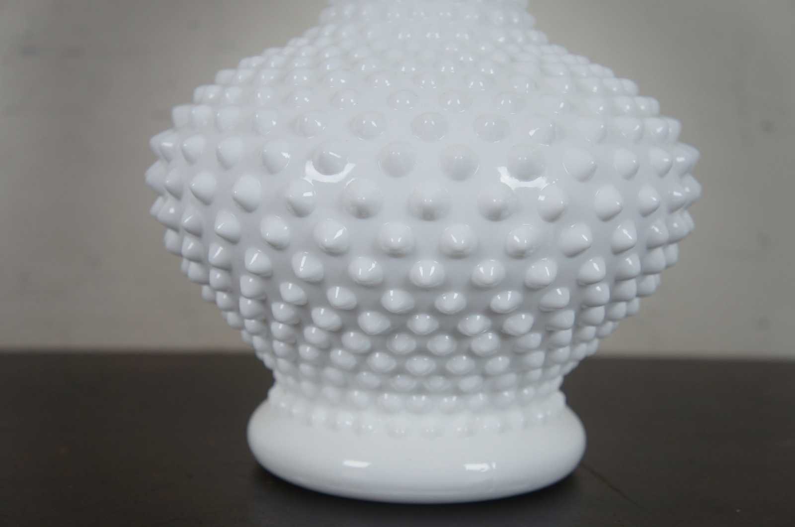 Vintage Fenton milk glass vase. Features hobnail pattern and freeform ruffled or crimped lip. Pattern 3752.