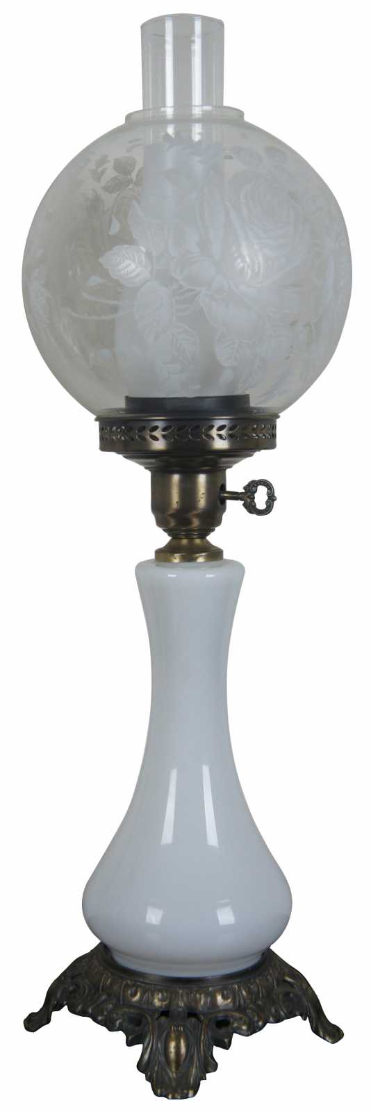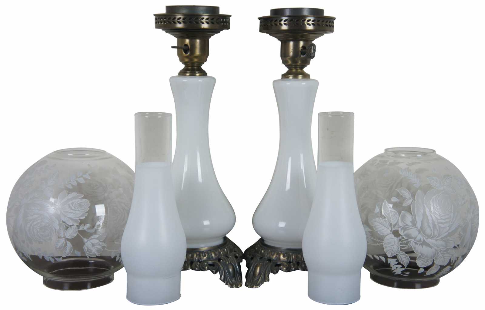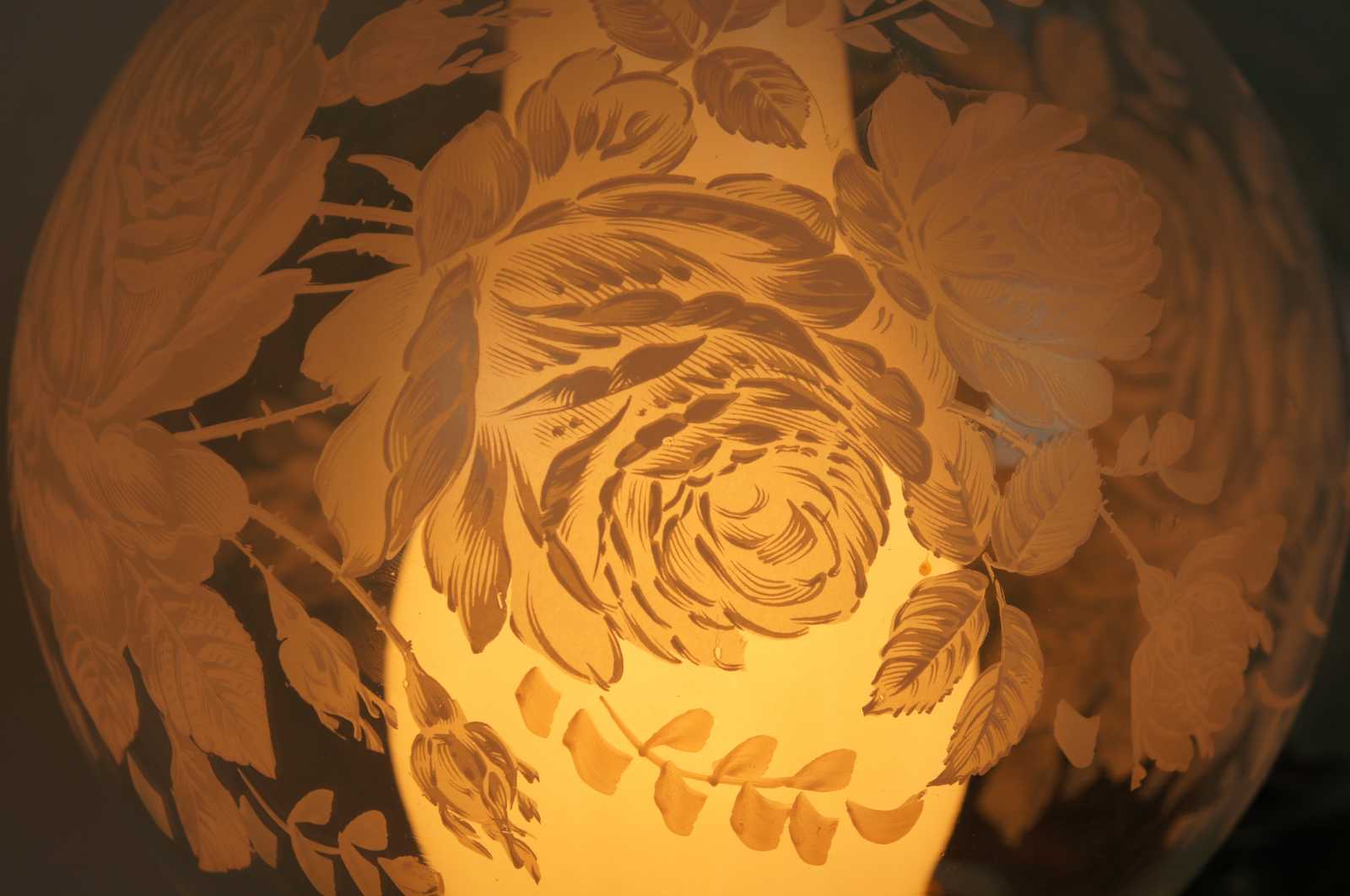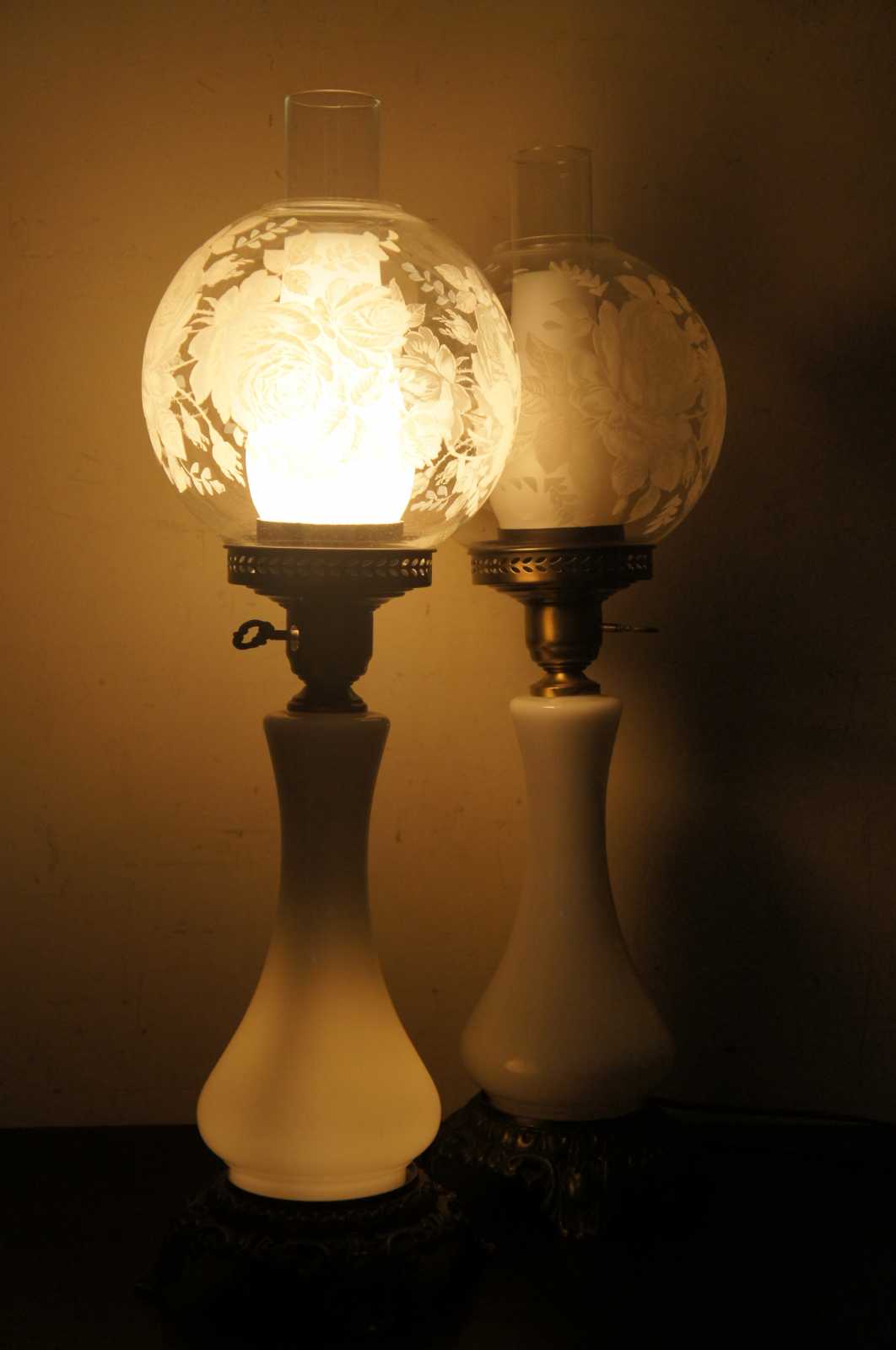 2 Gone with the wind lamps. Each features – Multi-way lights in base and top globe. Glass globes are painted with roses.