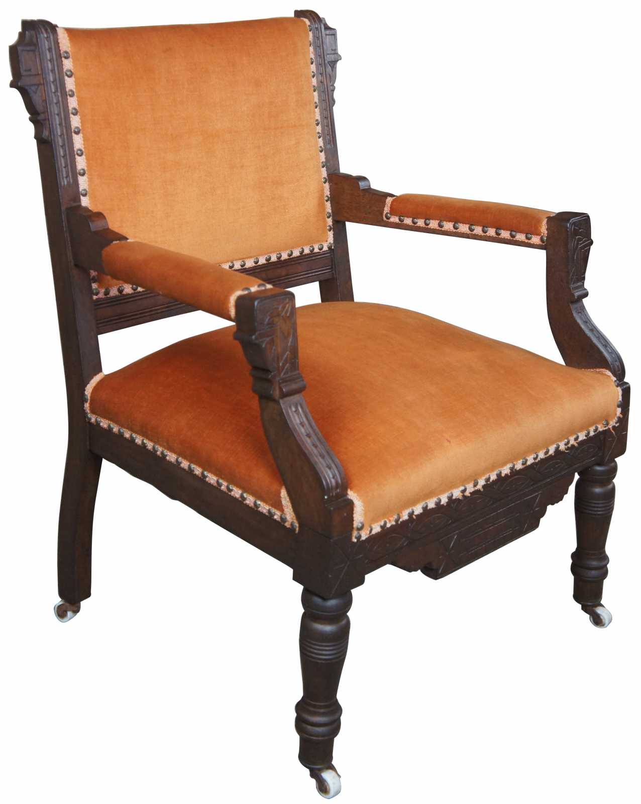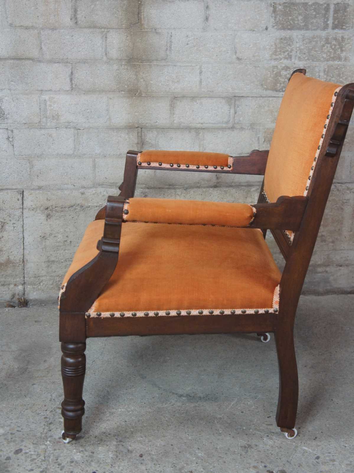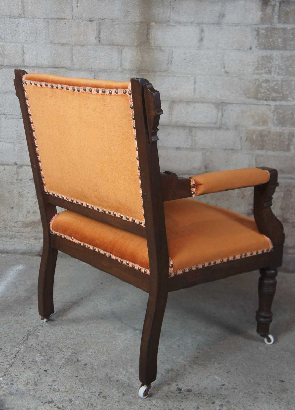 19th century Victorian chair with beautiful eastlake carved accents. Upholstered in peach orange fabric with brass nailhead trim and castors.