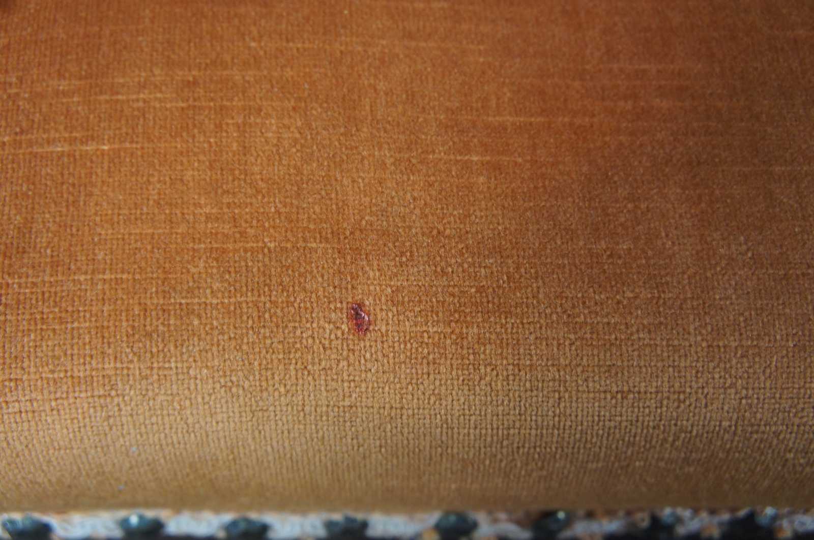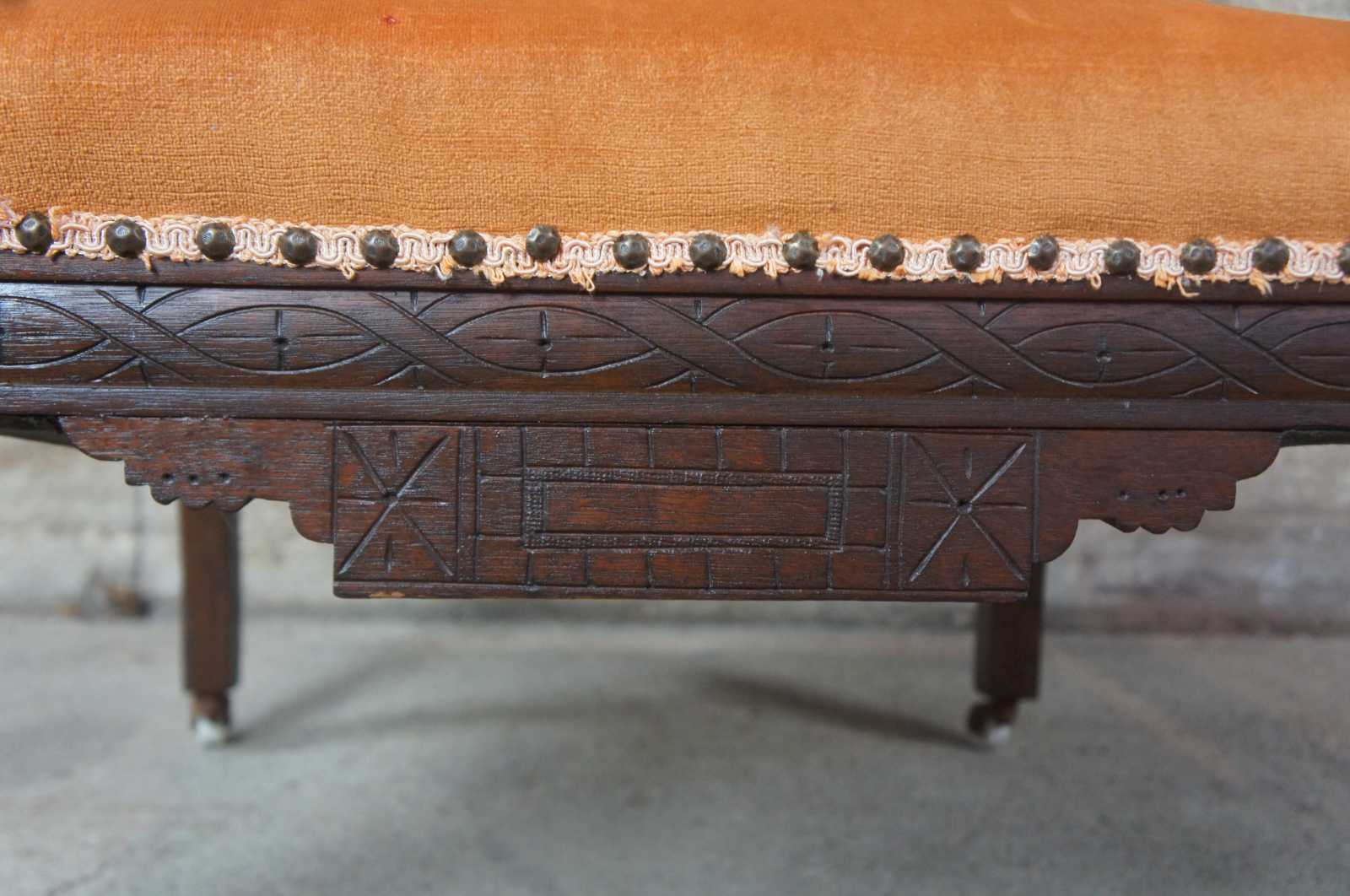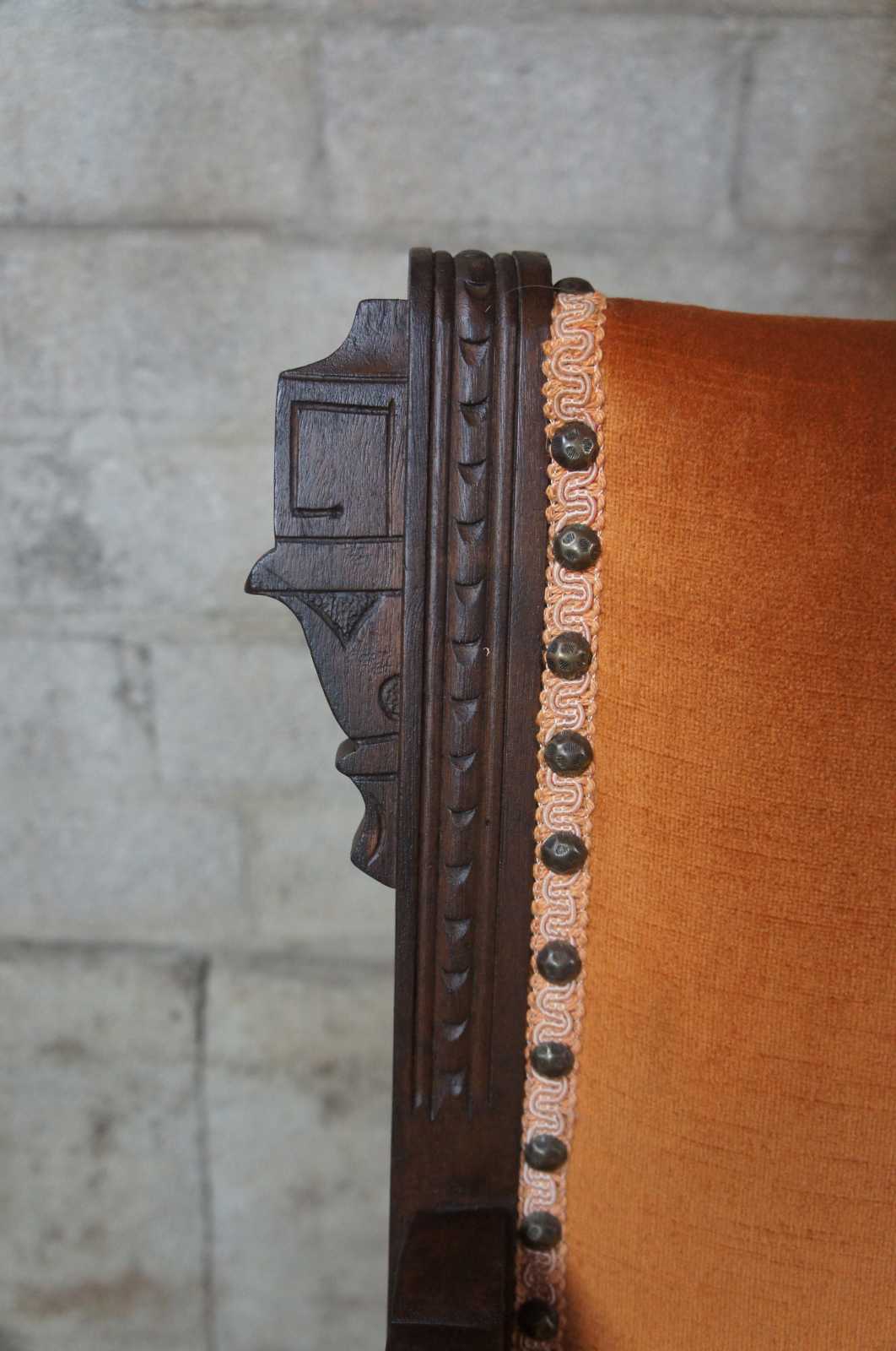 19th century Victorian chair with beautiful eastlake carved accents. Upholstered in peach orange fabric with brass nailhead trim and castors.