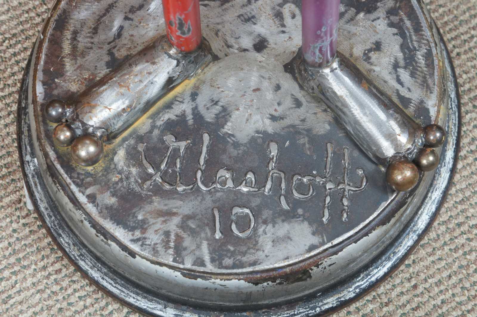Vintage 2010 life size iron sculpture. Aptly titled, Camera Girl. This sculpture was made by world renoune father and son duo Chad & Phillip Glashoff on their ranch in Suisun Valley. World-renown metal sculptors Phillip and Chad Glashoff are based in rustic Suisun Valley, and as you drive through the valley to there Sculpture Ranch, you’ll enjoy seeing their sculpted whimsical mailbox’s dotting the landscape of the beautiful valley. You'll be even more surprised when you arrive at the ranch, with countless sculptures each one unique lining the walkways. Don’t forget the many exotic farms animals grazing in pastures and hills. The artwork so interesting as the landscape is for photographic possibilities, all to inspire the inner artist within.