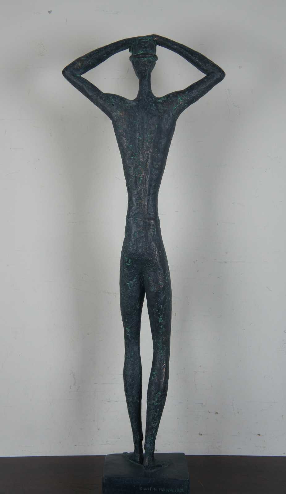 A large mid century modern Austin Productions plaster sculpture after Franc (Dorothy) Epping (American, born 1910). Piece is titled, Man with Hat. It depicts a tall, thin man wearing a hat with his hands resting on his head and is finished in a patinated bronze effect. The sculpture is signed in cast “Epping” and inscribed “Austin Prod Inc 1962” to the base.