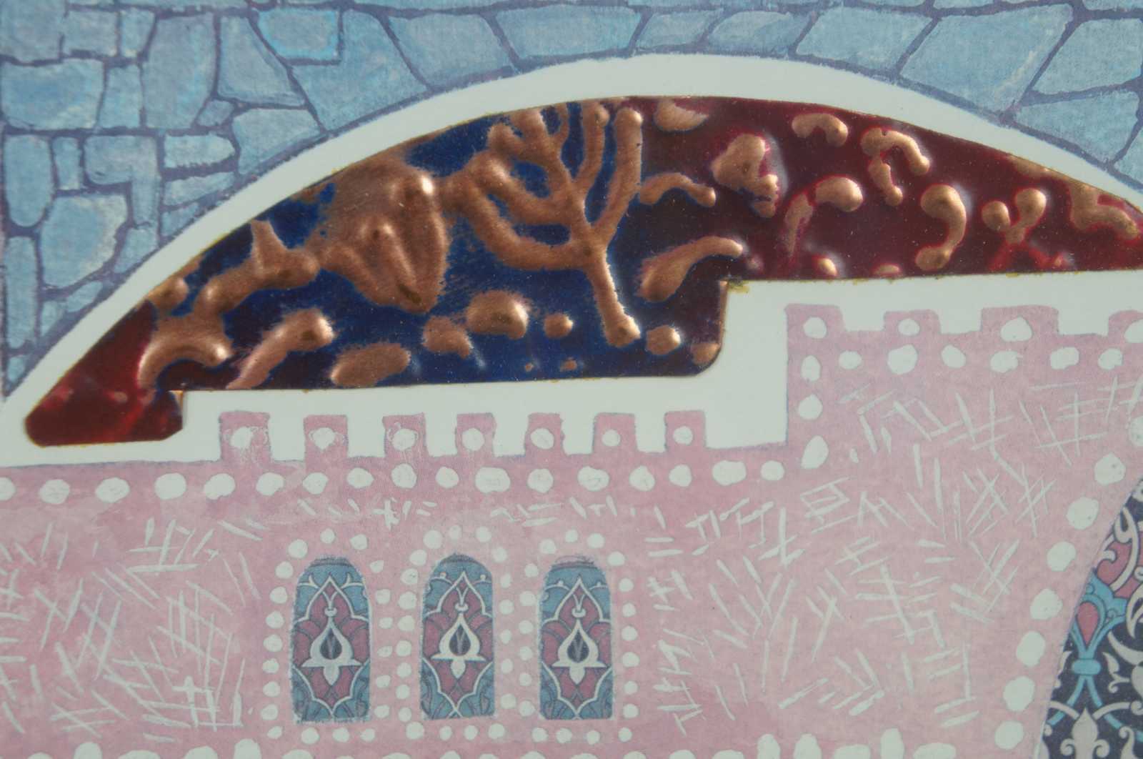 Jerusalem by Bat Schlomo. Hand signed / pencil signed lithograph / collograph featuring a cityscape of the holy city. Edition 242/300.