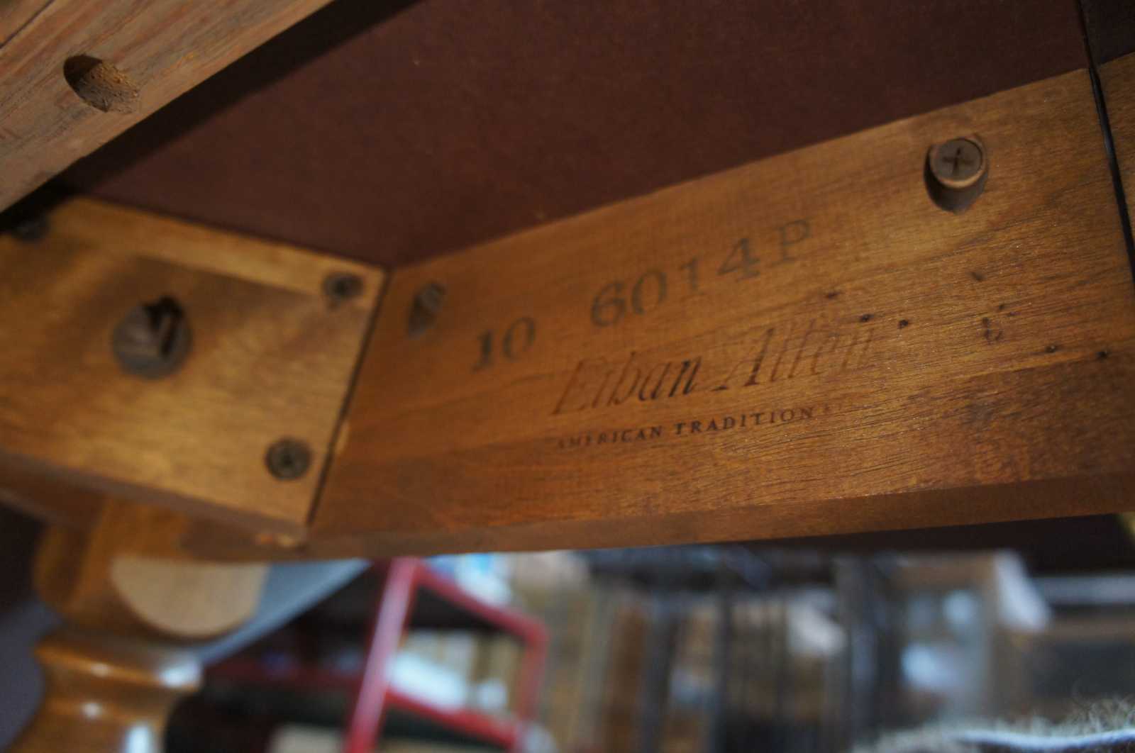 Early American style drop leaf table by Ethan Allen #10-6014P. Made from solid maple in a warm brown nutmeg finish with decorative laminate top. Circa 1970s