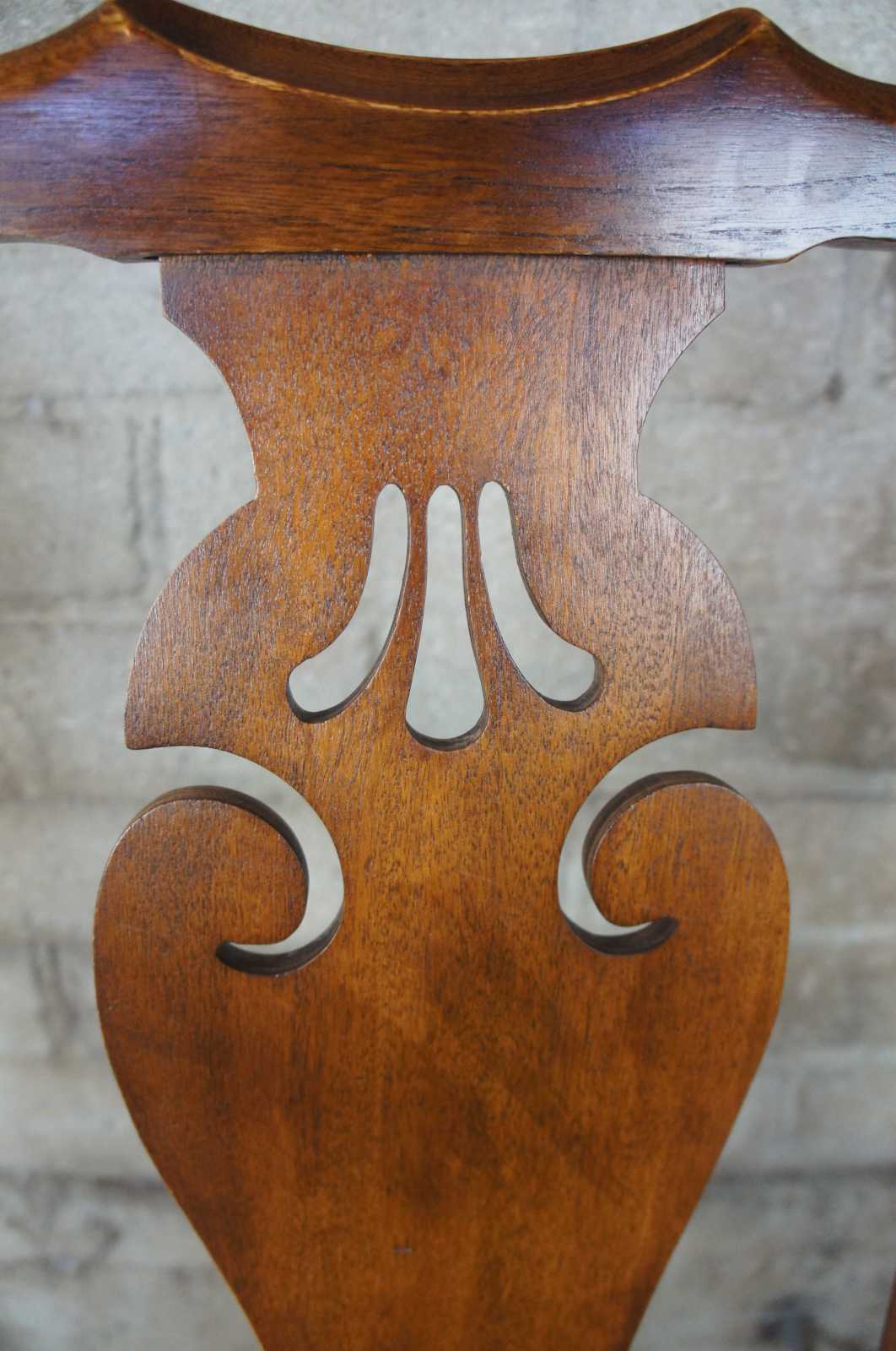 Queen Anne side and arm chair by Bernhardt Furniture Co, circa 1980s. Features molded shoulder with vase shaped and pierced splat back, upholstered in black with insect (bee) pattern. Rests on Cabriole legs.