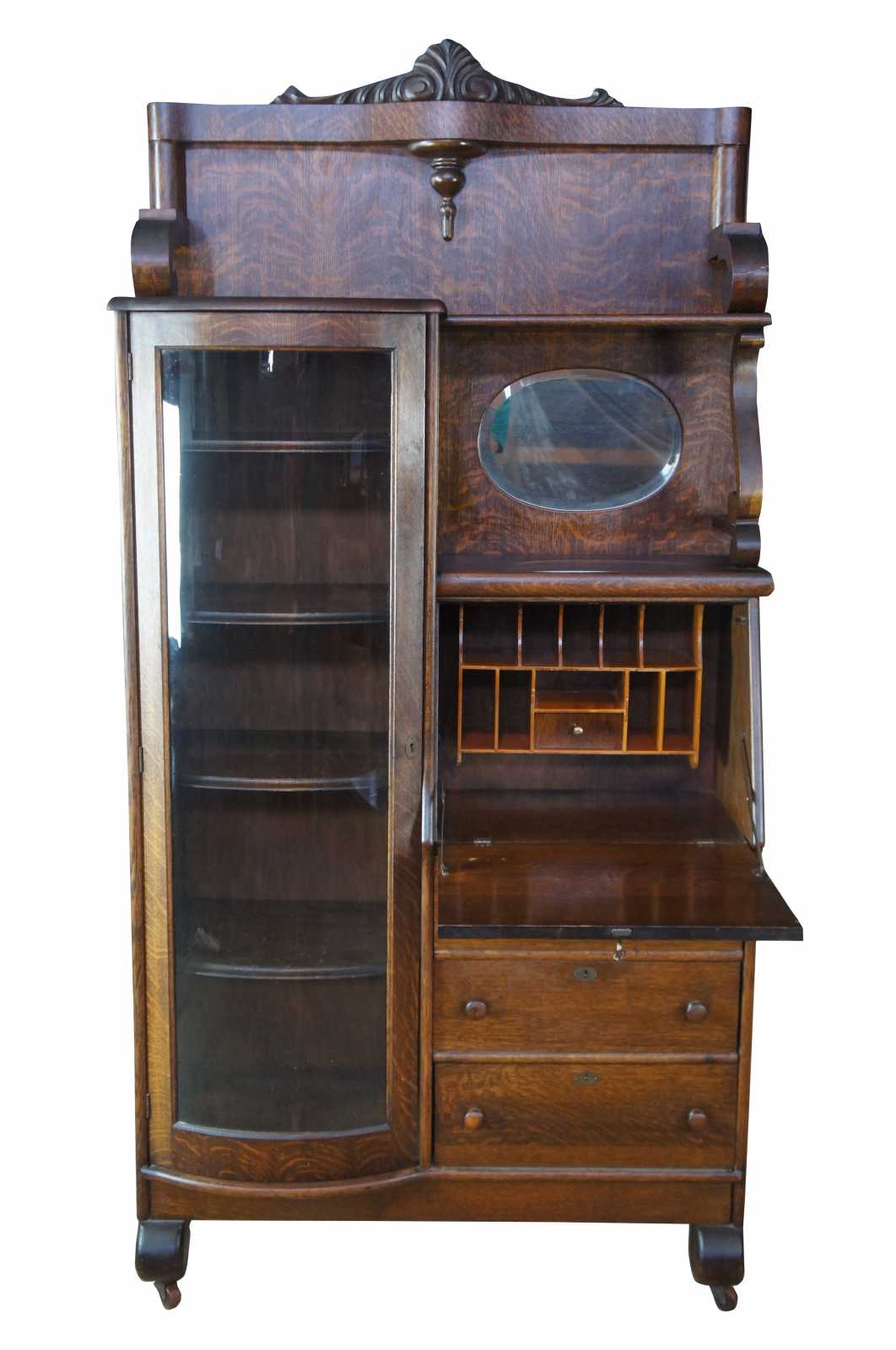Late Victorian side by side secretary desk and bookcase from National Furniture Company. Crica 1900s. Made from quartersawn oak with a drop front secretary over three drawers flanked by a curved glass front bookcase. Secretary opens to pigeon holes and interior drawer. Includes a carved backsplash with drop finial over shelf and beveled oval glass mirrror. Rests upon wooden casters that are removable. National Furniture Company was based out of of Jamestown, New York and operated from 1890-1938. They specialized in the manufacture of high end furniture and later became Union National in 1939.