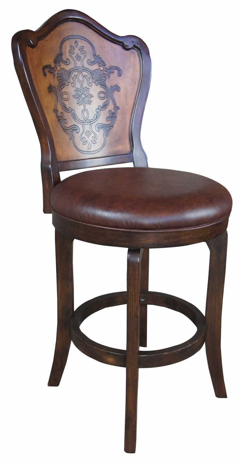 Three Italian Florentine leather bar stools. Feature ornate styling with leather accents. Counter height.