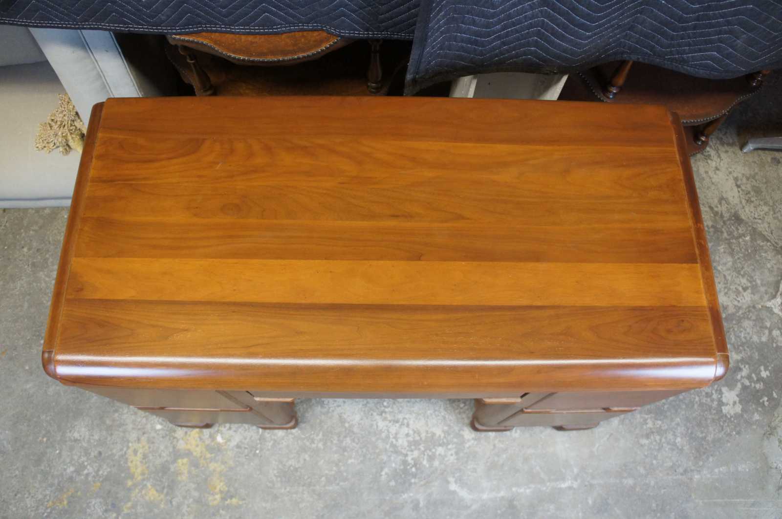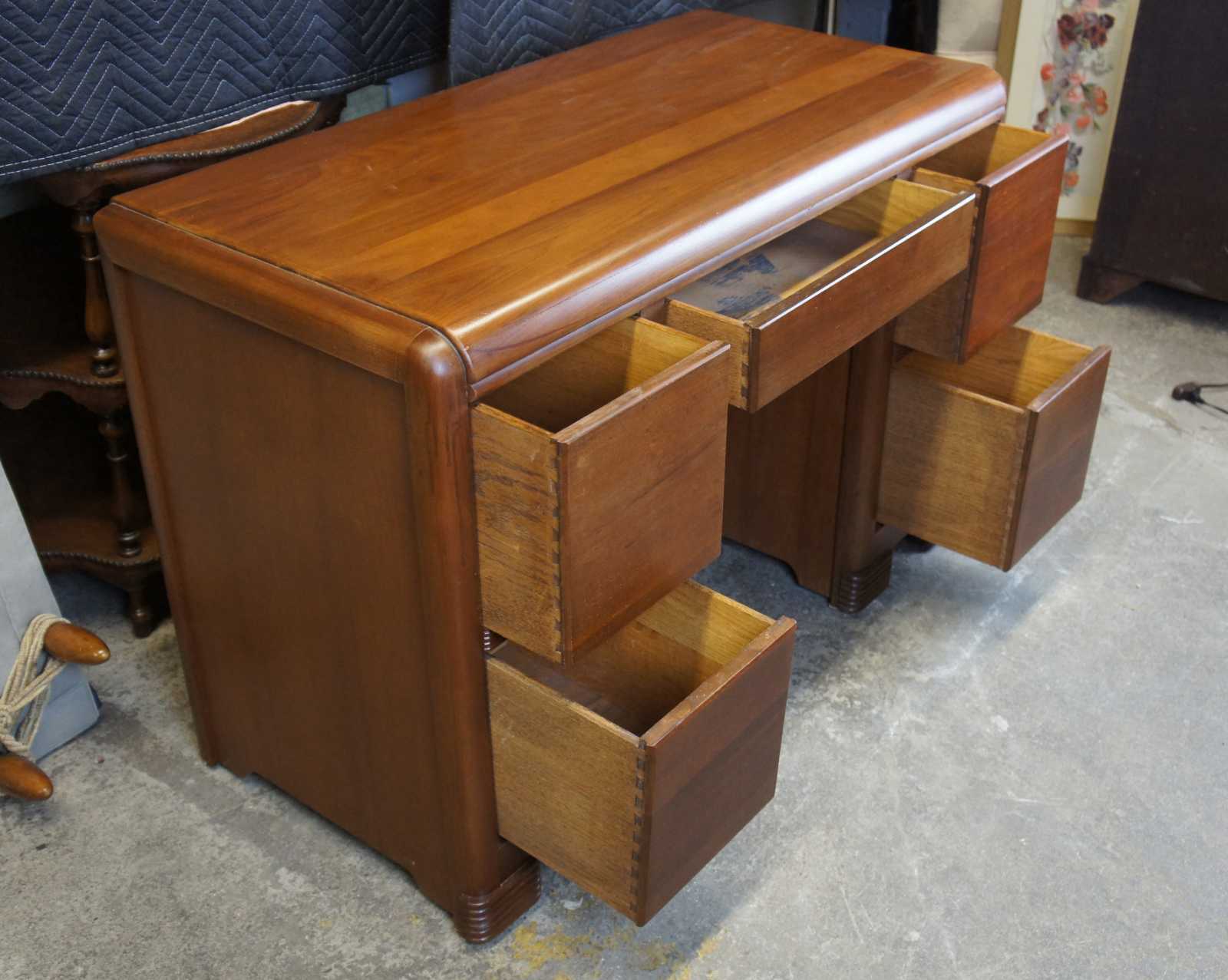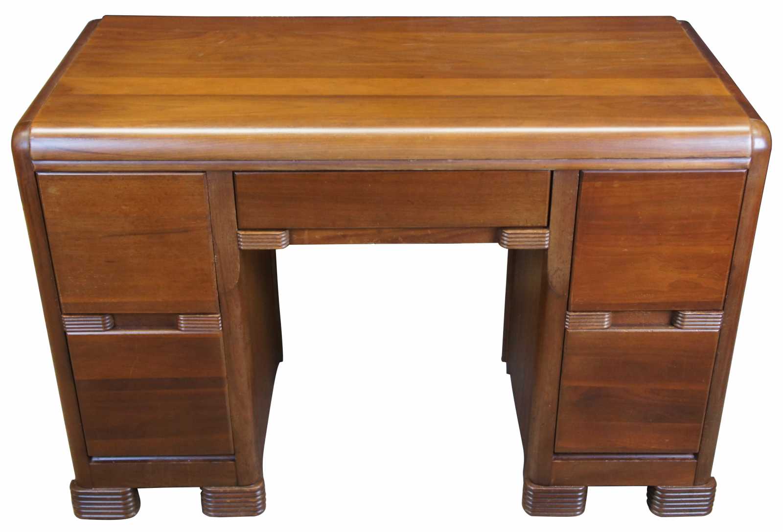 Art Deco era American Walnut writing desk. Features the iconic waterfall front with four large drawers flanking a kneehole and upper pencil drawer. Circa 1940s