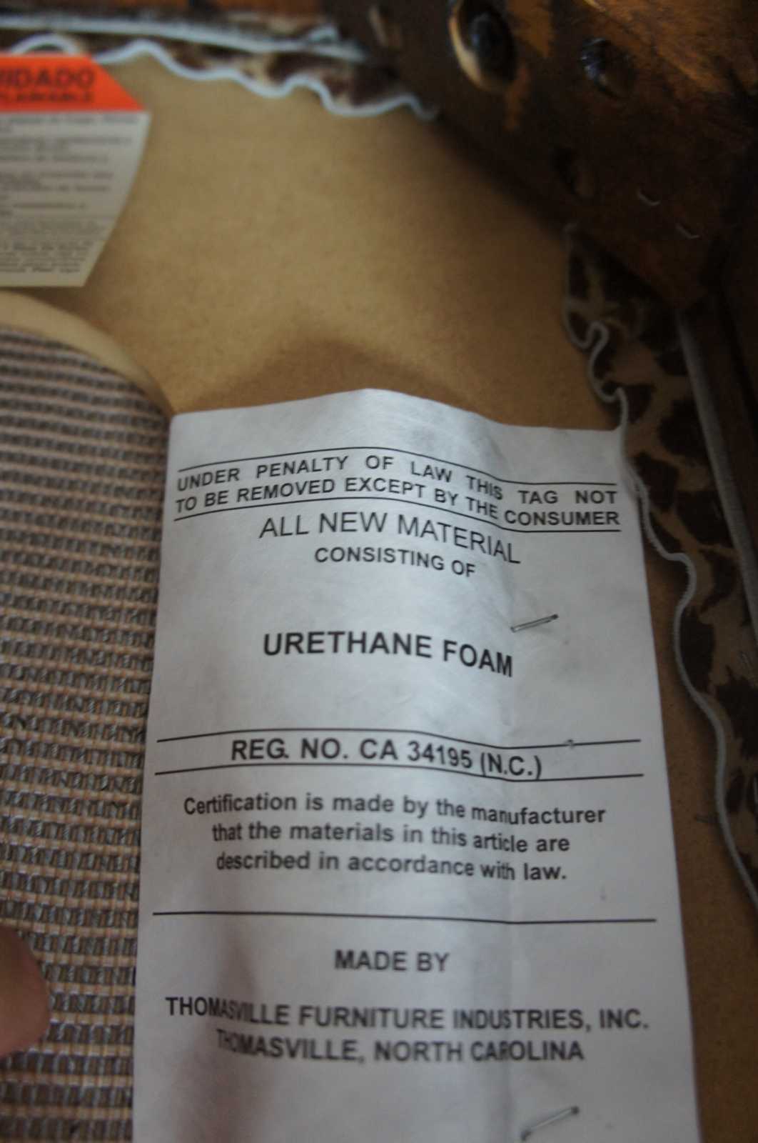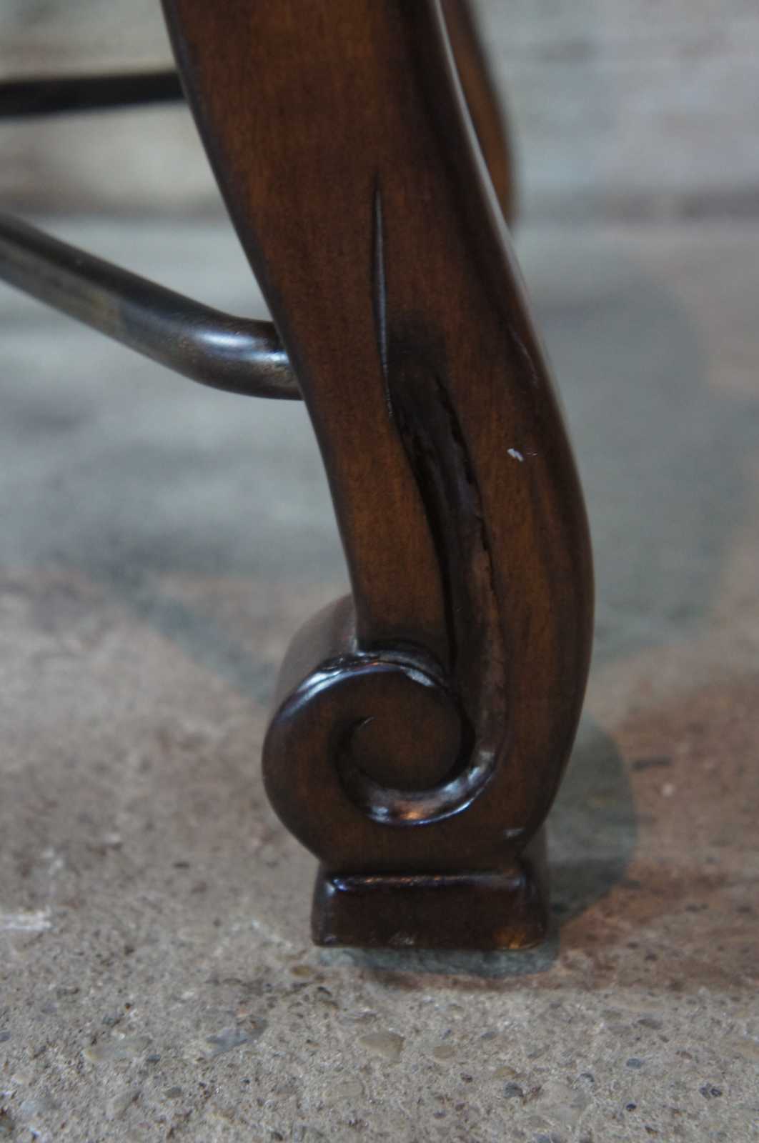 Pair of Thomasville armchairs, part of the Hemmingway collection. Features an old world Italian styling with scrolled acanthus carved arms, a rattan back and iron stretcher connecting each leg.