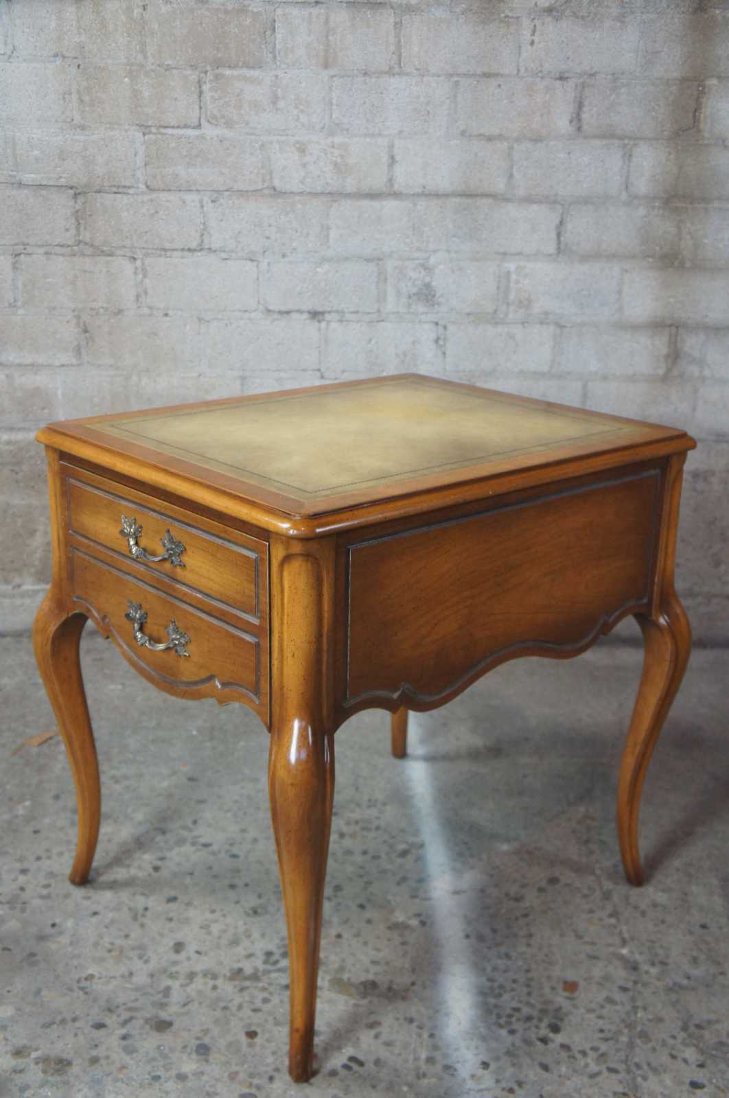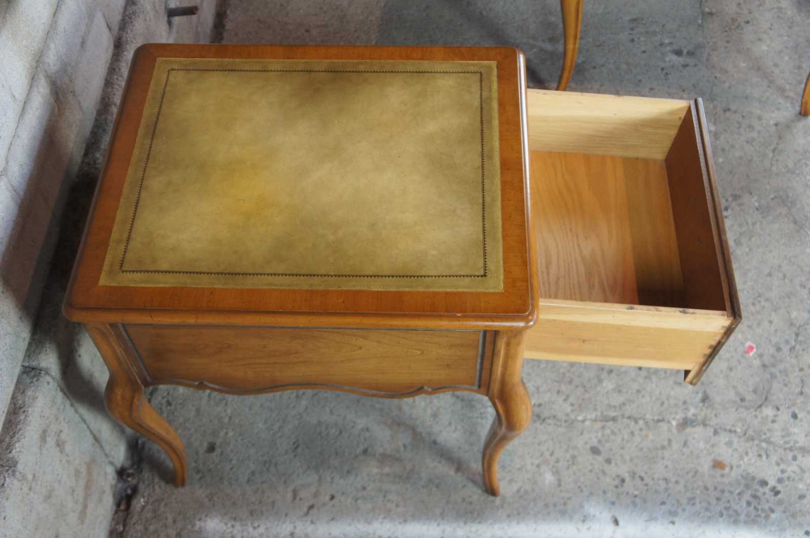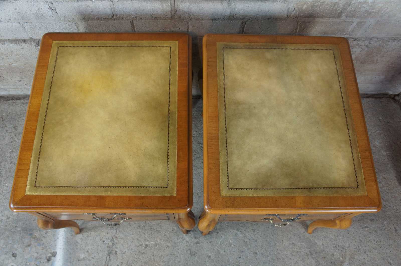 Pair of two circa 1970s ashwood French Provincial style side tables. Each table features a distressed finish with tooled leather top and serpentine aprons and cabriole legs. Includes one large dovetailed drawer, making them perfect for use as nightstands or side tables.
