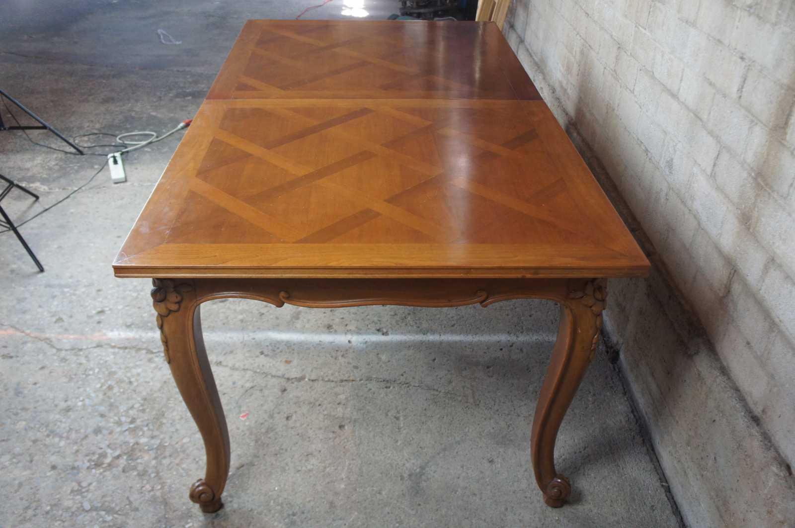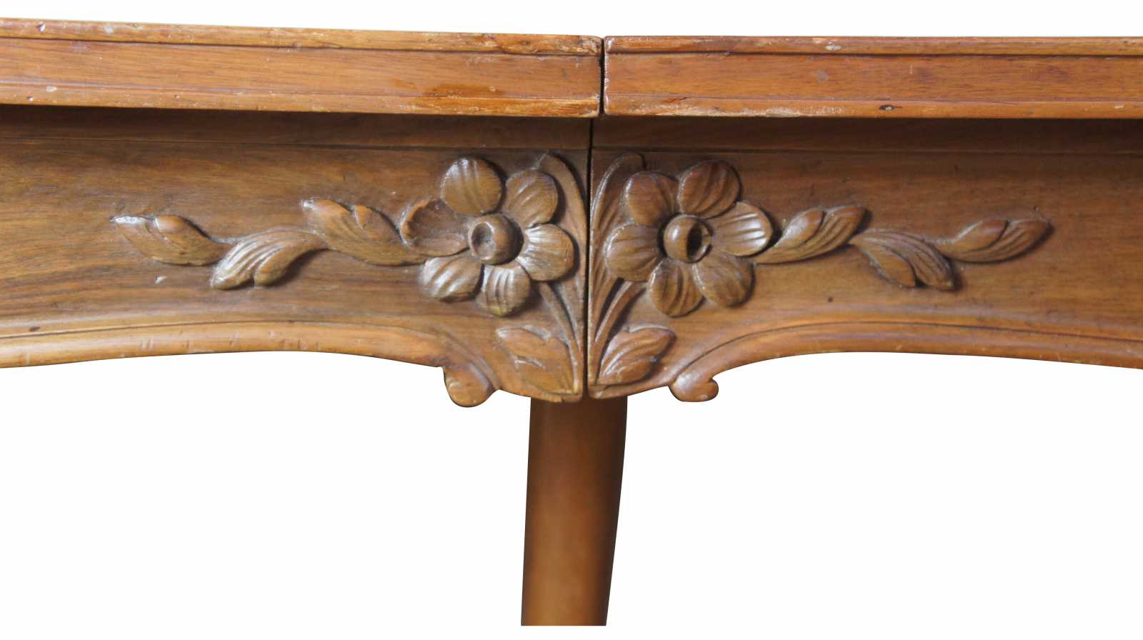 Early 20th century French dining table. Made from Walnut with floral carved embellishments and a parquetry top. Features cabriole legs with scrolled foot. Includes two leaves.