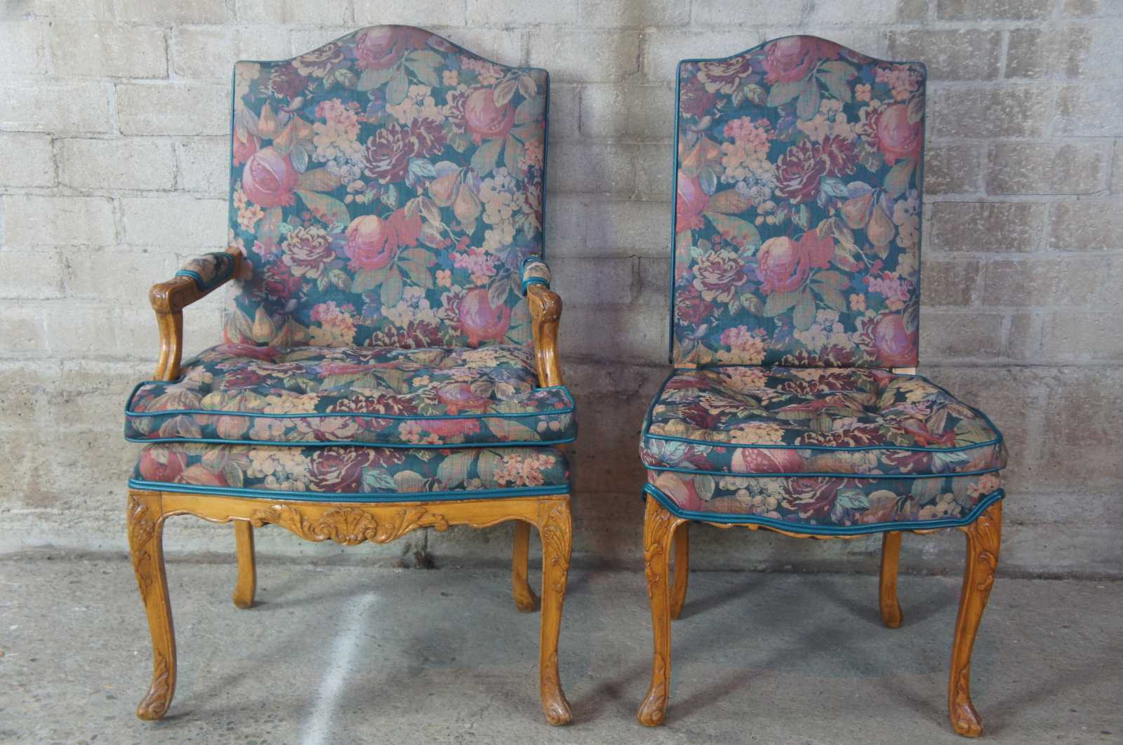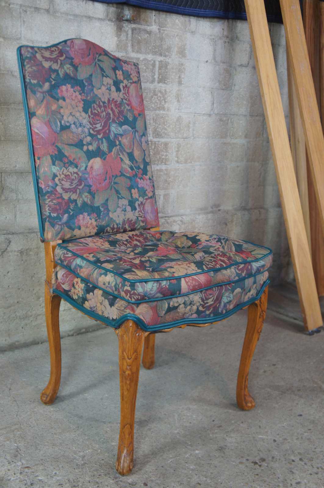 Early 20th century French dining chairs. Made from walnut with intricately carved acanthus and scalloped accents. Fully upholstered with a floral fabric and built in cushions.