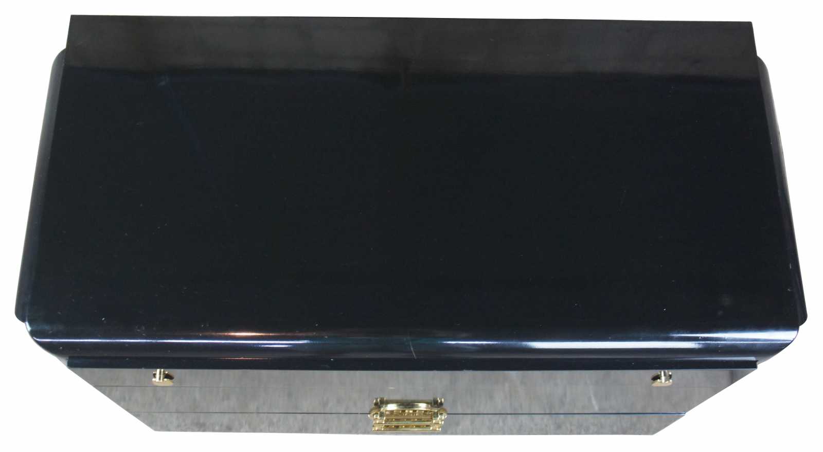 Mid 20th century modern dresser by Romweber Furniture. Features an Asian inspired design with black lacquer finish and nickel polished hardware with oriental motif.