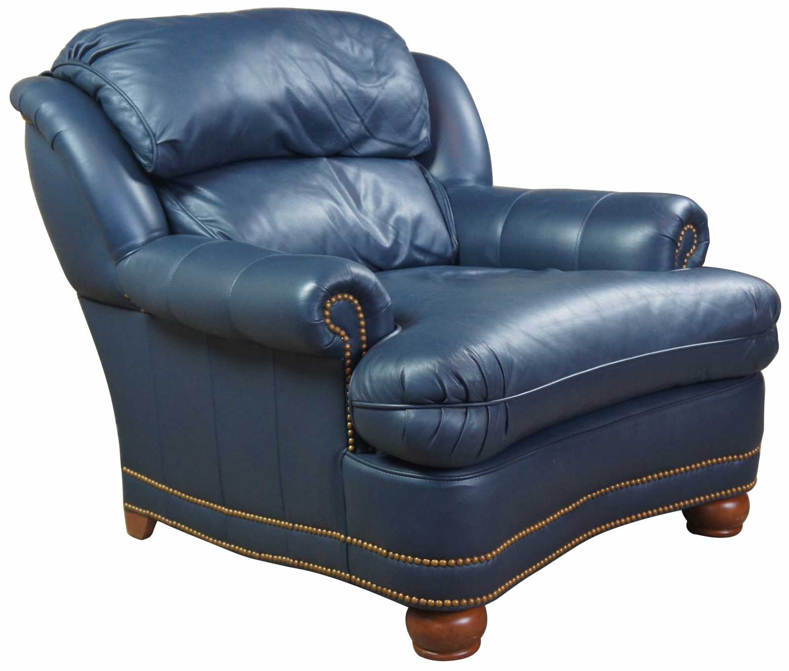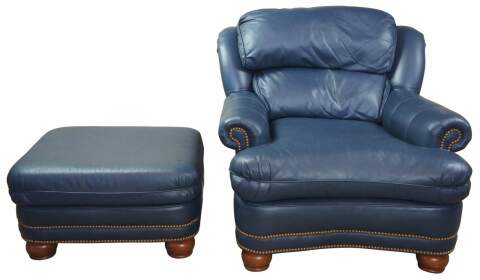 Circa 2001 Thomasville blue leather club chair and ottoman. Features brass nailhead trim and bun feet.