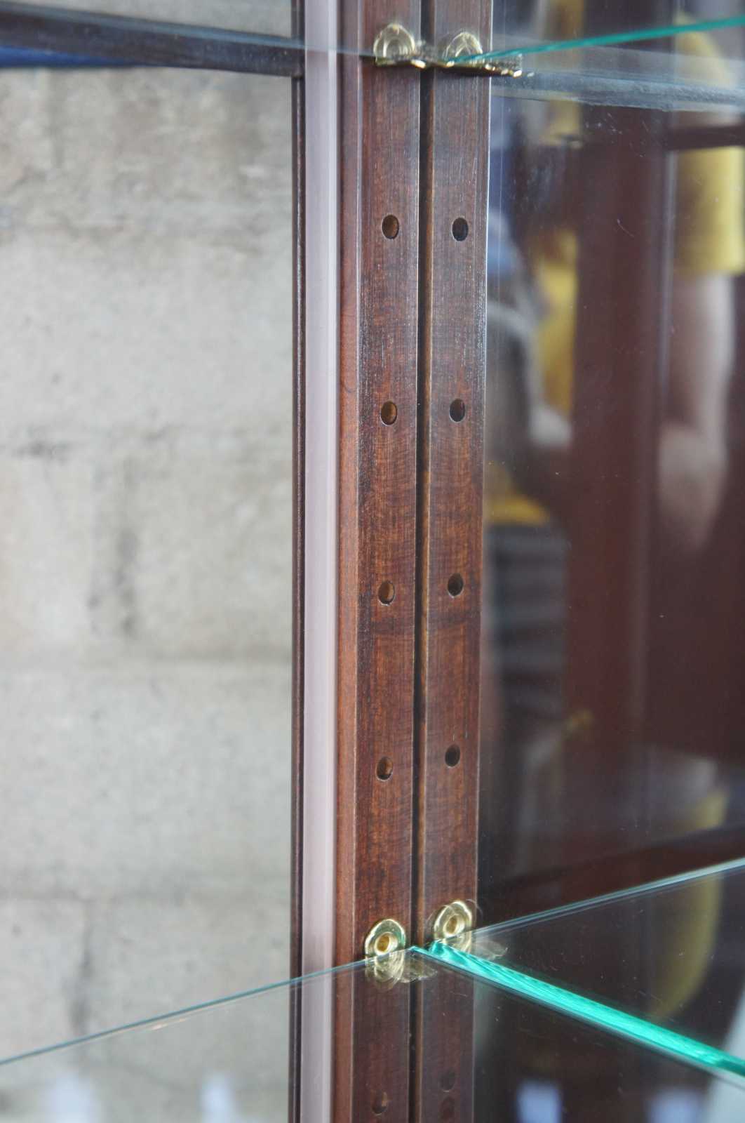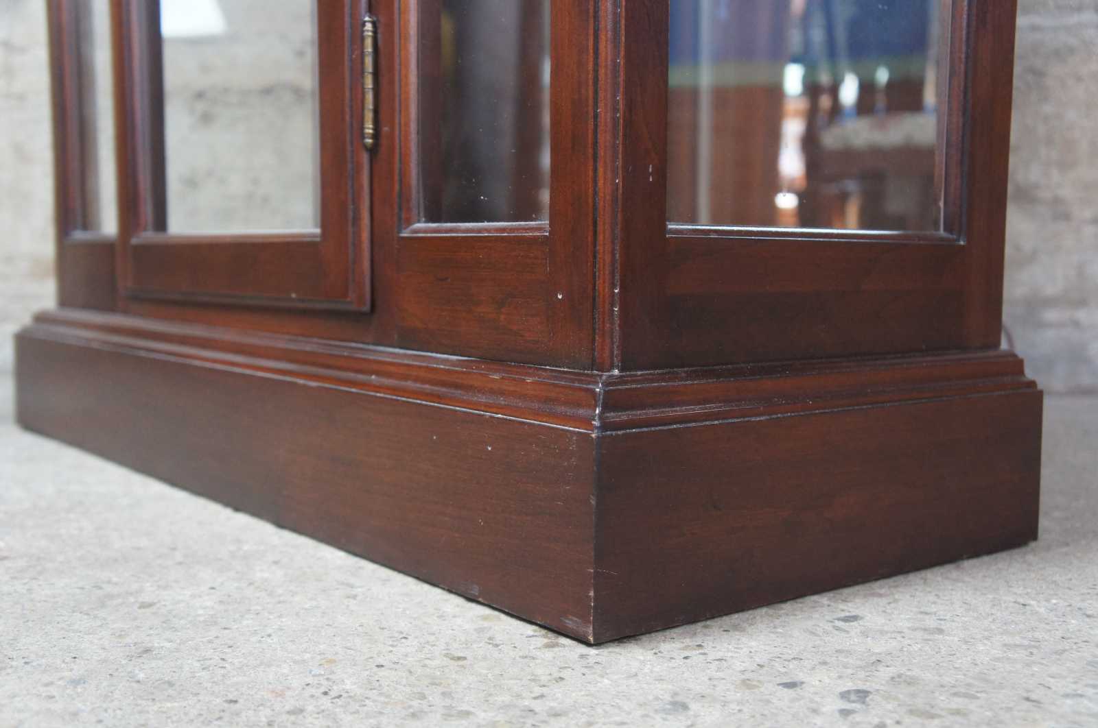 Ethan Allen Georgian Court #11-9019 curio cabinet. Circa 1985. Features four adjustable glass shelves and two interior lights with mirrored back.