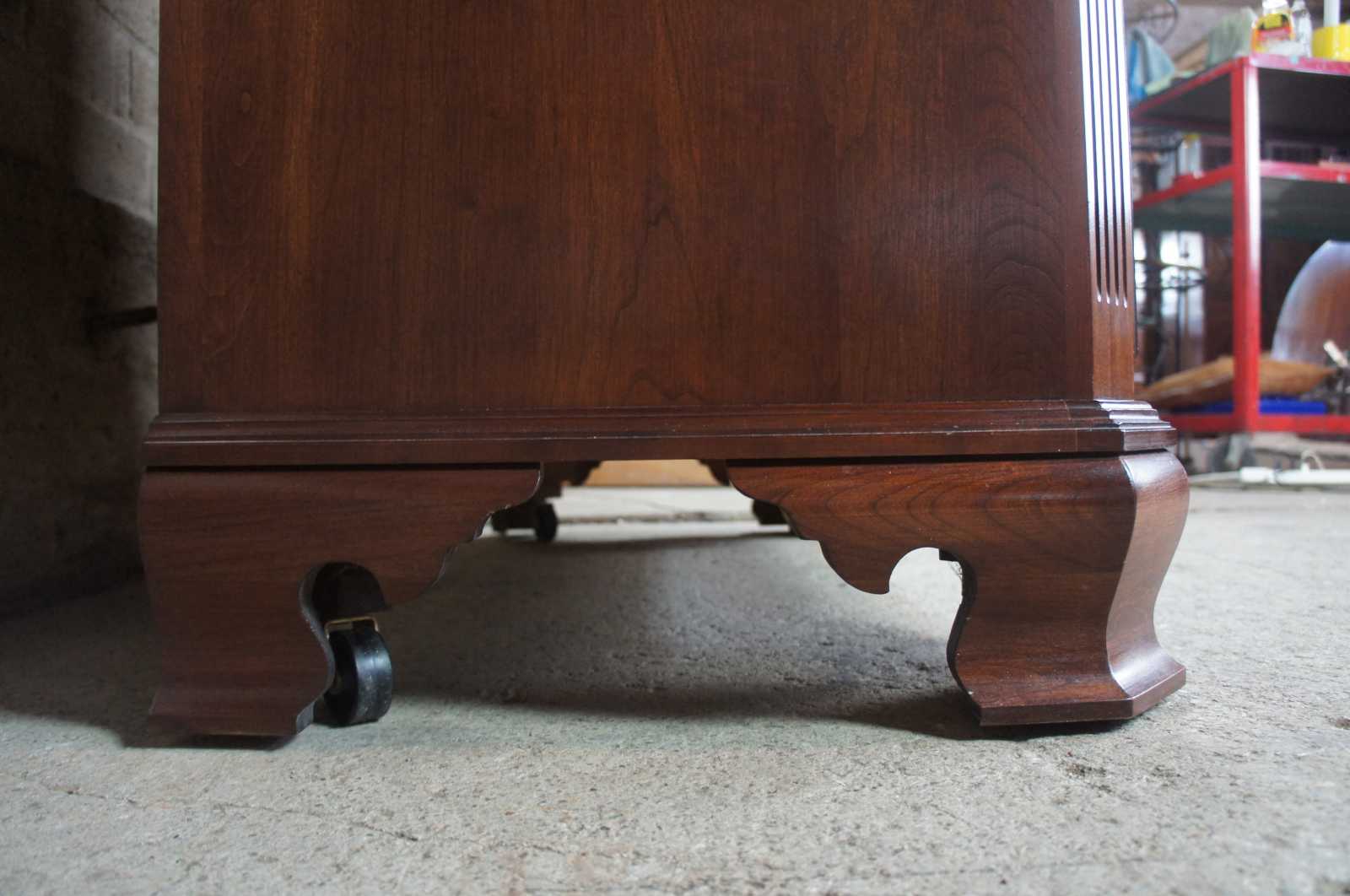 Circa 1991 Ethan Allen Georgian Court Chippendale linen press or armoire. Made from solid cherry. Opens to compartments that are removeable for a hanging bar or TV / electronics. Two interior drawers and two lower drawers for storage.