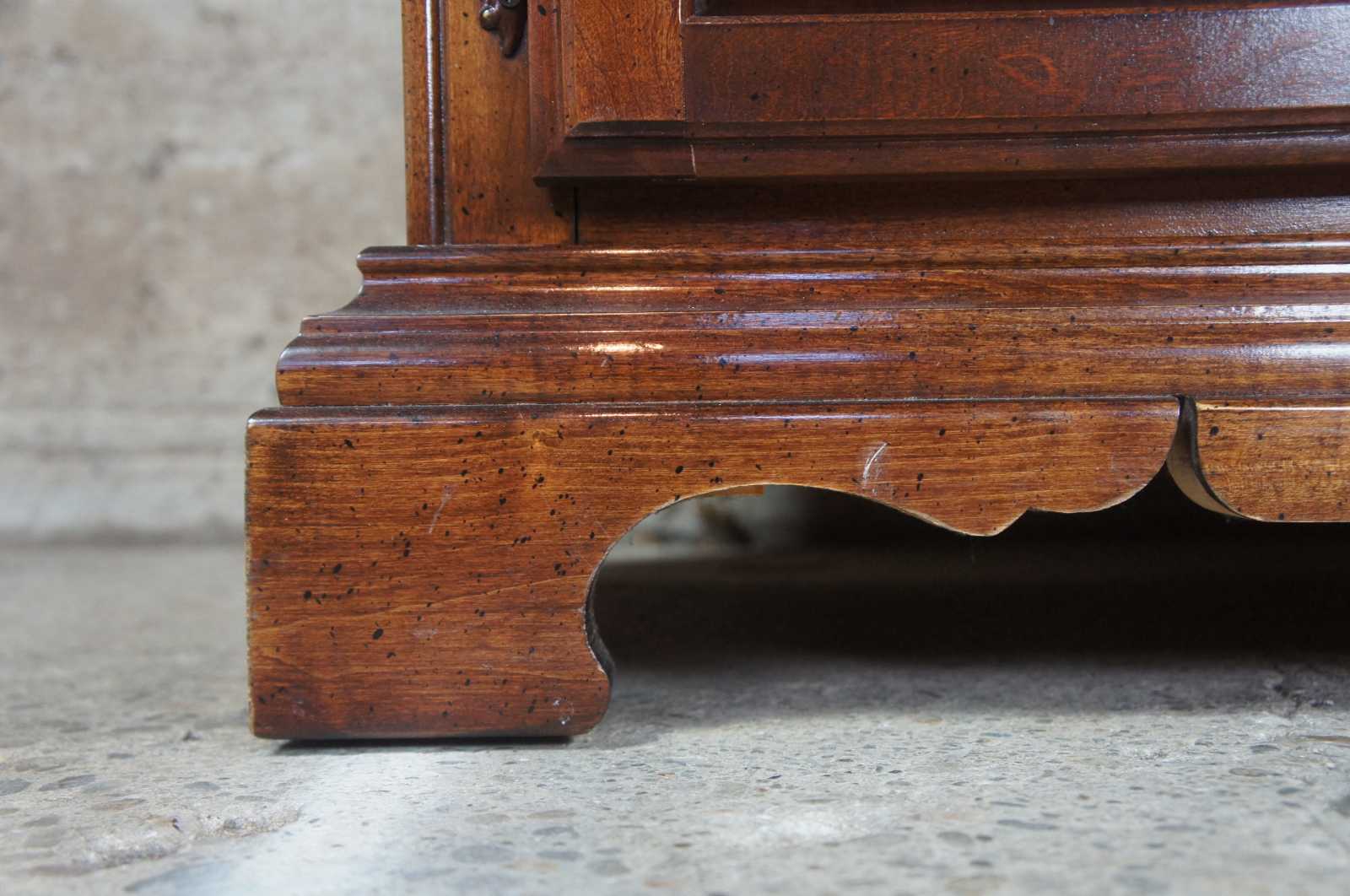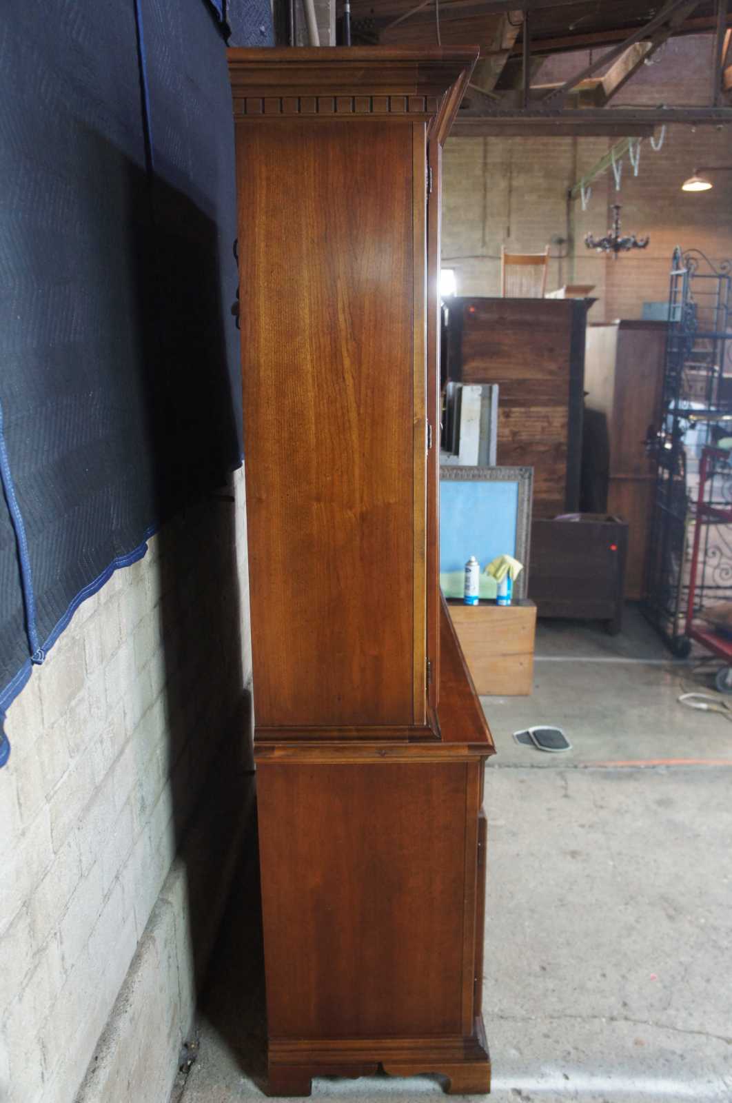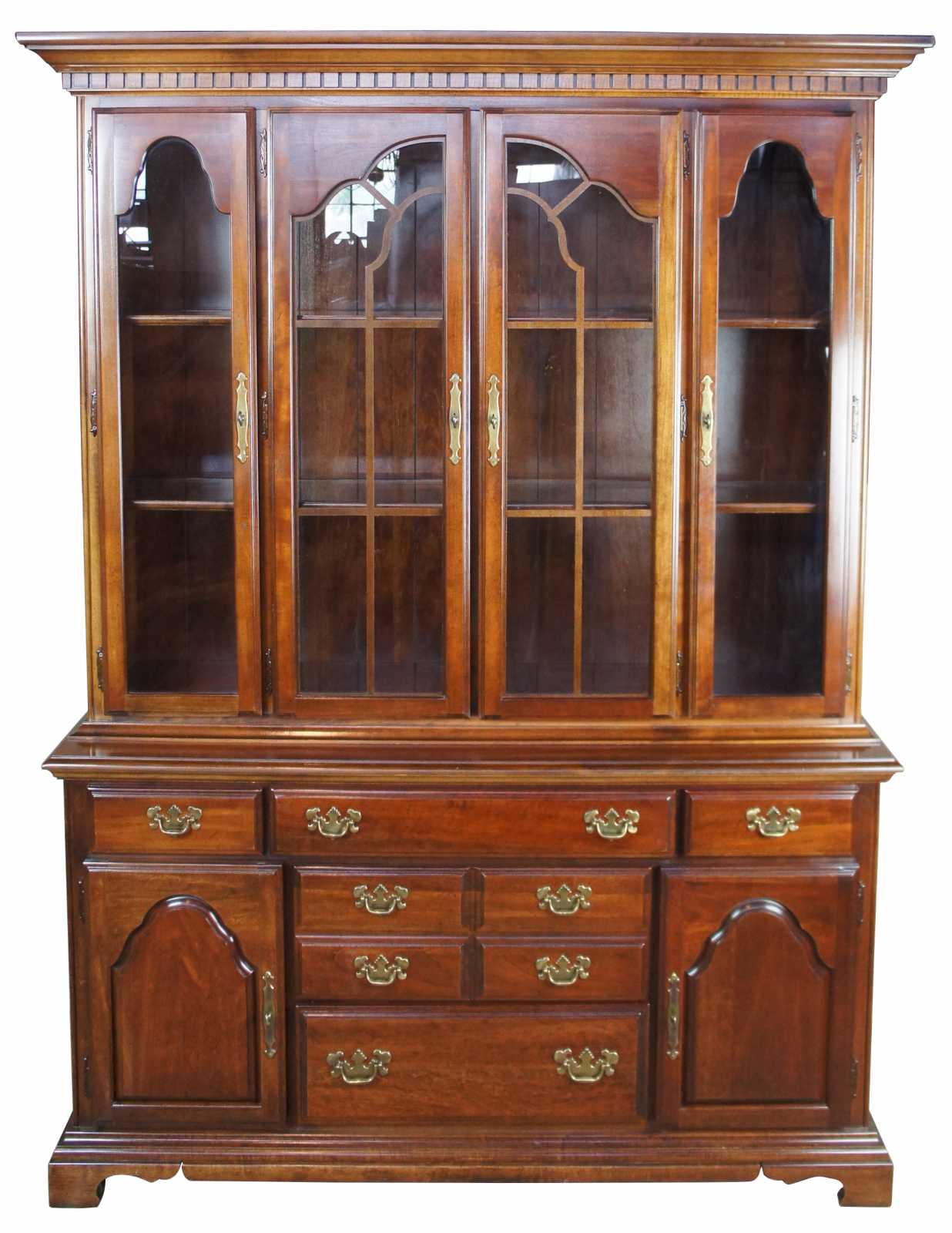 American Drew Cherry Grove display cabinet, circa 1980s. Features chippendale styling with fretwork over the two center doors. Includes five drawers and two outer cabinets, central drawer is lined with silverware cloth. Interior illuminates.