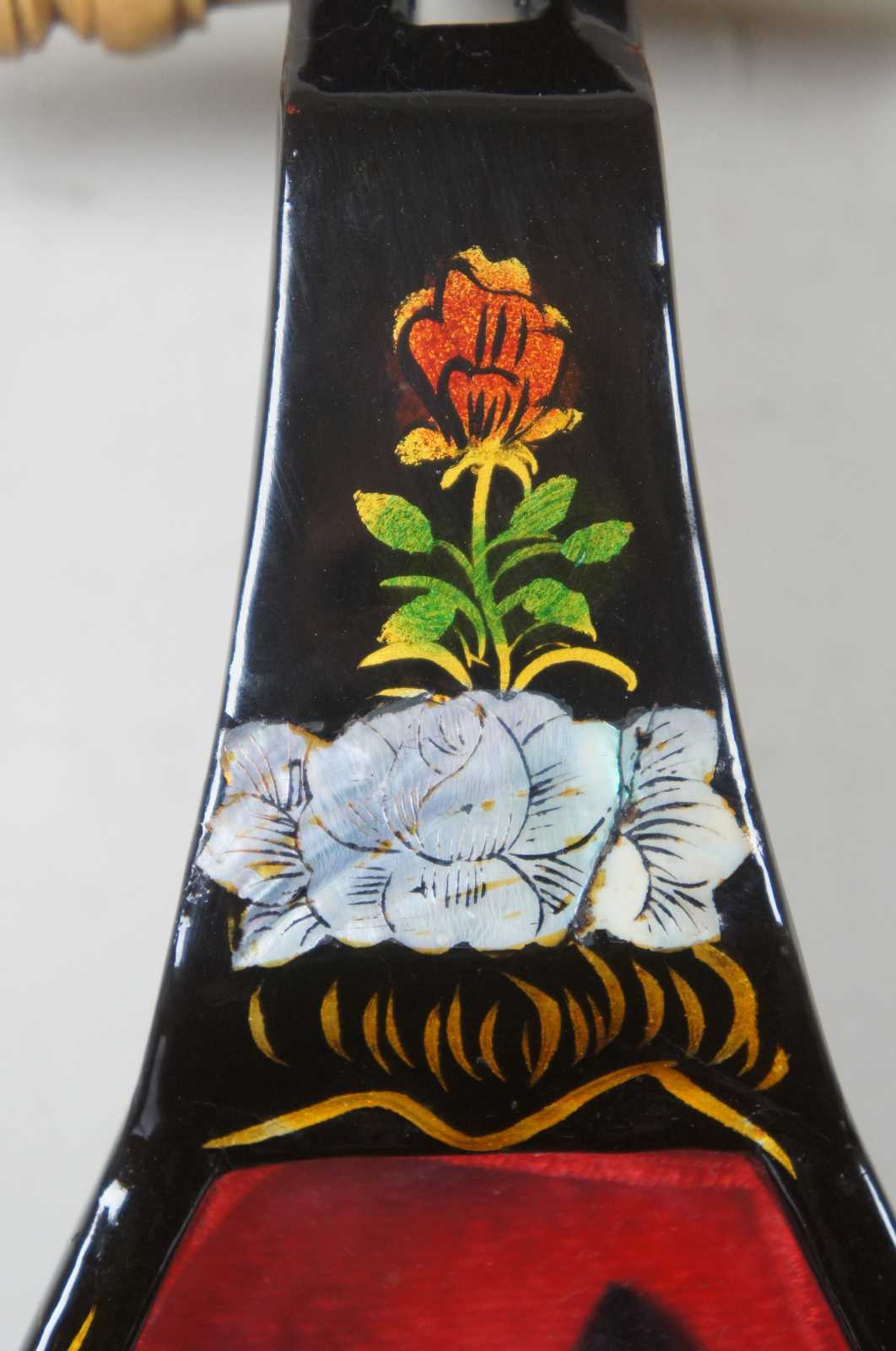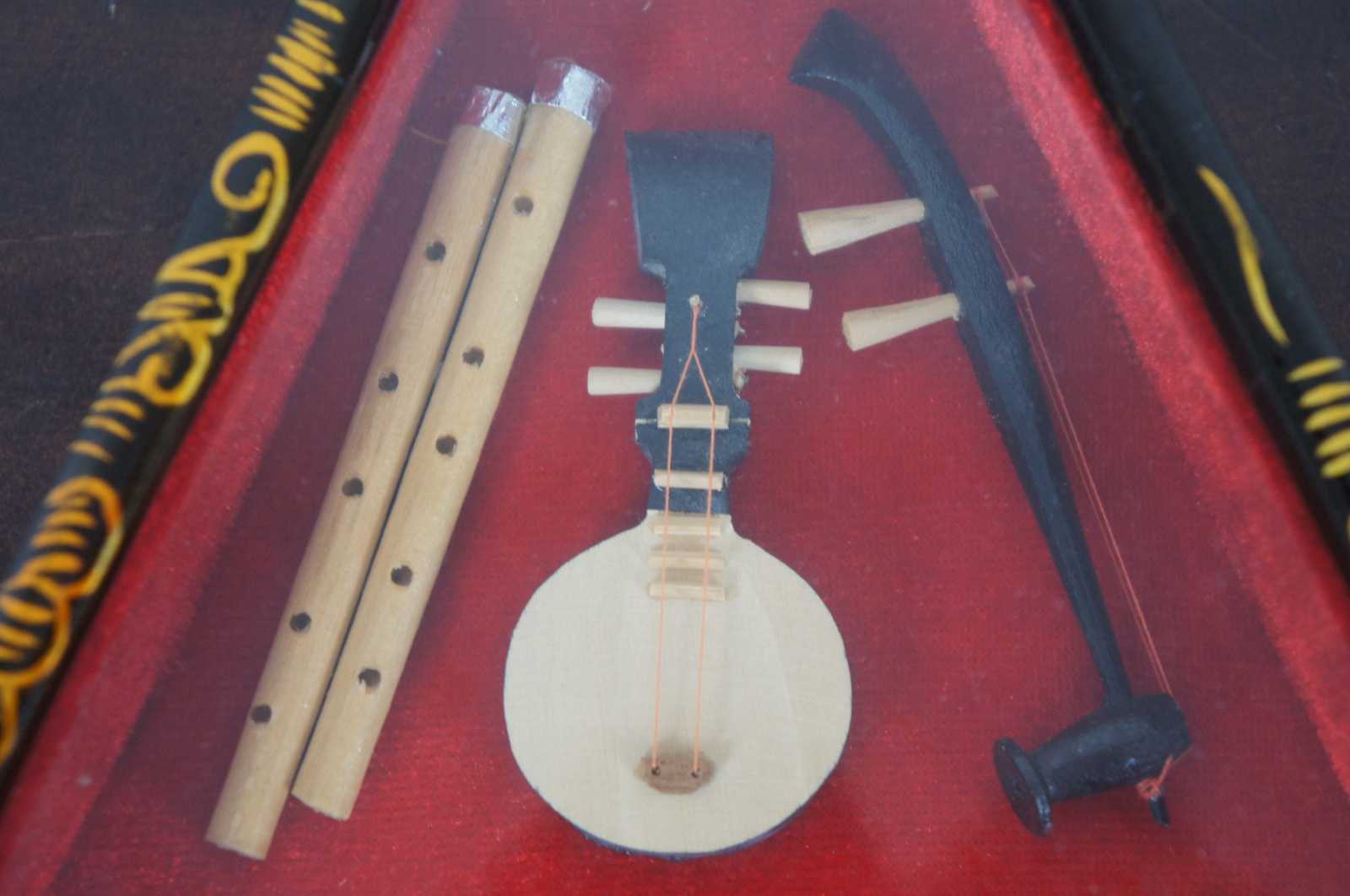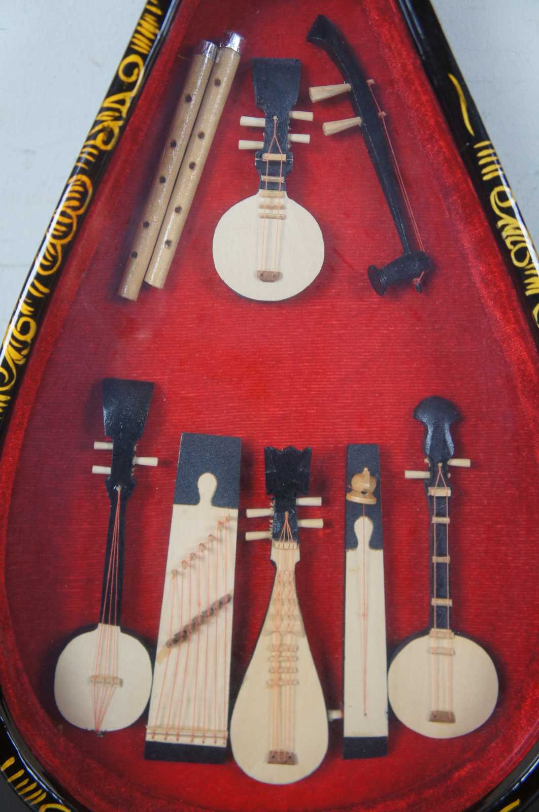 Mid 20th century black laquor decorative Liuquin instrument shadow box. Hand painted with coy fish, birds, flowers and bat. Interior includes miniatures such as pipa, yueh chin (moon guitar), dizi, ruan, banhu, yuequin and a guzheng instrument.