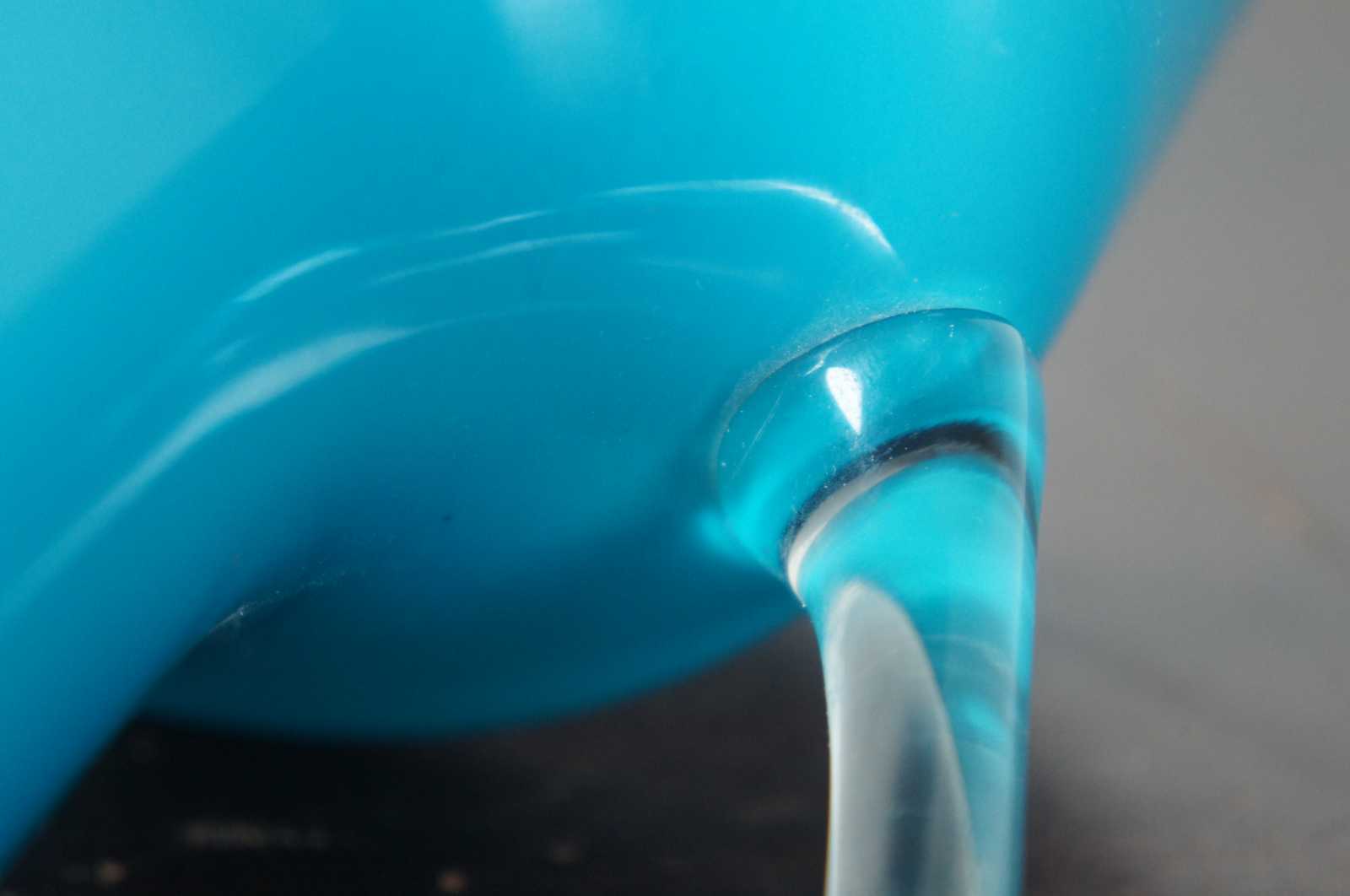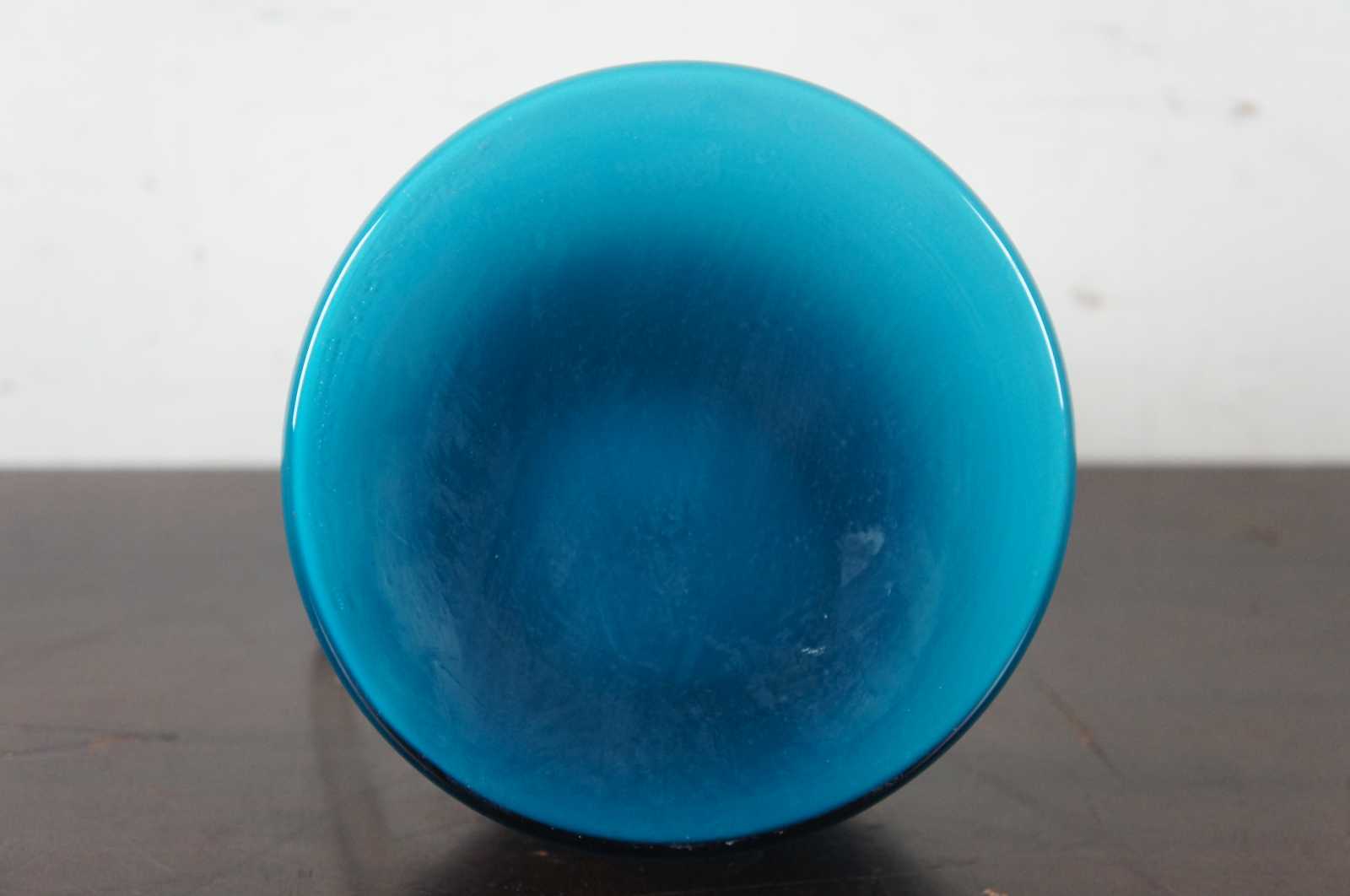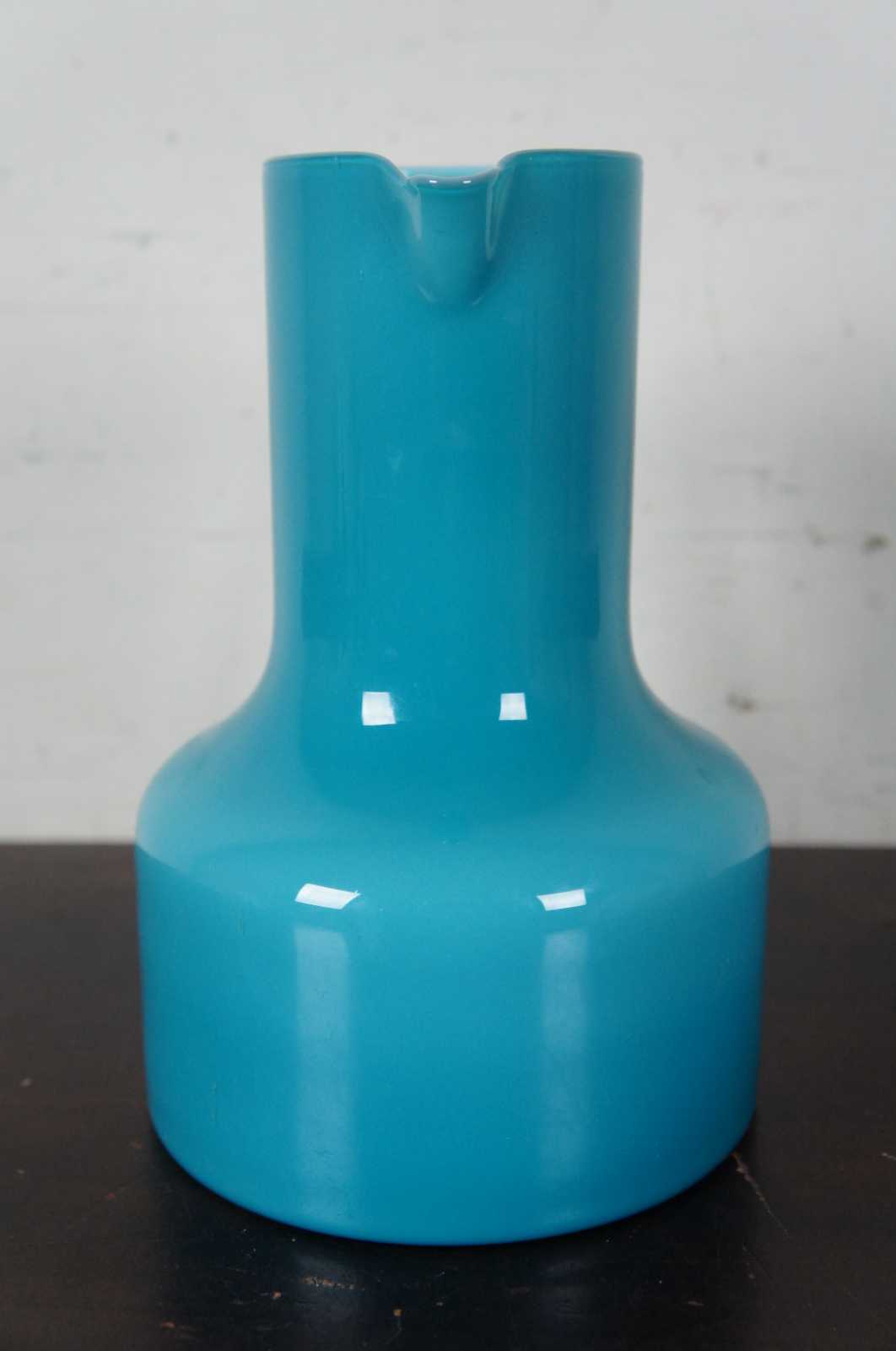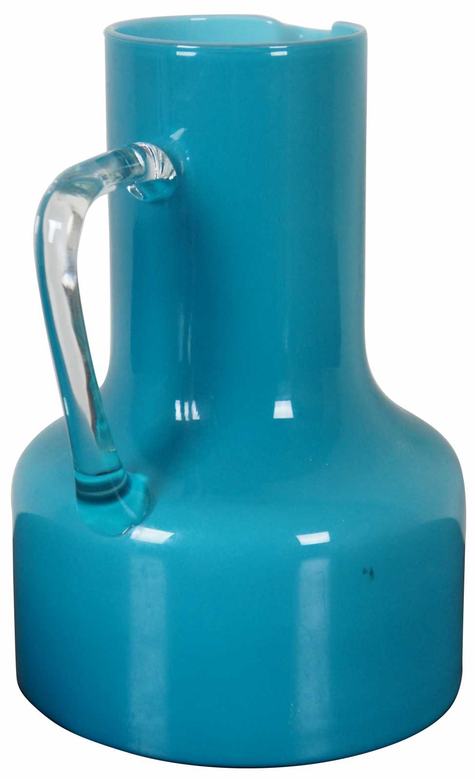 Vintage mid century modern blue glass water picture. Features vibrant blue with clear handle.