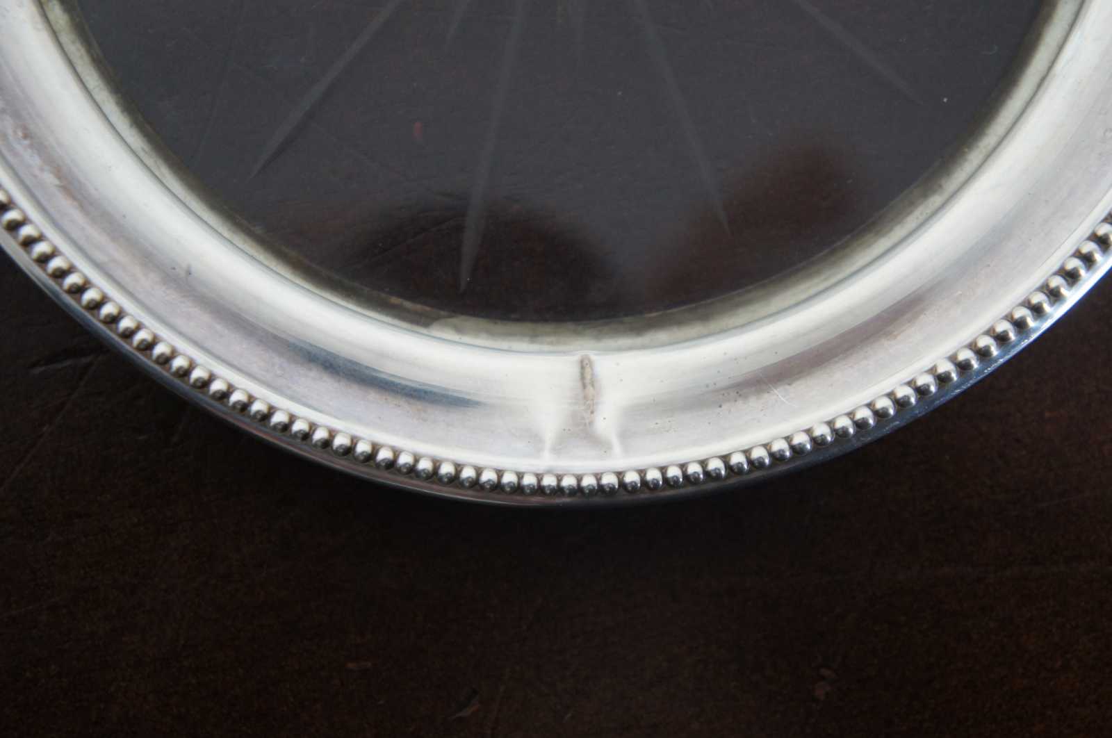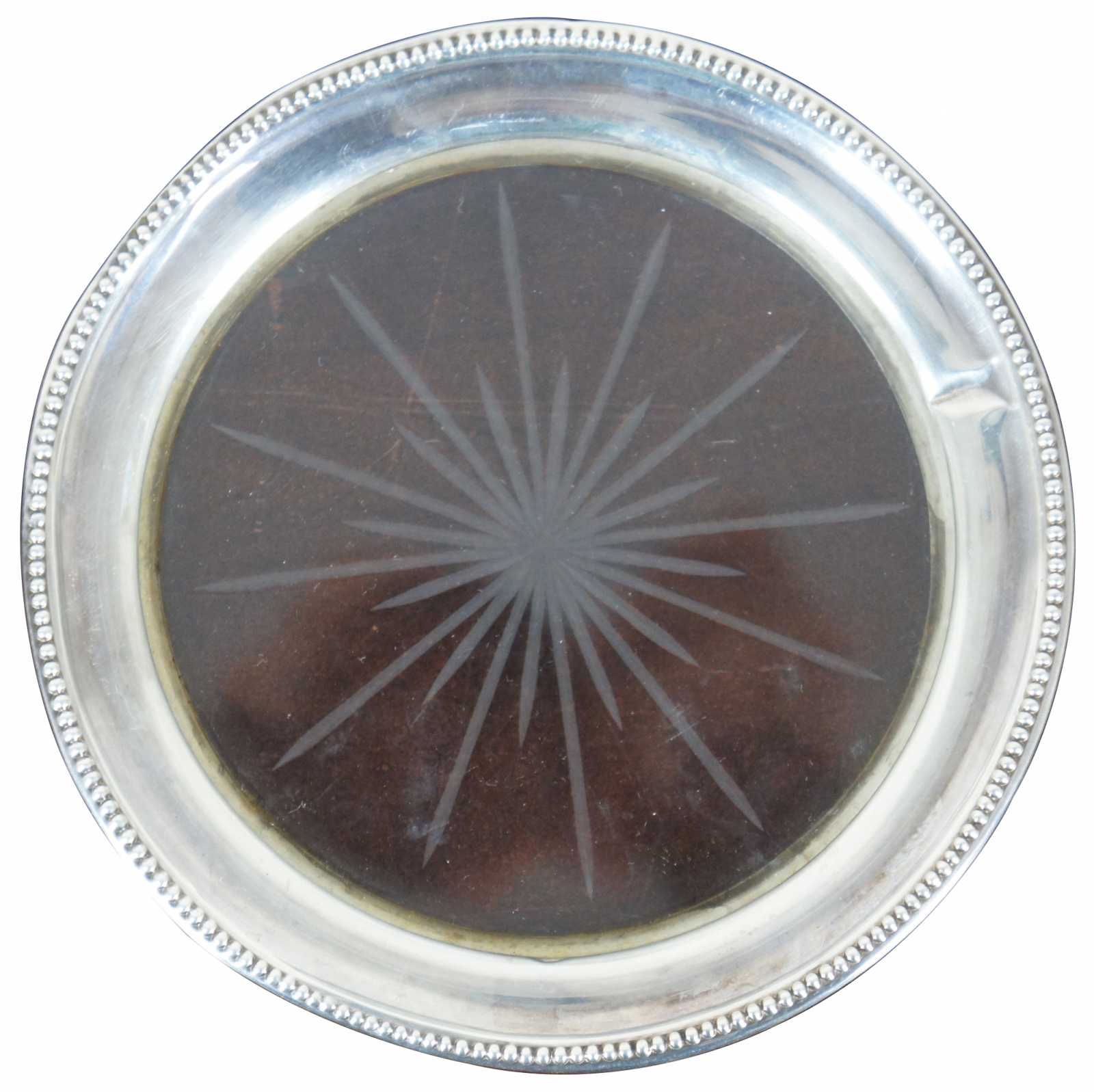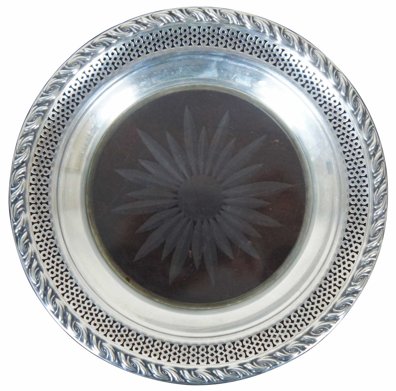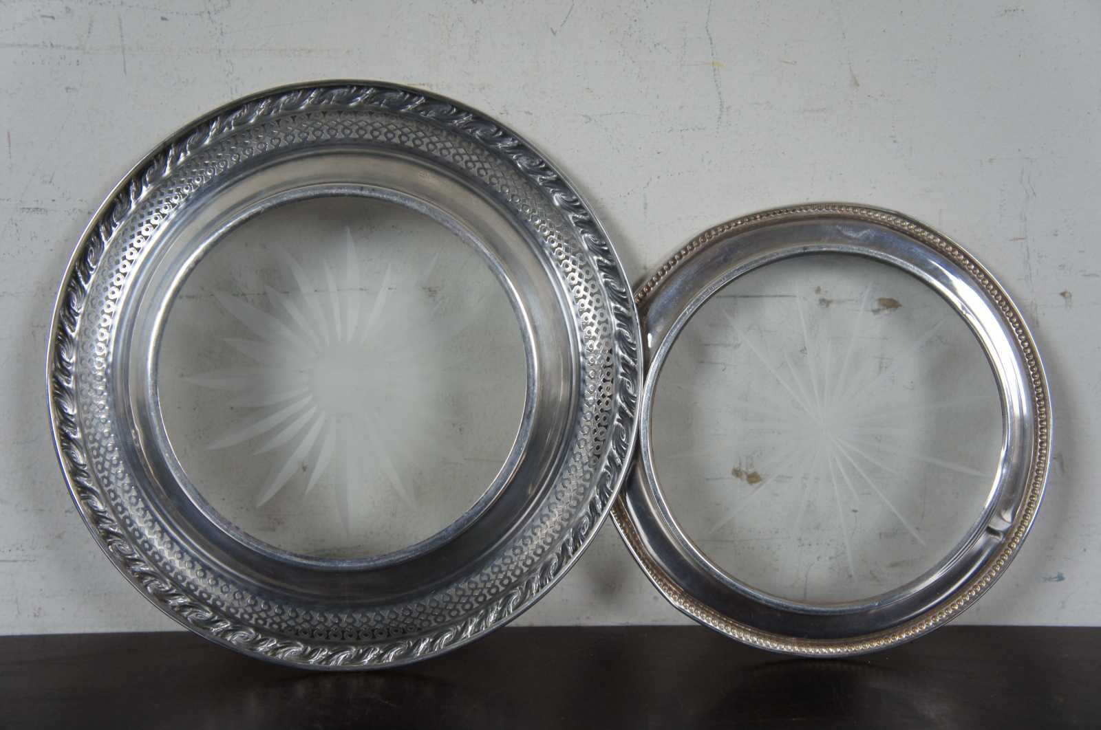 Sterling Silver Whiting and Amston etched glass wine coasters. One features a pierced or reticulated edge and the other features a beaded or dotted design. Both have a starburst or sunburst etching at center. Marked sterling.