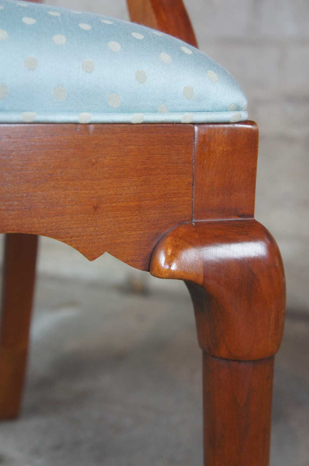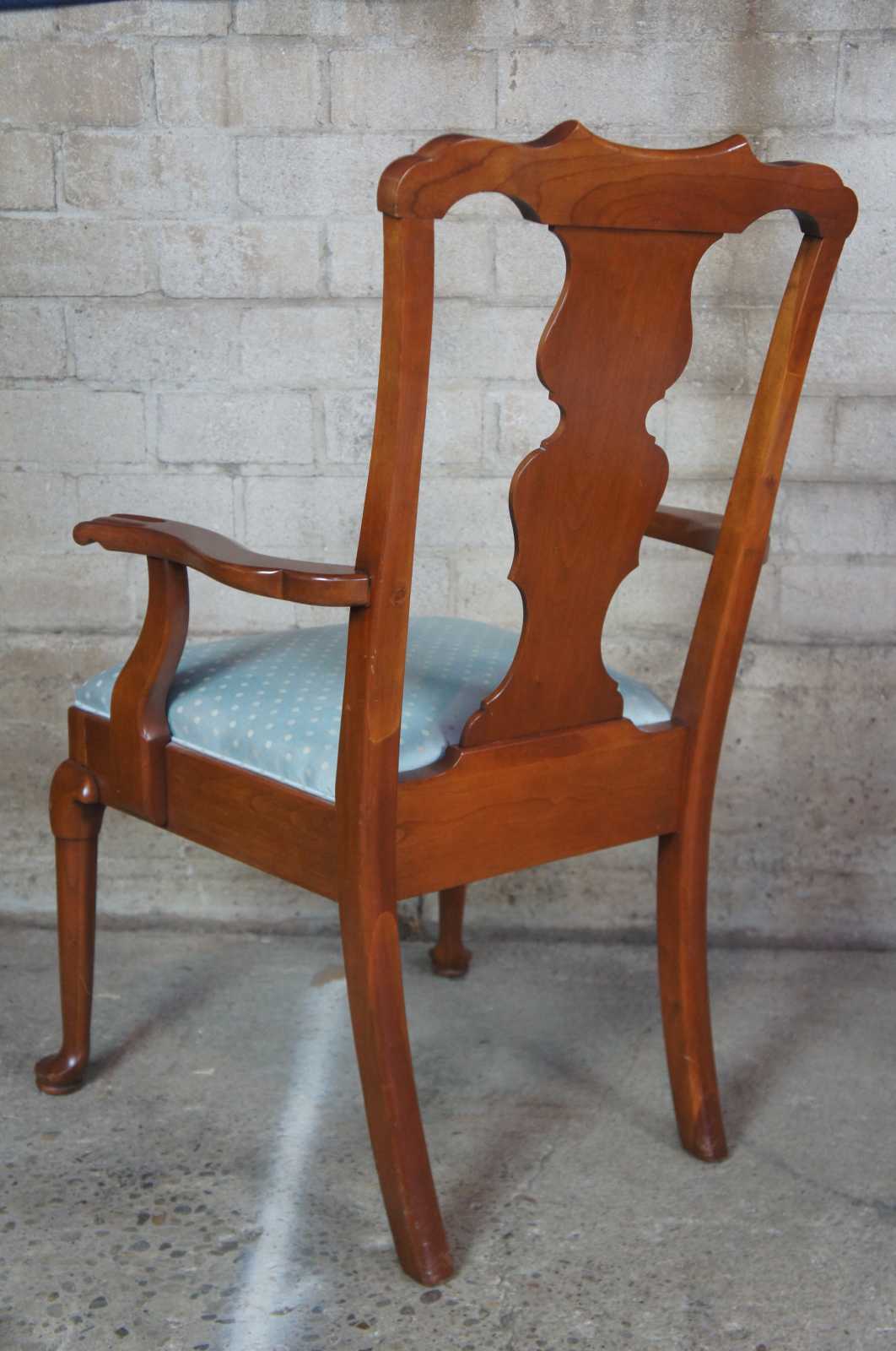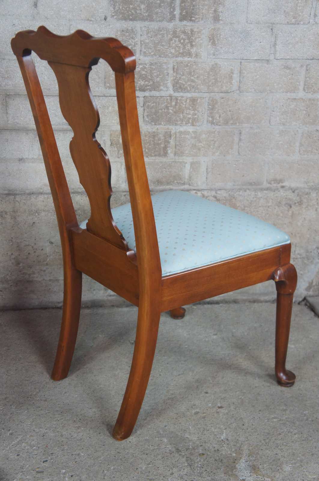 Eight Penn. House dining chairs, circa 1960s, 760-1918. Made from cherry with a blend of early american and queen anne styling. Features a vase shaped splat, carved rail and pad feet.