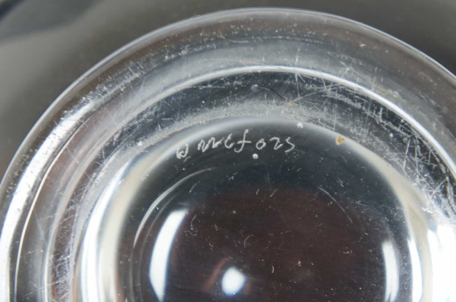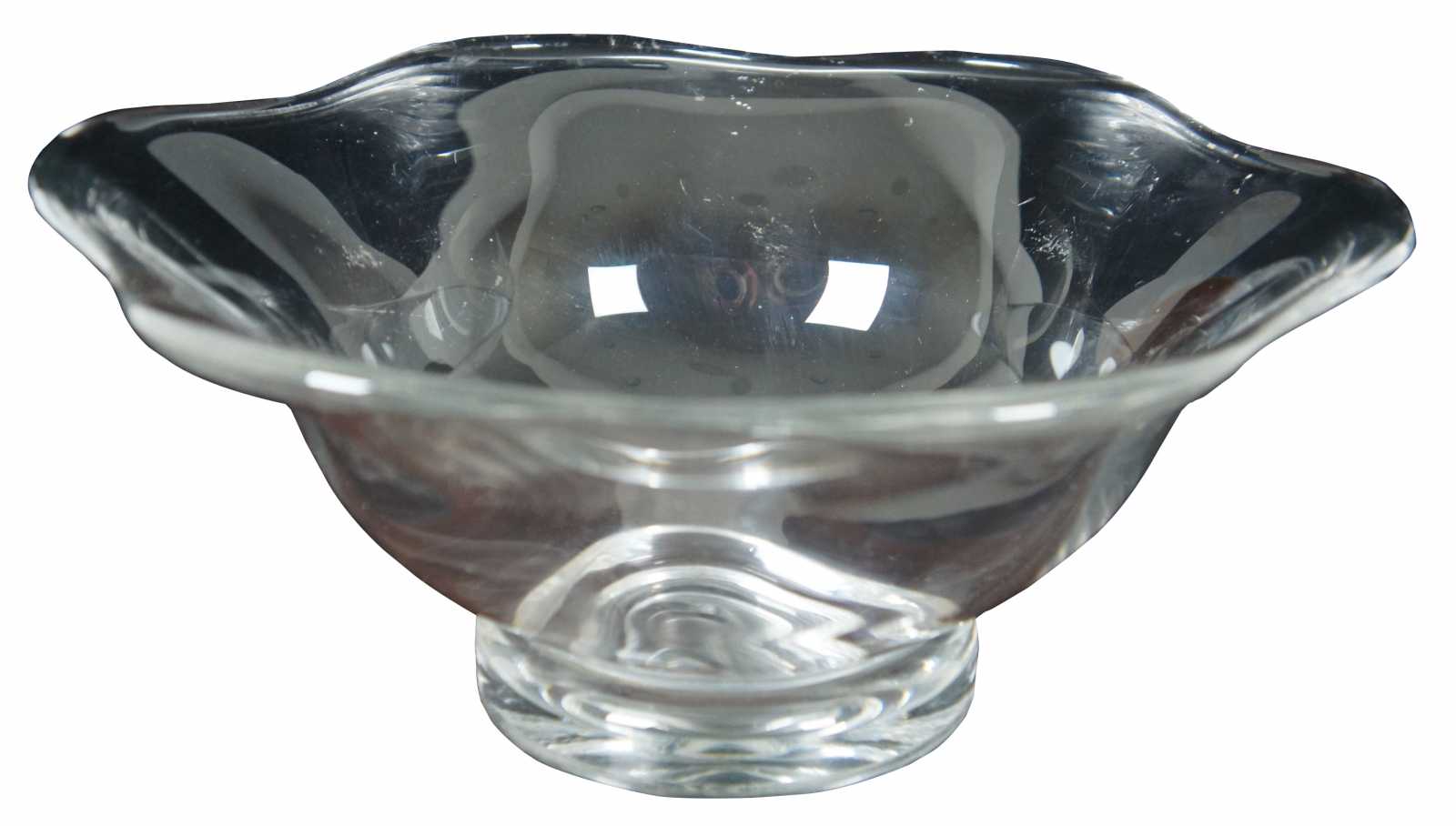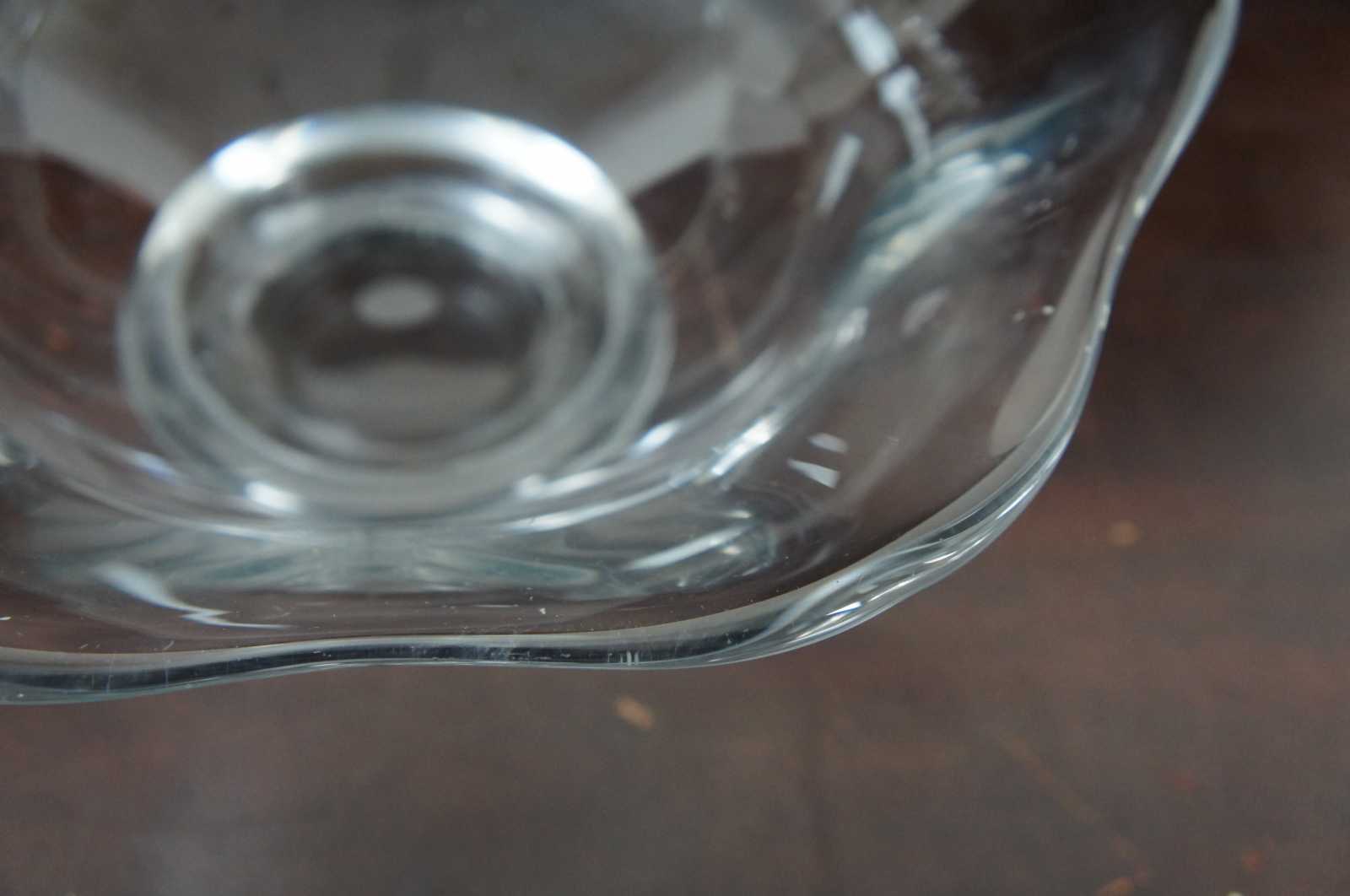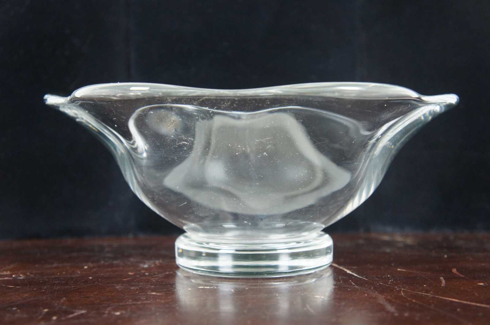 Vintage crystal bowl by Orrefors. Features a flared or ruffled rim / edge and footed base. Signed on base.