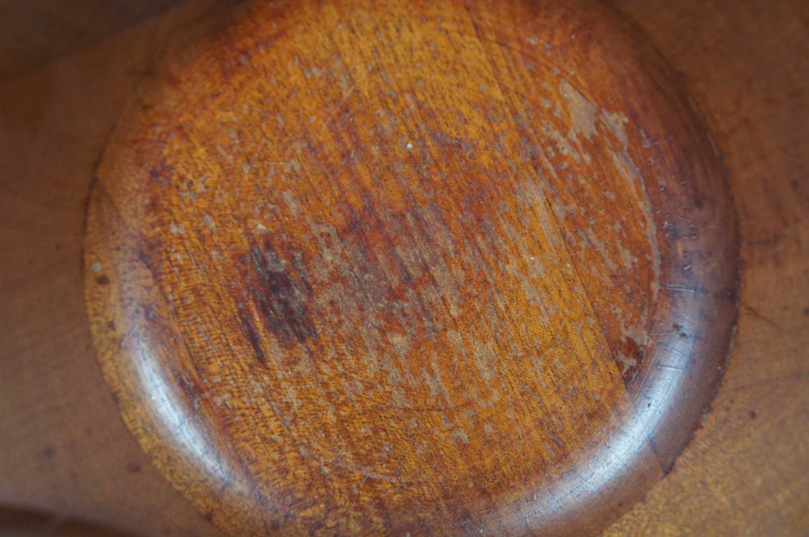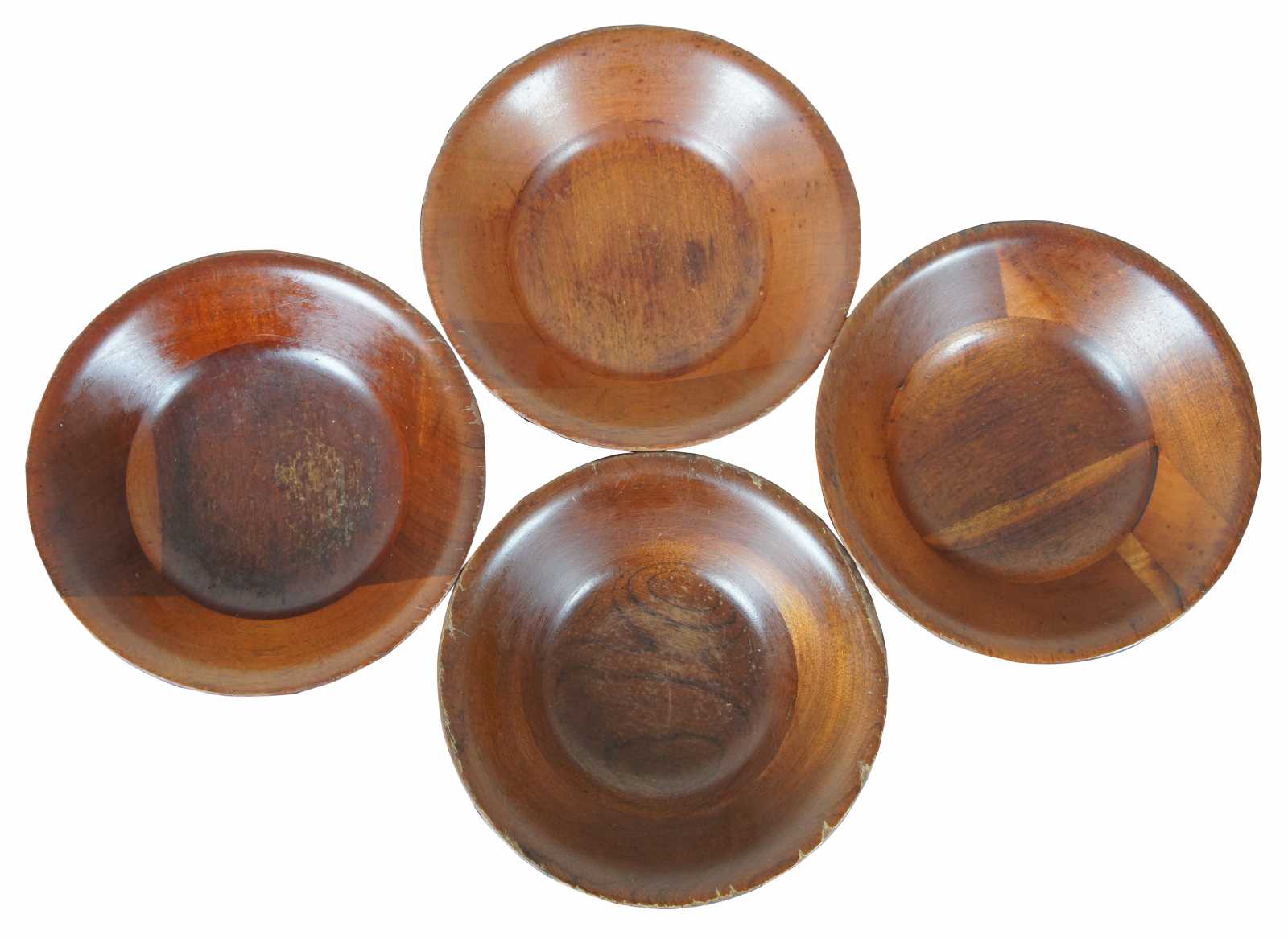 Wooden salad or soup bowls from Japan. Features geometric detail, marked on base.