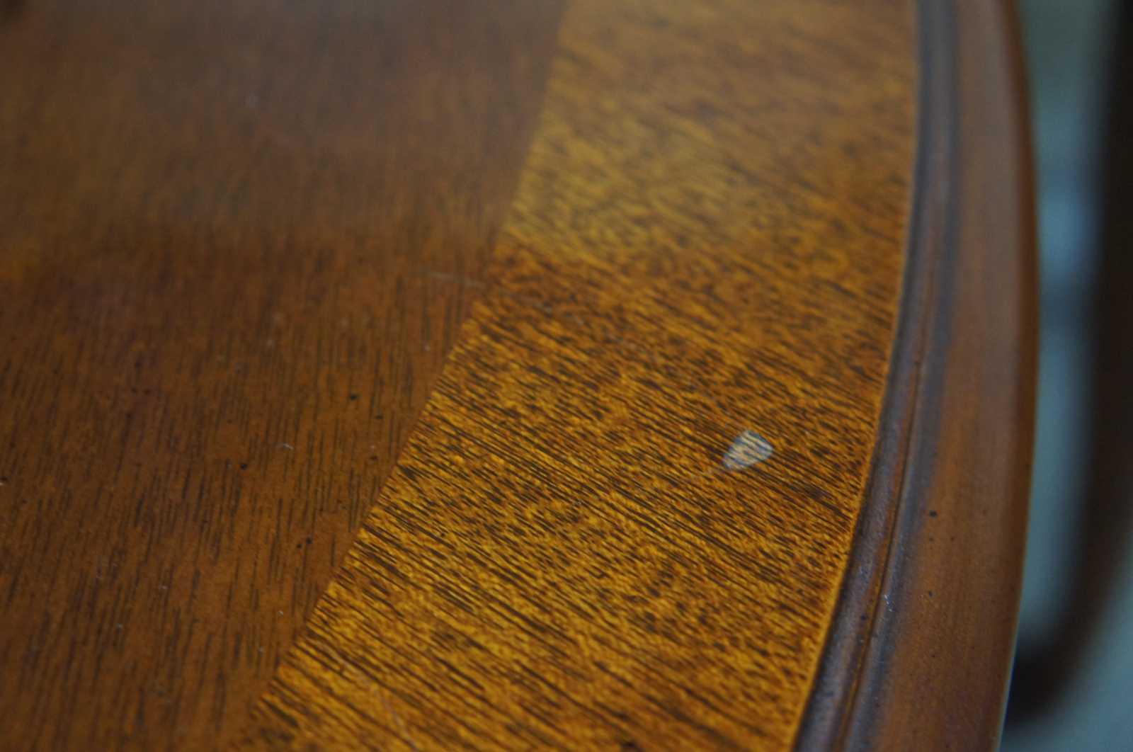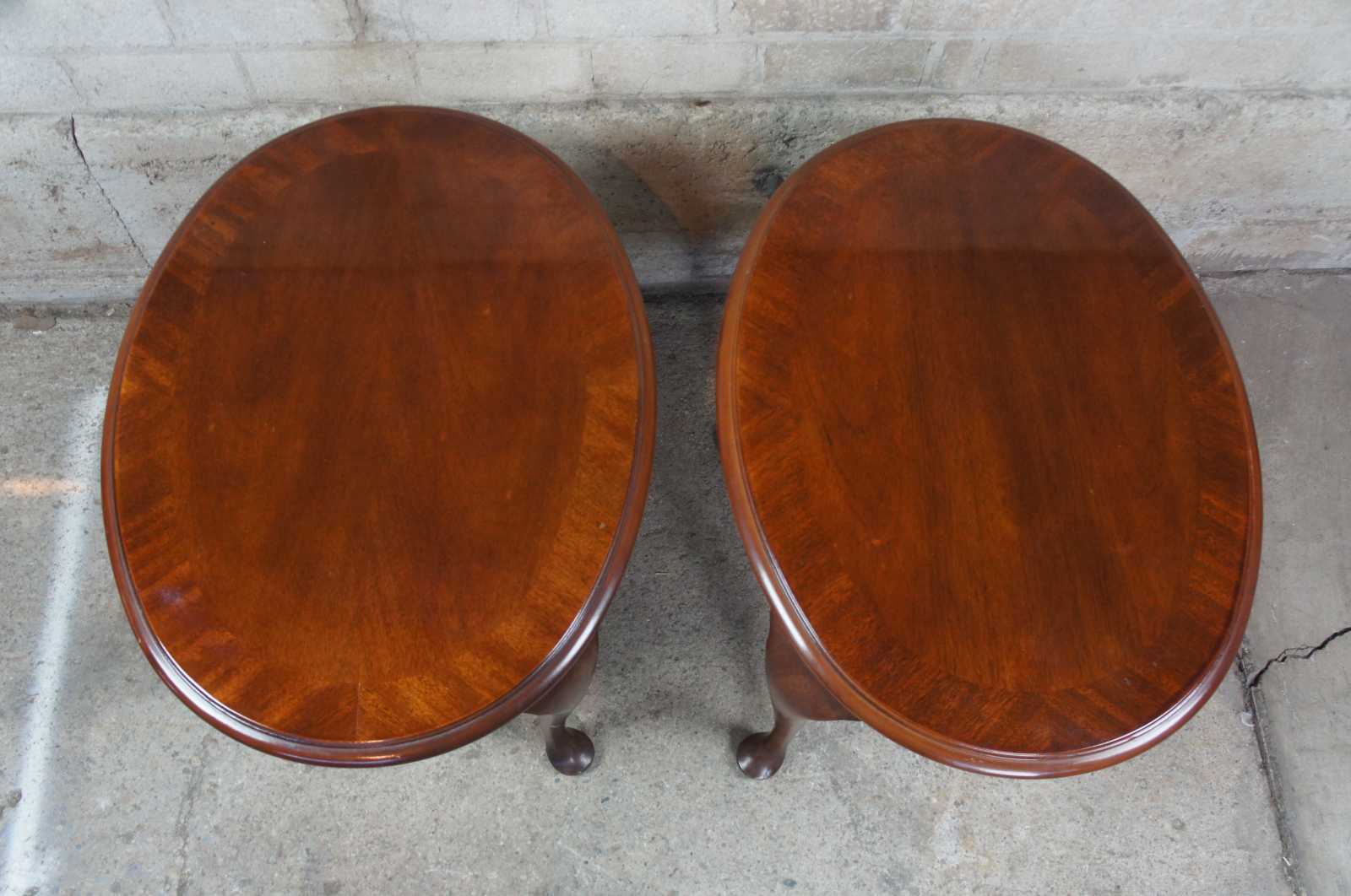 Pair of Drexel 18th Century collection oval side, end or accent tables, #138-306-3, circa 1988. Features a banded top, scalloped apron and cabriole legs leading to pad feet.