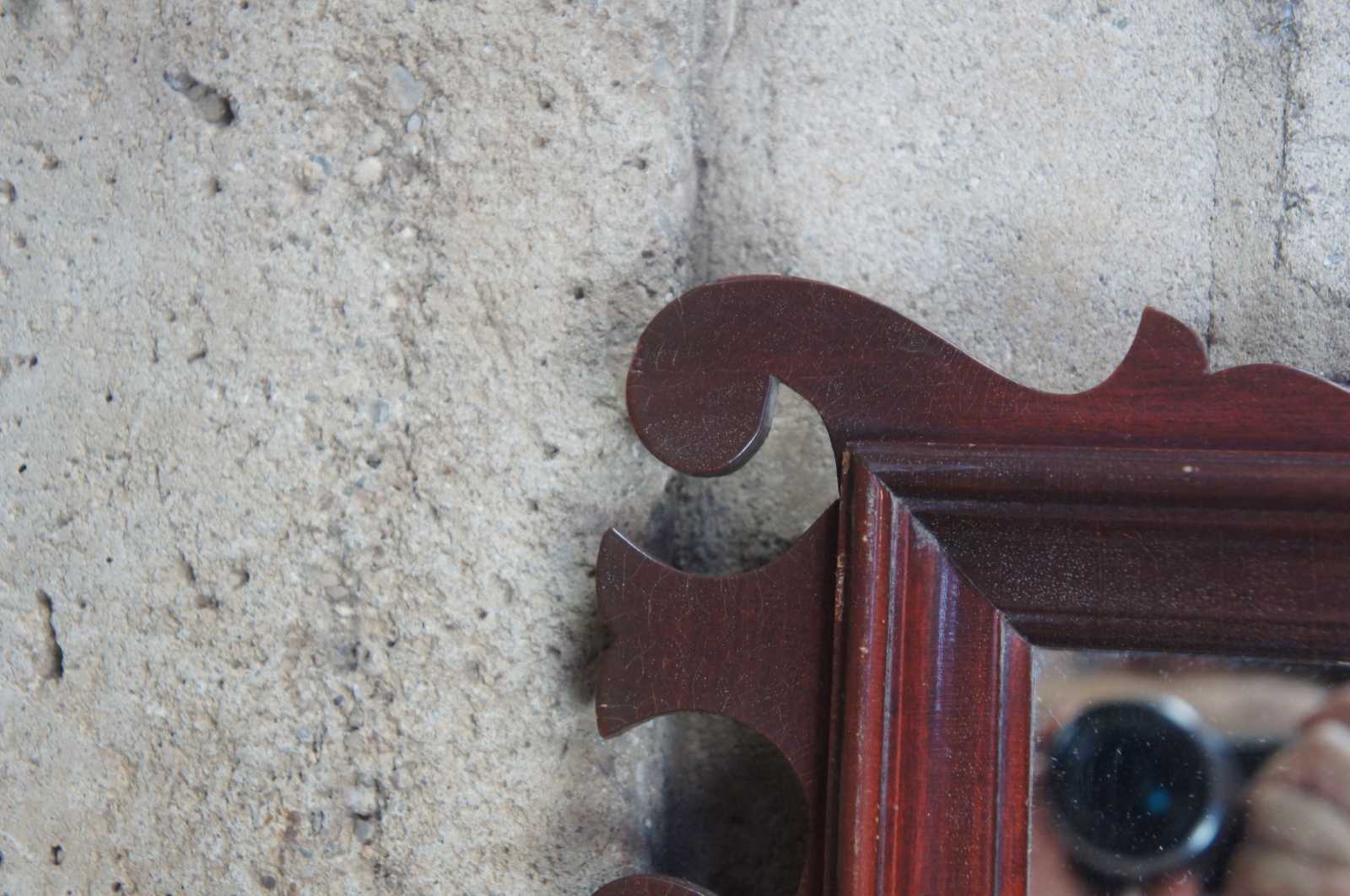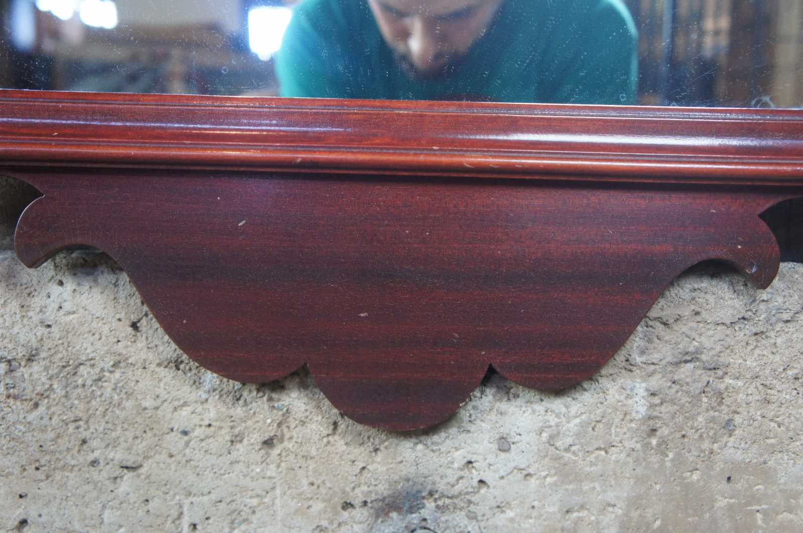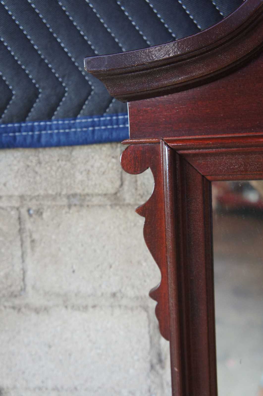 Circa 1950s Federal Style wall mirror. Made from mahogany with scrolled broken pediment and twisted urn finial.