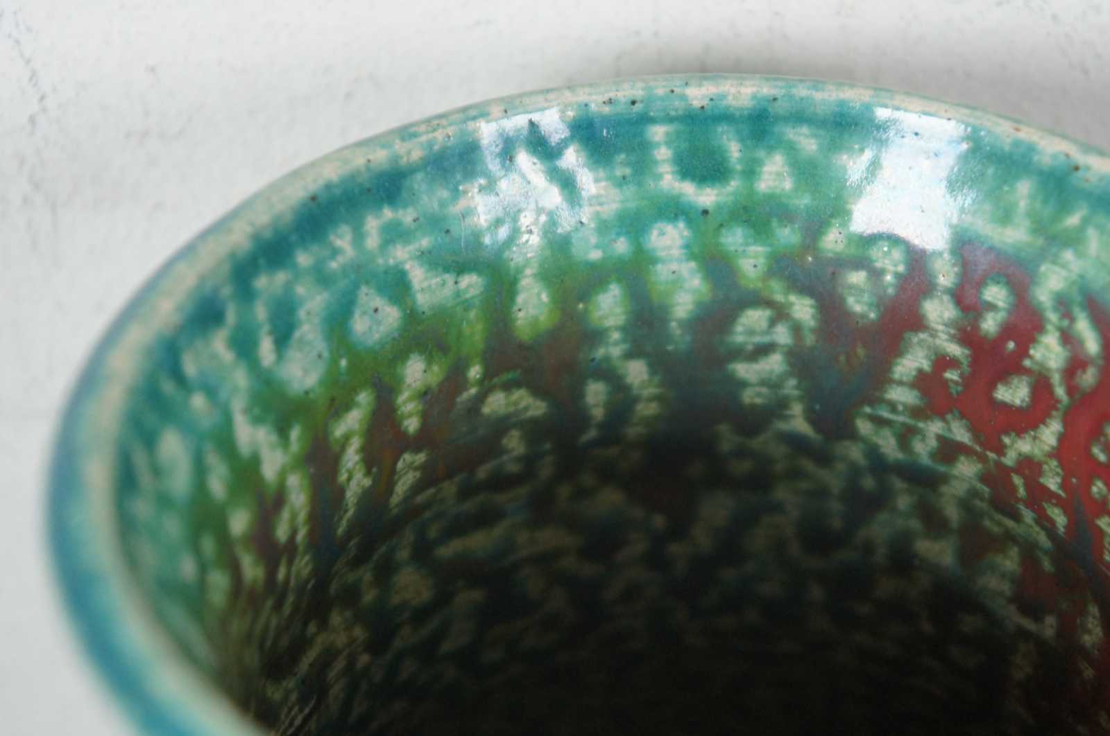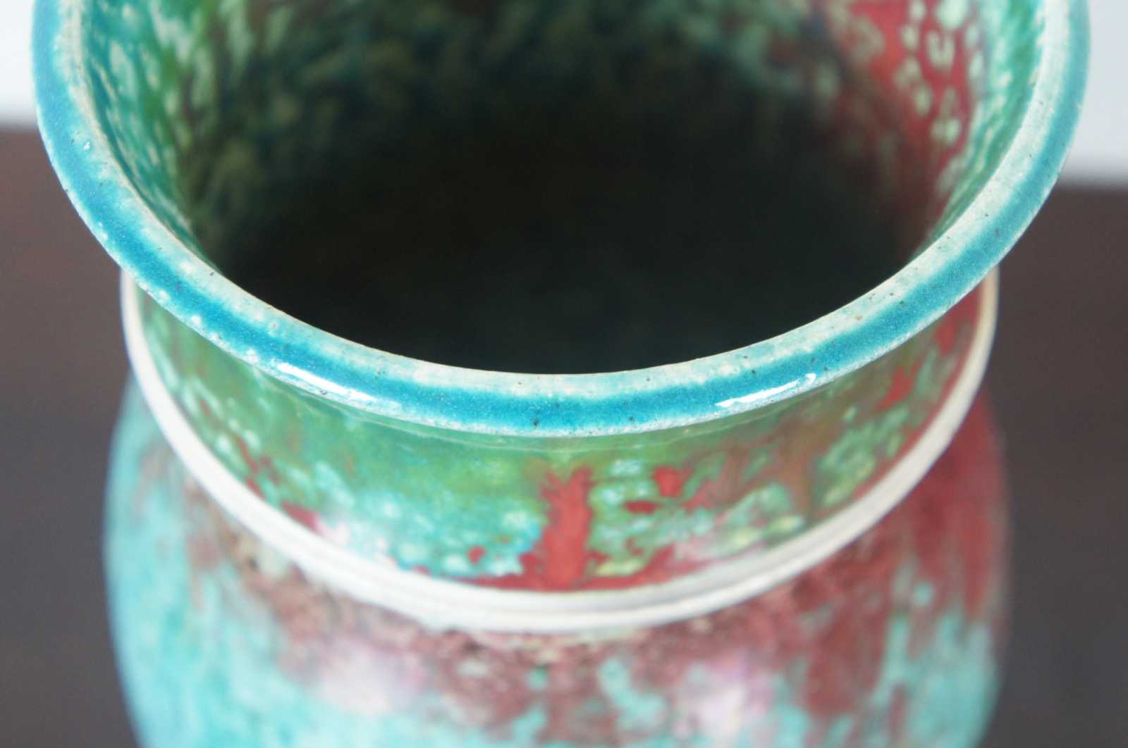 Circa 1991 Stu Wheeler glazed ceramic bud vase. Features a nice multicolor glaze with a band and slightly flaired lip.