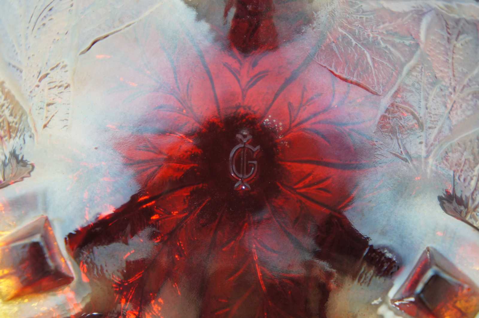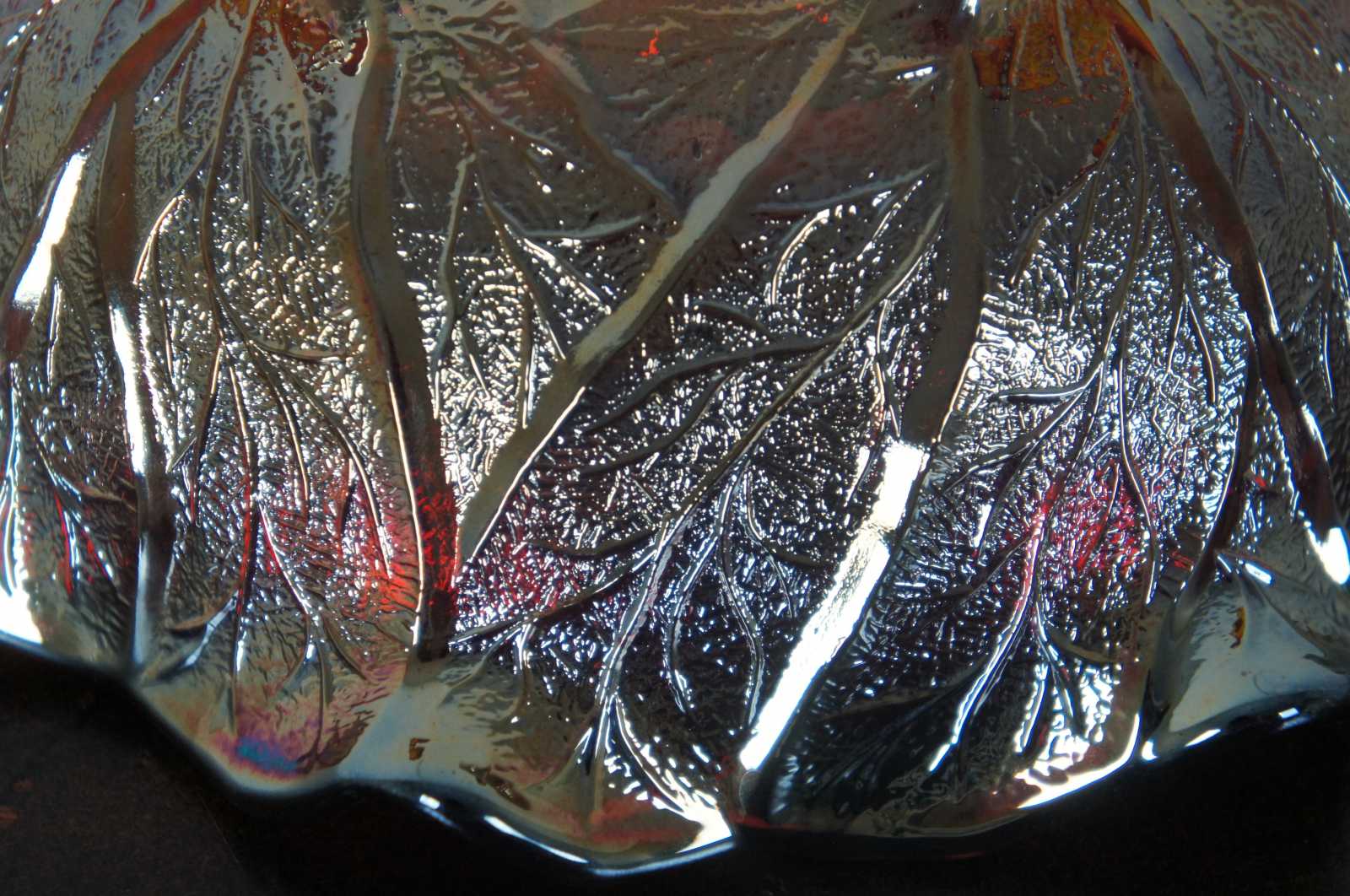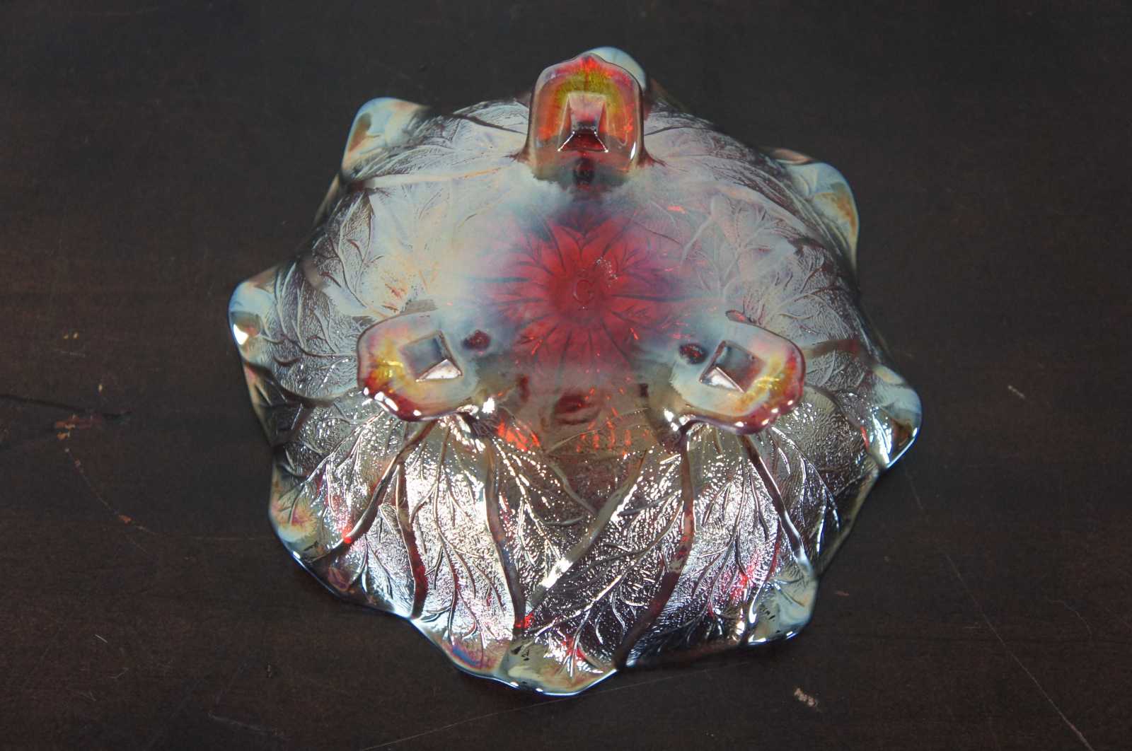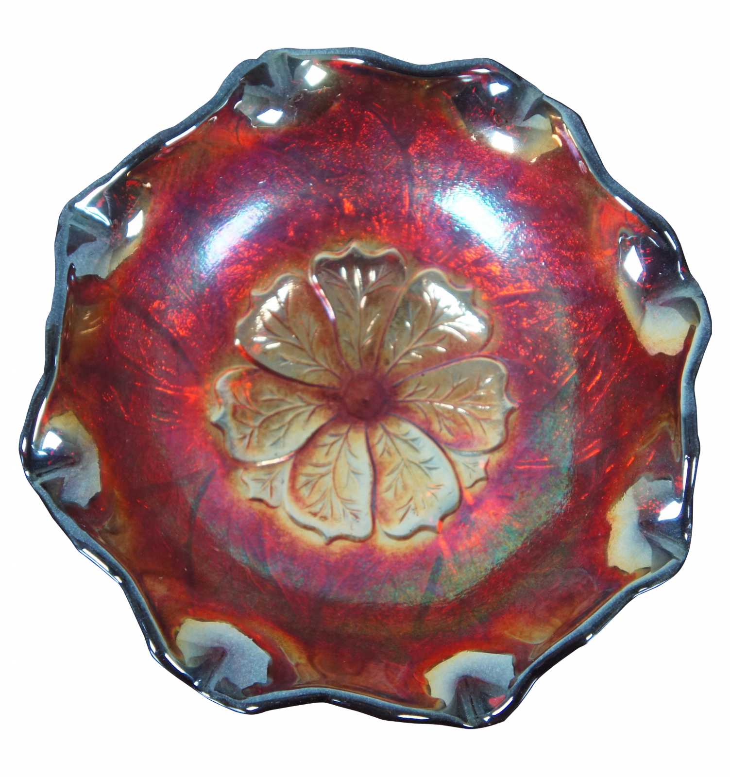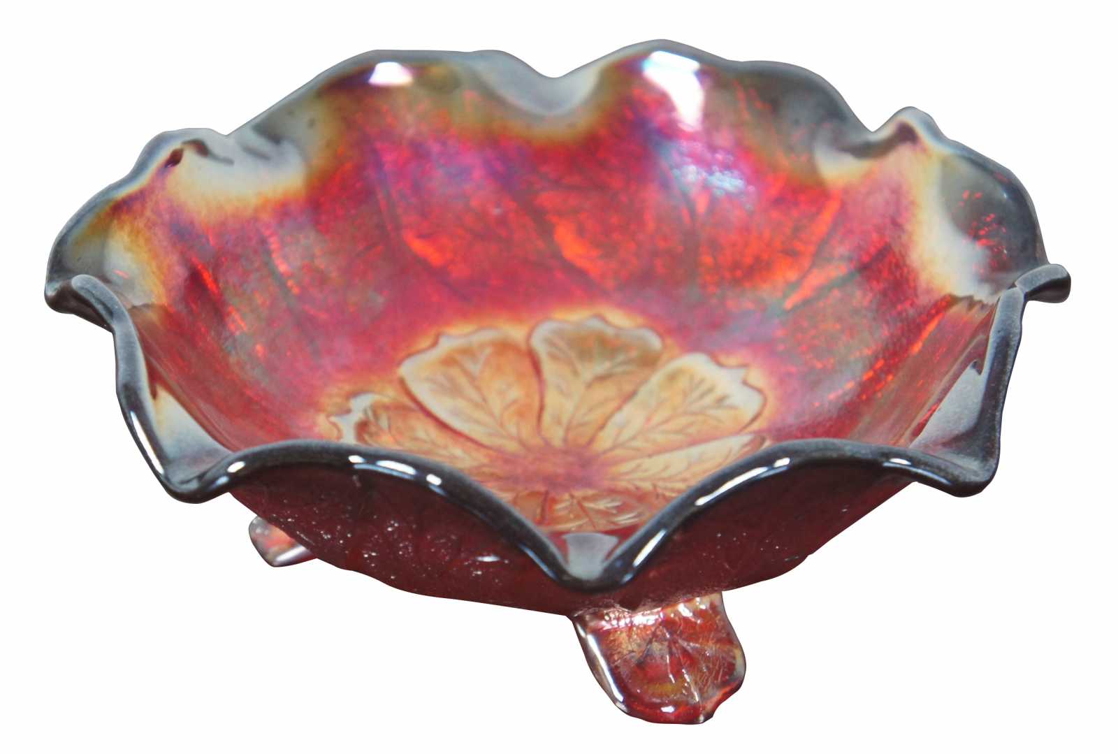 Circa 1950s - 1960s Imperial Glass art glass bowl. Features acanthus leaf exterior with deep red iridescent coloring and ruffled edge with footed base.