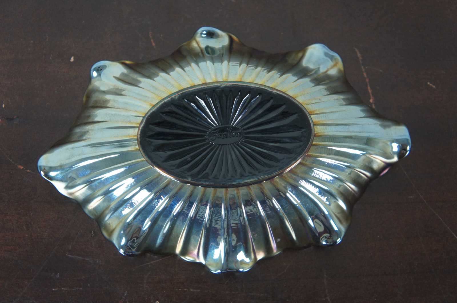 Vintage Fenton iridescent glass dish or bowl. Features multicolor iridescent glas with ruffled edge and footed base. Marked on base.